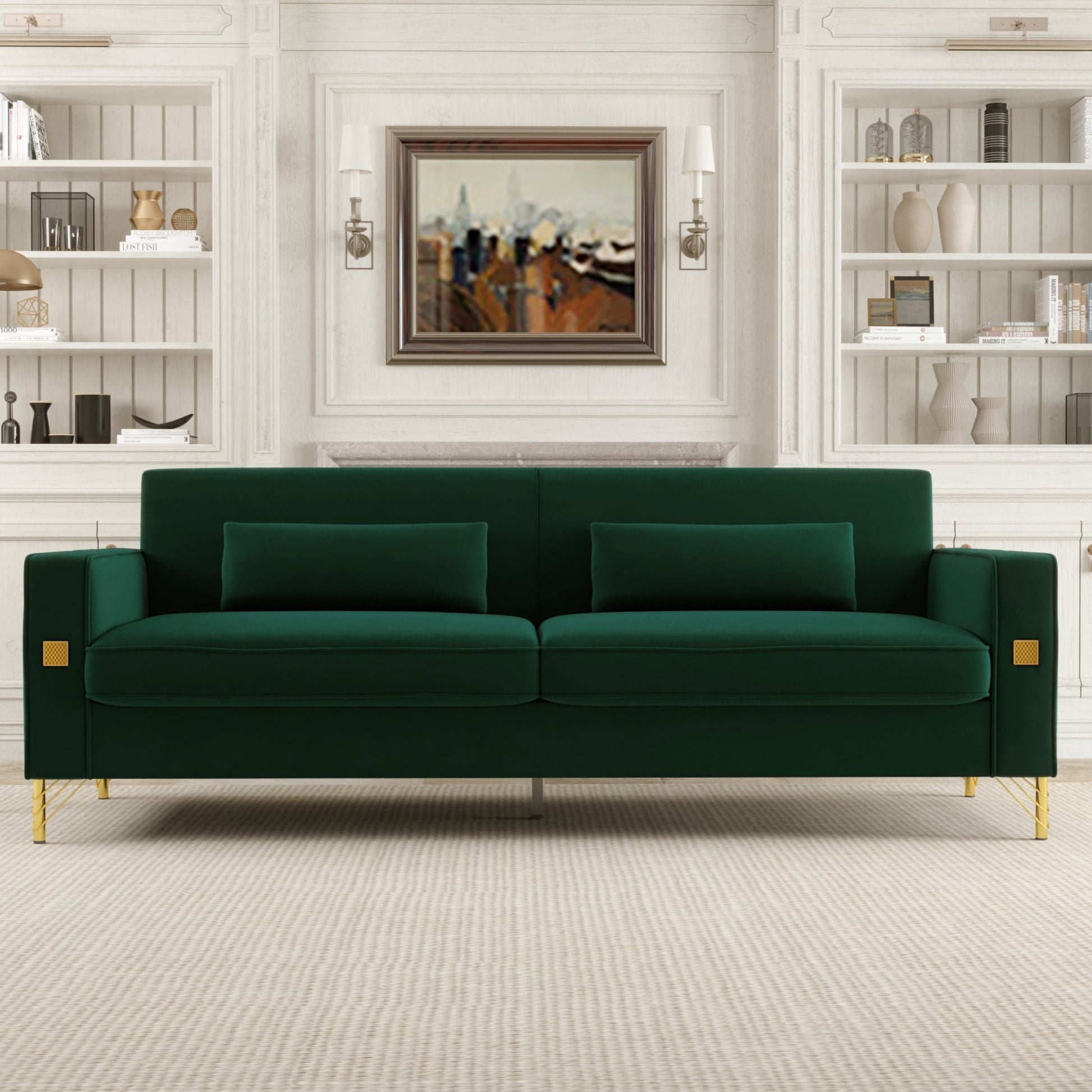 Canapé 3 places en velours vert rétro moderne 85,63 avec touches dorées et coussins moelleux pour le salon