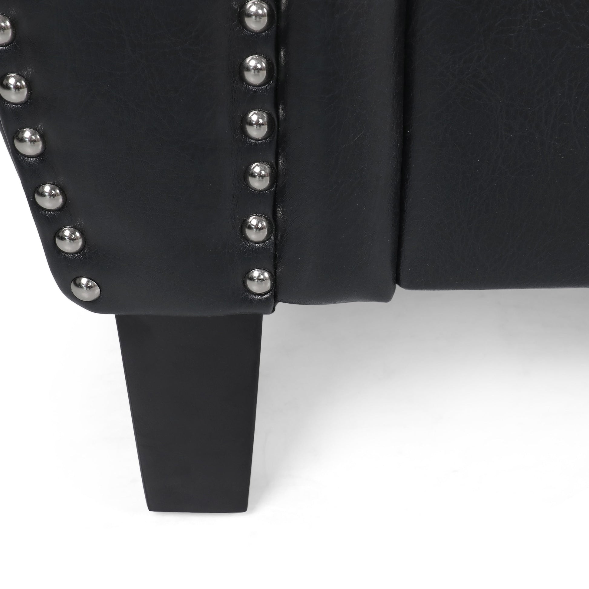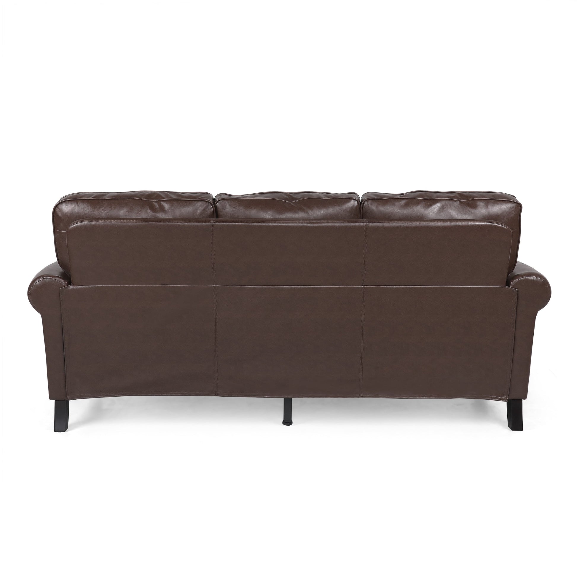 - Élégance contemporaine avec des touches classiques : avec des accoudoirs roulés, une garniture cloutée et un revêtement en similicuir, ce canapé trois places allie une structure moderne à des détails intemporels.