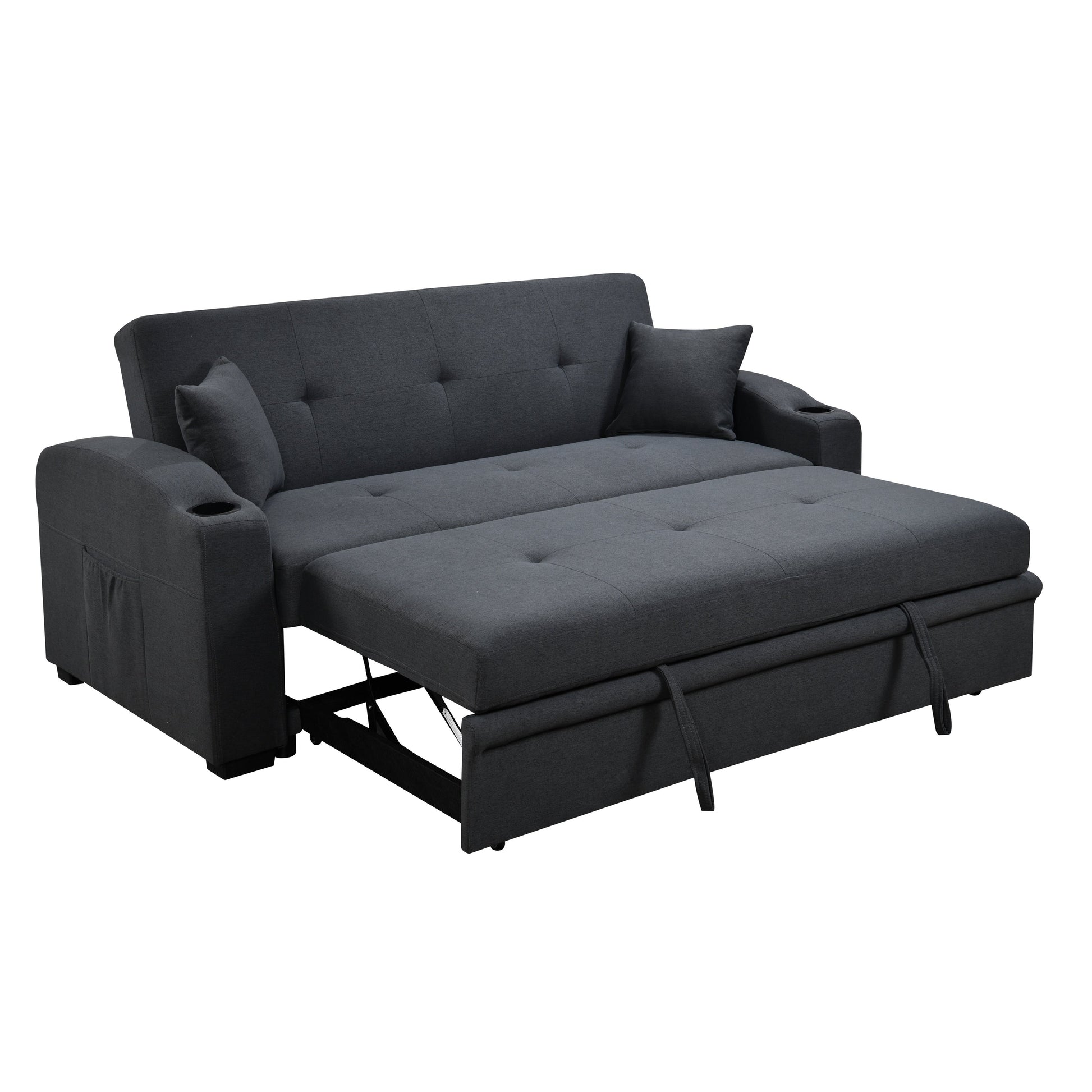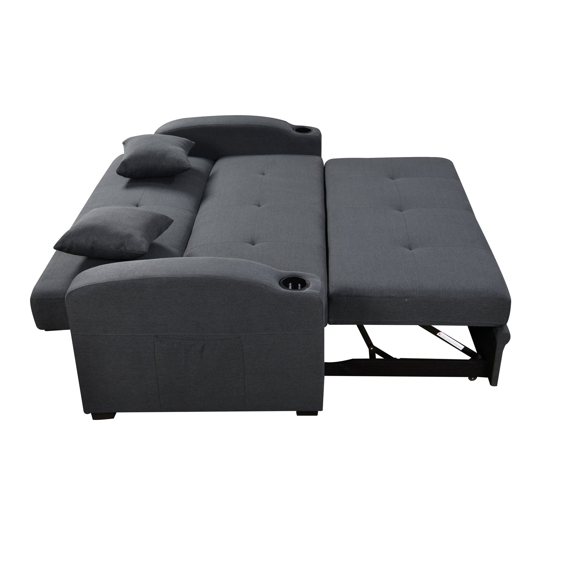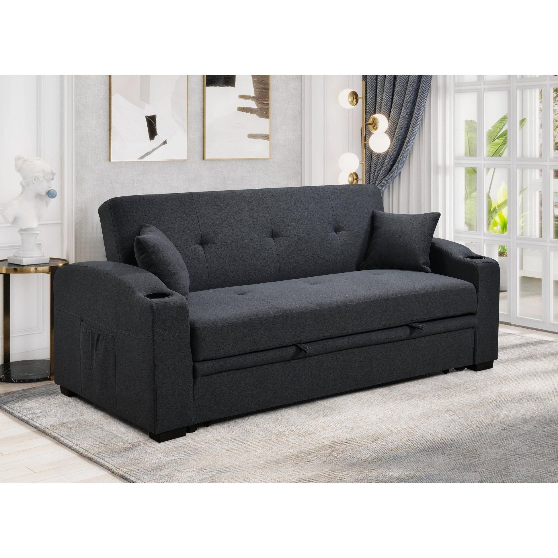 Canapé convertible 3 en 1 Roomfitters de 75 pouces, moderne, avec lit gigogne pratique, dossier inclinable, porte-gobelets et oreillers.