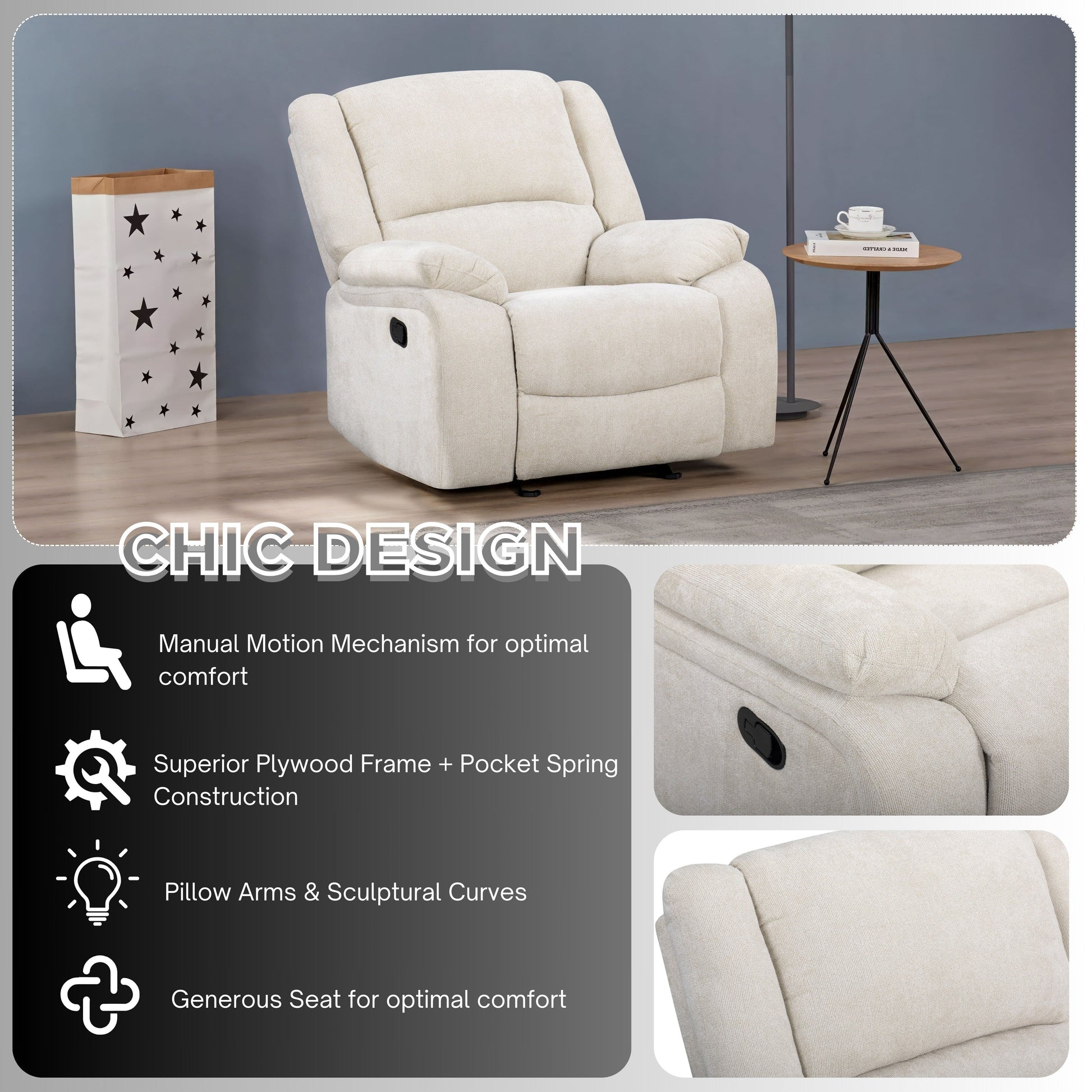 - ➤ [DOSSIER ET ACCOUDOIRS COUSSINÉS] : Ce fauteuil inclinable présente un dossier rembourré, conçu pour un confort optimal, qui complète ses lignes douces et sculpturales. Les élégants accoudoirs coussinés offrent un soutien aérien et ajoutent une touche d'élégance à l'ensemble, ce qui en fait un ajout intemporel à tout espace de vie.