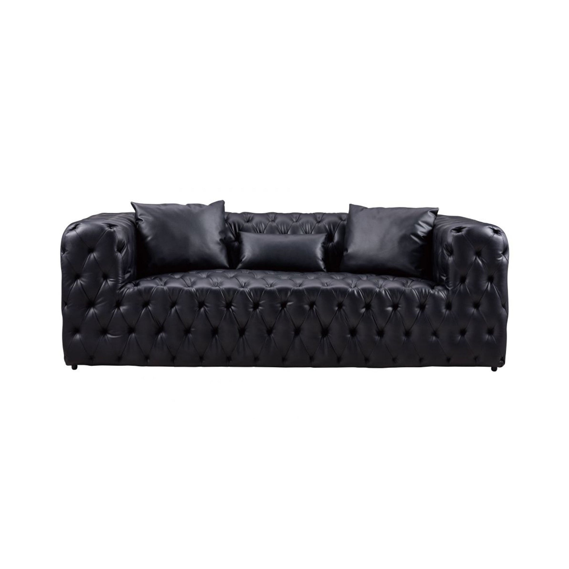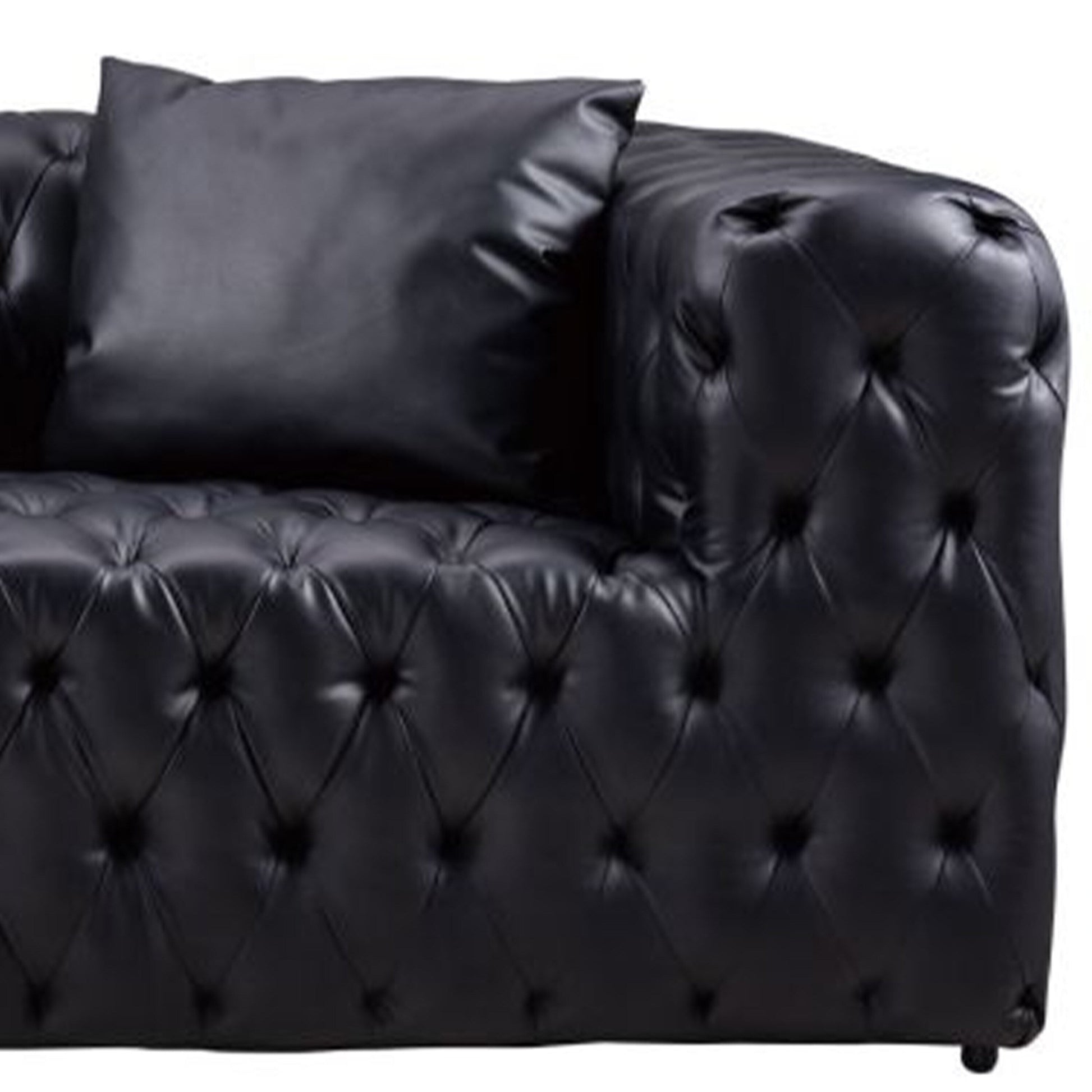 Canapé Sam, similicuir capitonné noir, coussins décoratifs, Chesterfield, 213 cm