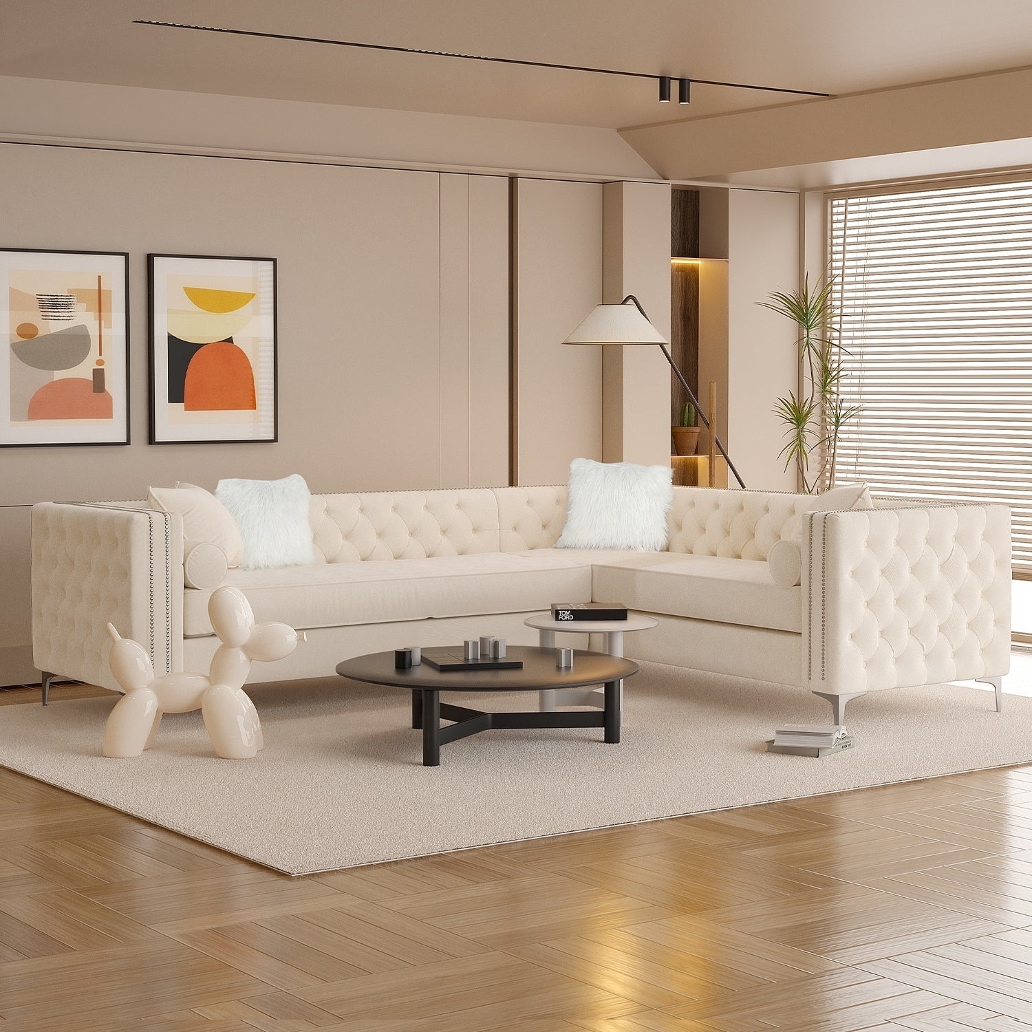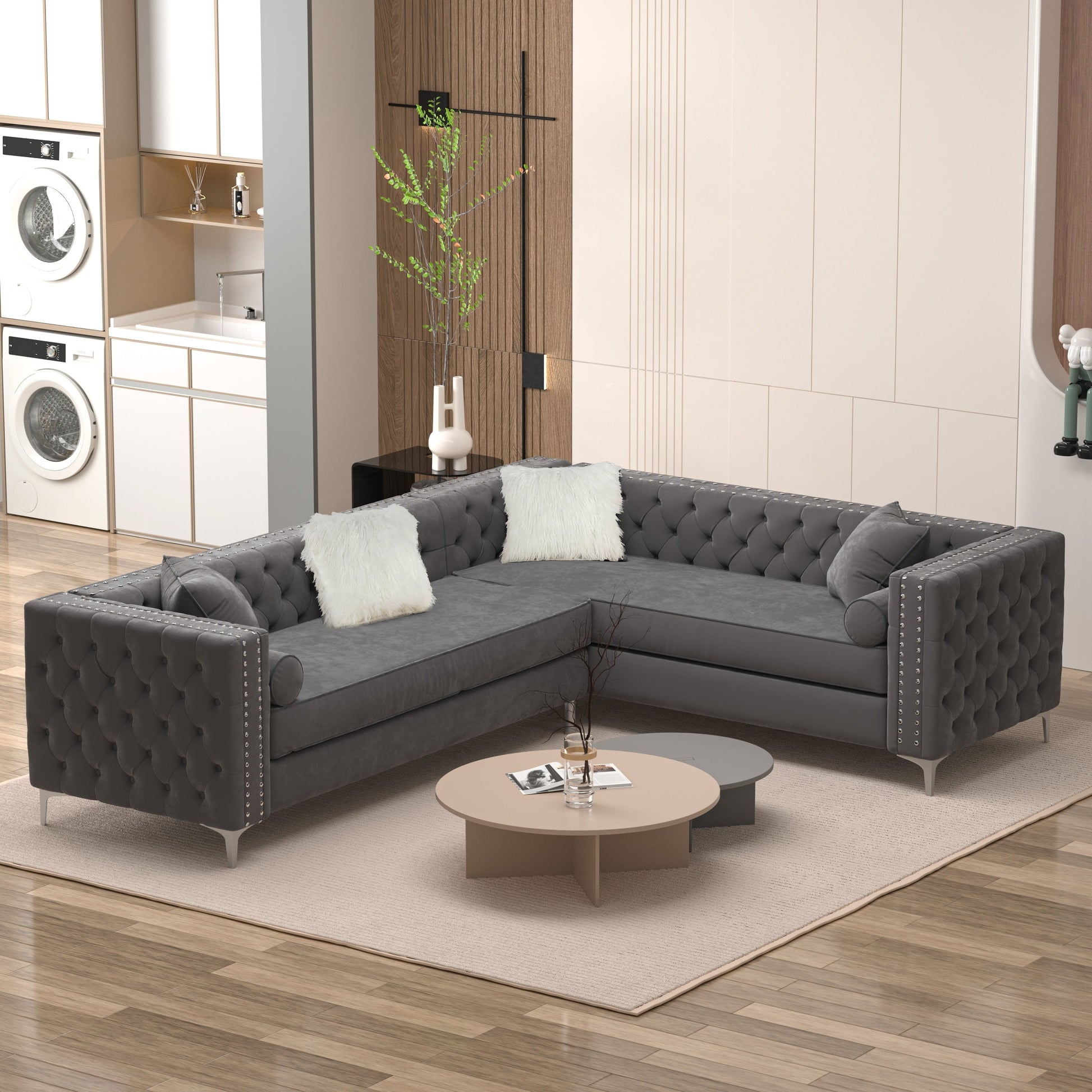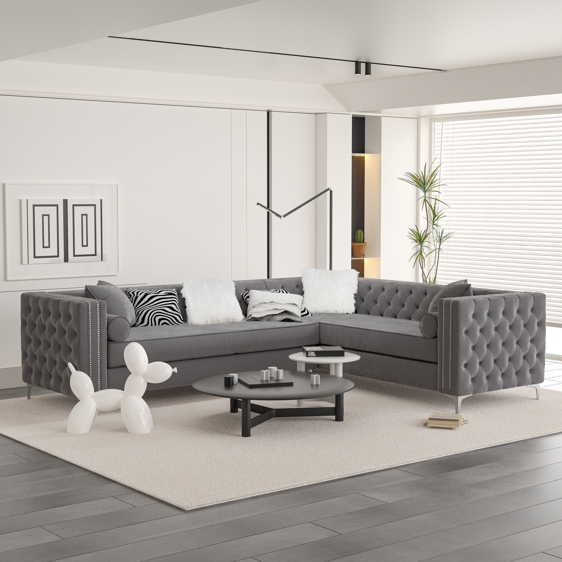 Un velours riche est capitonné à l'intérieur comme à l'extérieur de la structure, un détail de design élégant visible sous tous les angles. Des coussins simples permettent d'accueillir confortablement plusieurs personnes sans séparation. Ce canapé d'angle est rehaussé de deux rangées de clous décoratifs nickelés qui s'harmonisent à merveille. Il s'intègre aussi bien aux intérieurs traditionnels que contemporains. Confort et style sont au rendez-vous dans ce canapé dynamique. Ce canapé d'angle est doté d'un velours capitonné aux teintes riches, rehaussé de clous décoratifs argentés contrastants qui mettent en valeur des accoudoirs carrés épurés, d'un rembourrage en mousse haute densité, de coussins amovibles et de solides pieds en Y en métal chromé argenté assorti. Avec ce canapé d'angle, le traditionnel rencontre le moderne pour un résultat tout simplement spectaculaire.