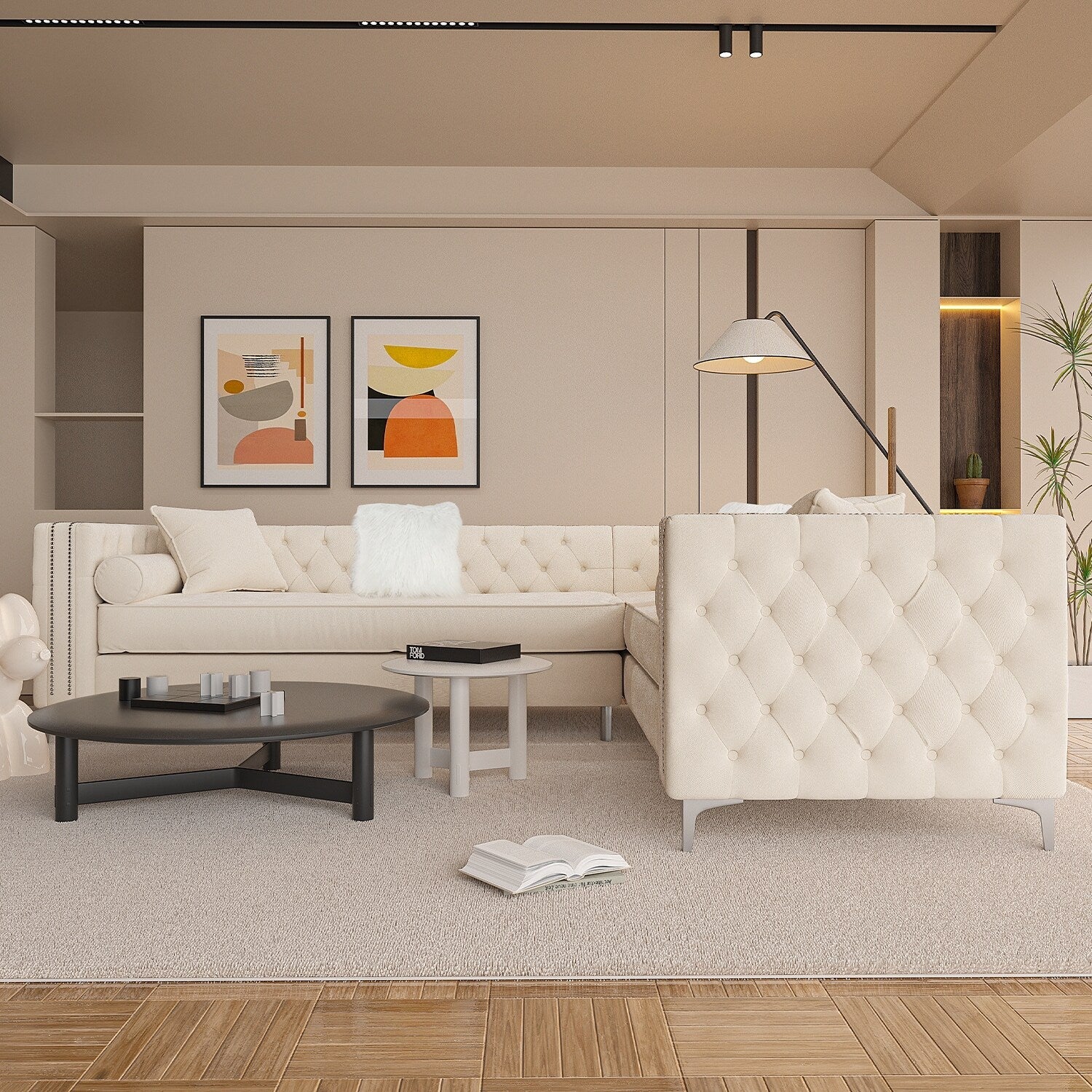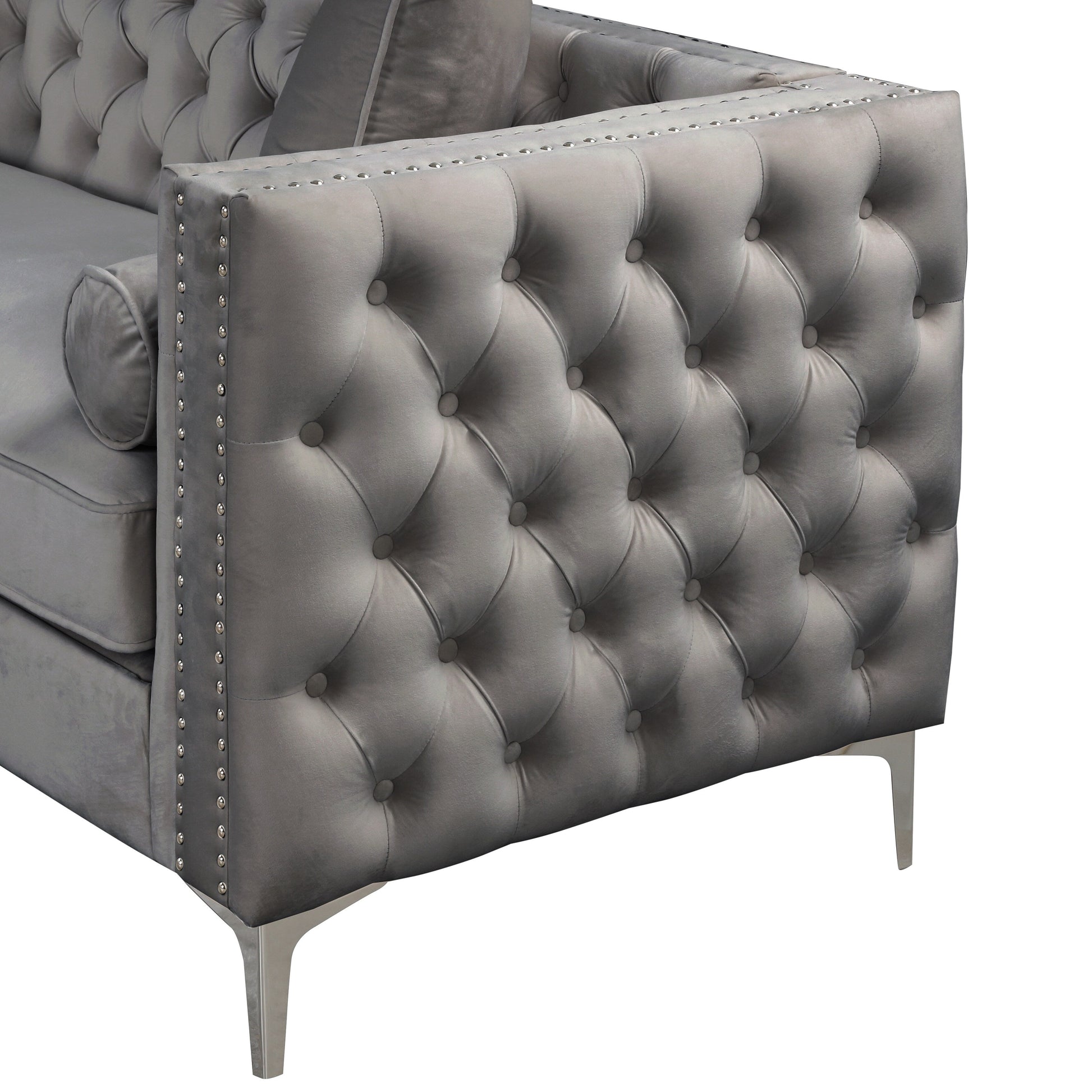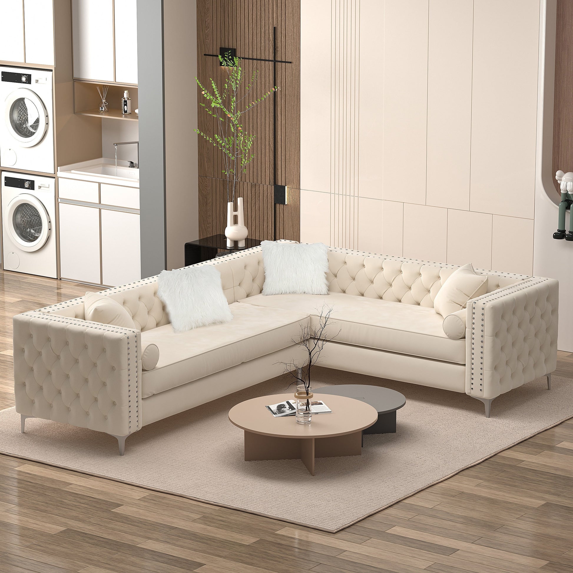 Un velours riche est capitonné à l'intérieur comme à l'extérieur de la structure, un détail de design élégant visible sous tous les angles. Des coussins simples permettent d'accueillir confortablement plusieurs personnes sans séparation. Ce canapé d'angle est rehaussé de deux rangées de clous décoratifs nickelés qui s'harmonisent à merveille. Il s'intègre aussi bien aux intérieurs traditionnels que contemporains. Confort et style sont au rendez-vous dans ce canapé dynamique. Ce canapé d'angle est doté d'un velours capitonné aux teintes riches, rehaussé de clous décoratifs argentés contrastants qui mettent en valeur des accoudoirs carrés épurés, d'un rembourrage en mousse haute densité, de coussins amovibles et de solides pieds en Y en métal chromé argenté assorti. Avec ce canapé d'angle, le traditionnel rencontre le moderne pour un résultat tout simplement spectaculaire.