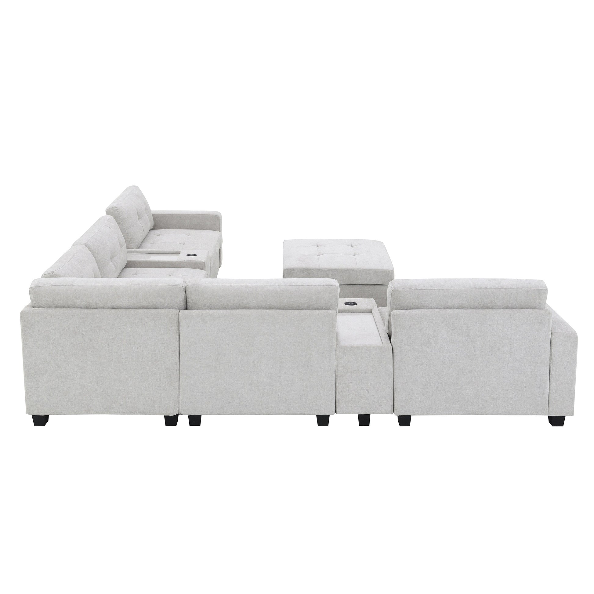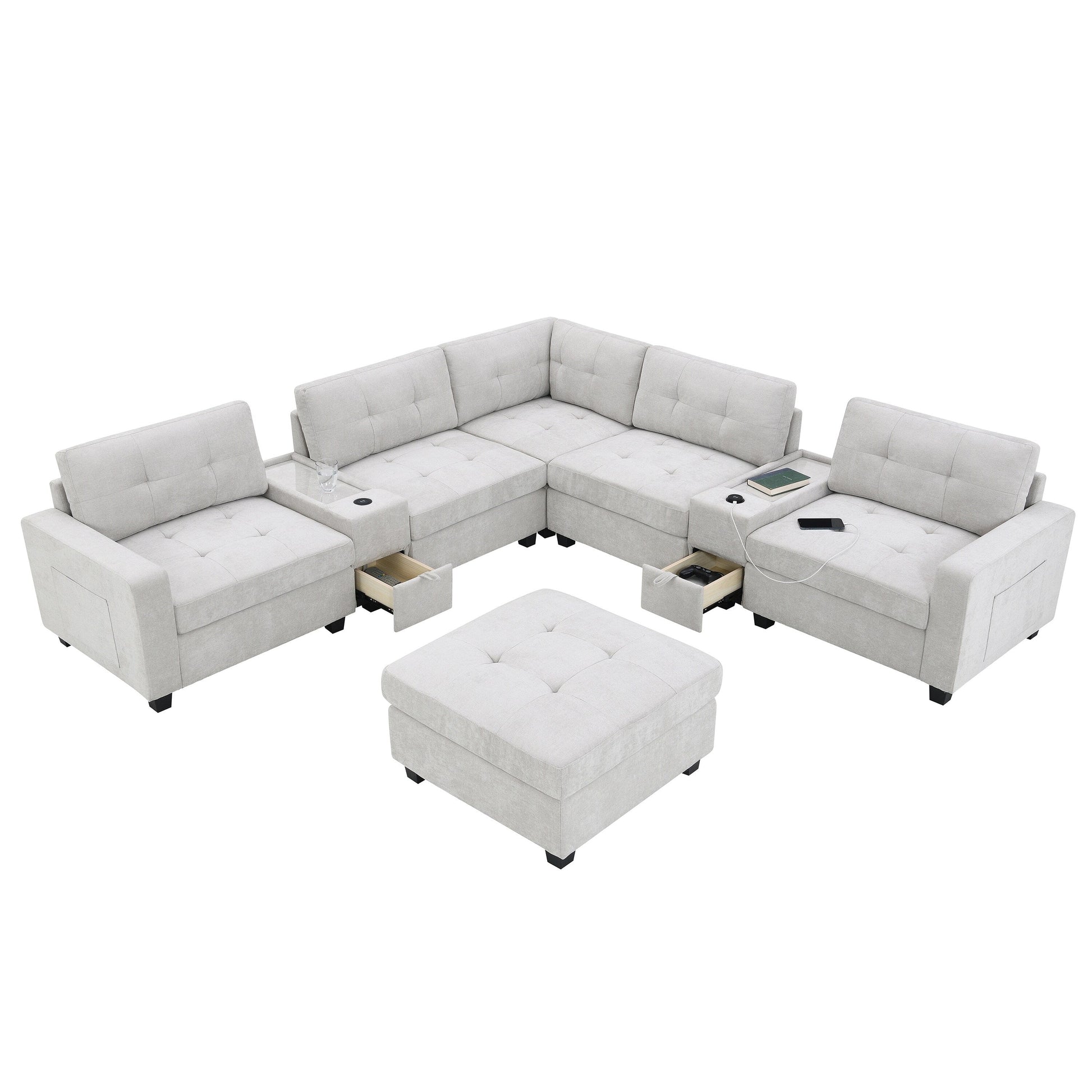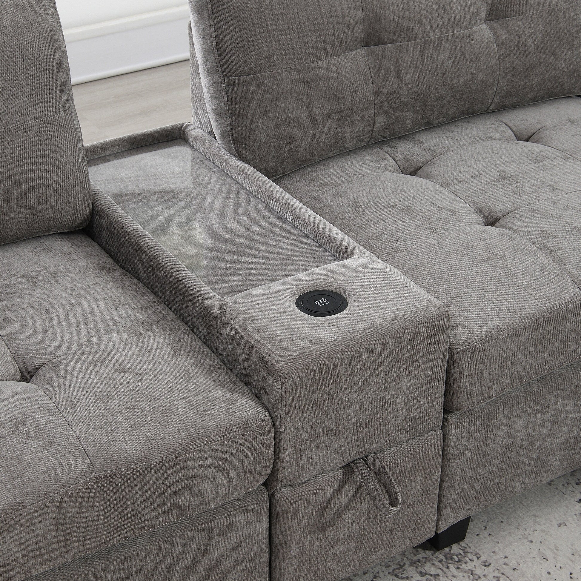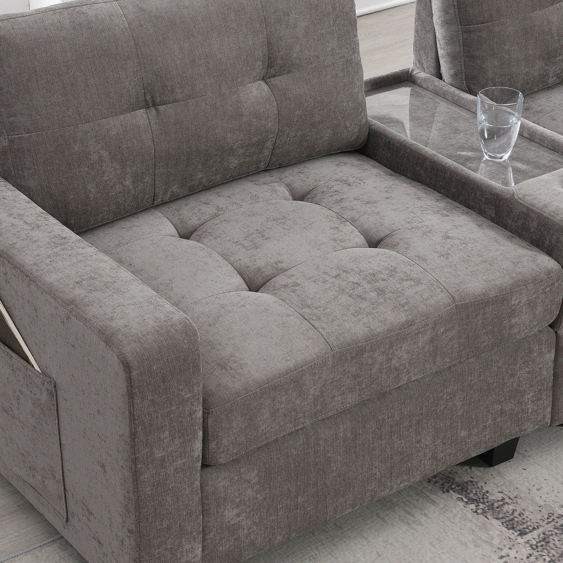 Canapé sectionnel avec plateau de table, ensemble de canapé en U en chenille avec 2 consoles, chargeur USB, tiroirs et poches de rangement, pouf