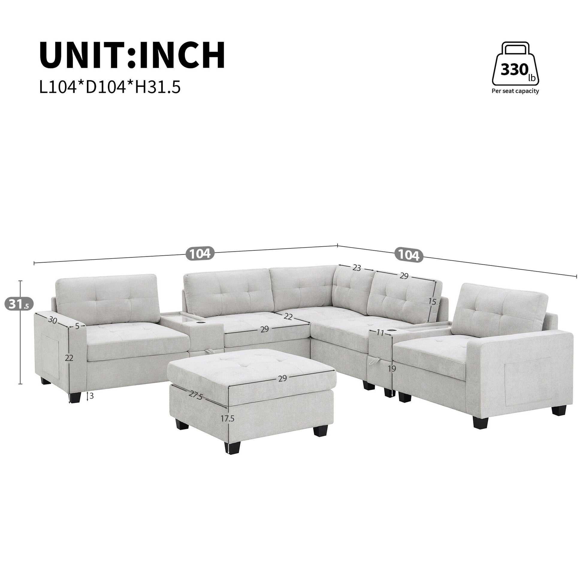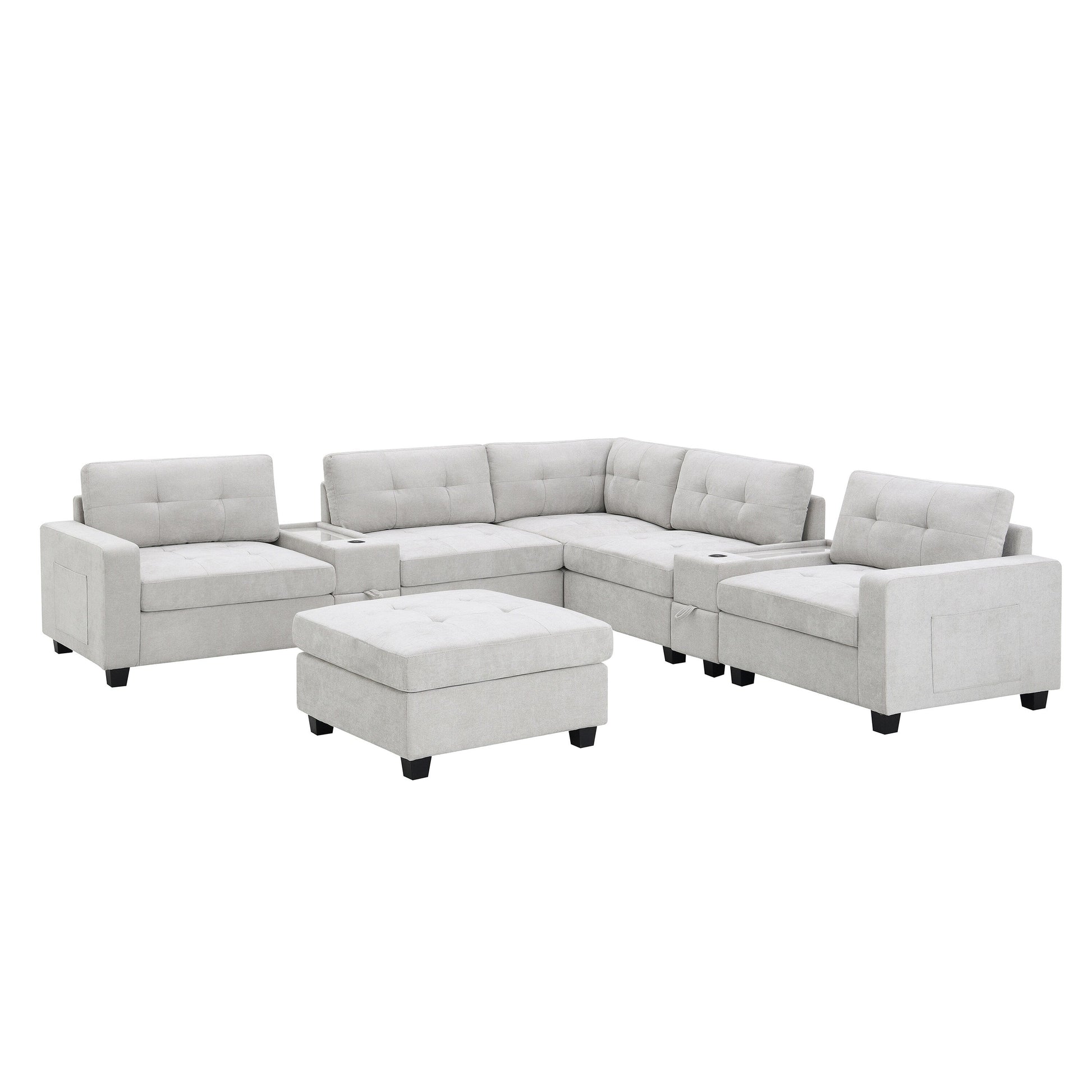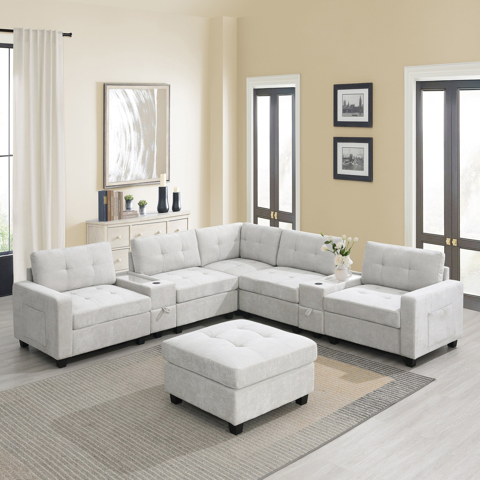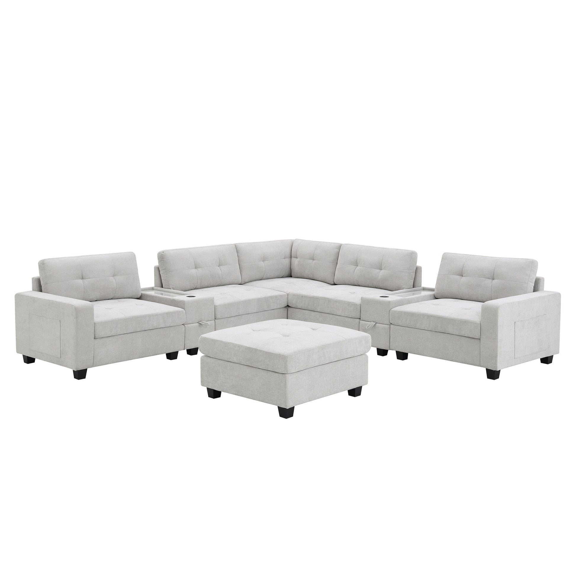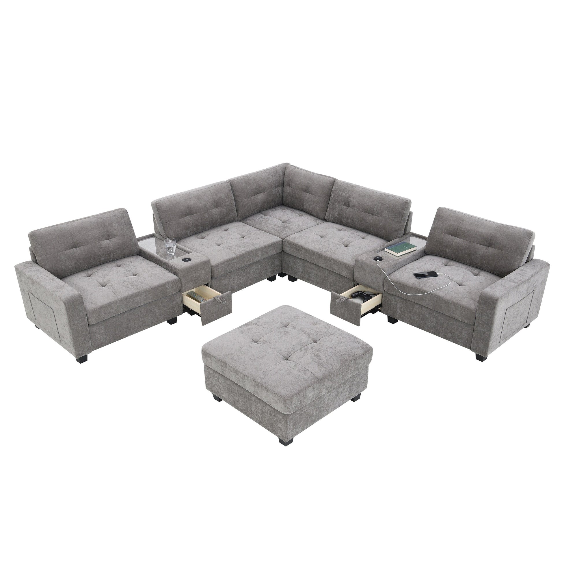 Canapé sectionnel avec plateau de table, ensemble de canapé en U en chenille avec 2 consoles, chargeur USB, tiroirs et poches de rangement, pouf