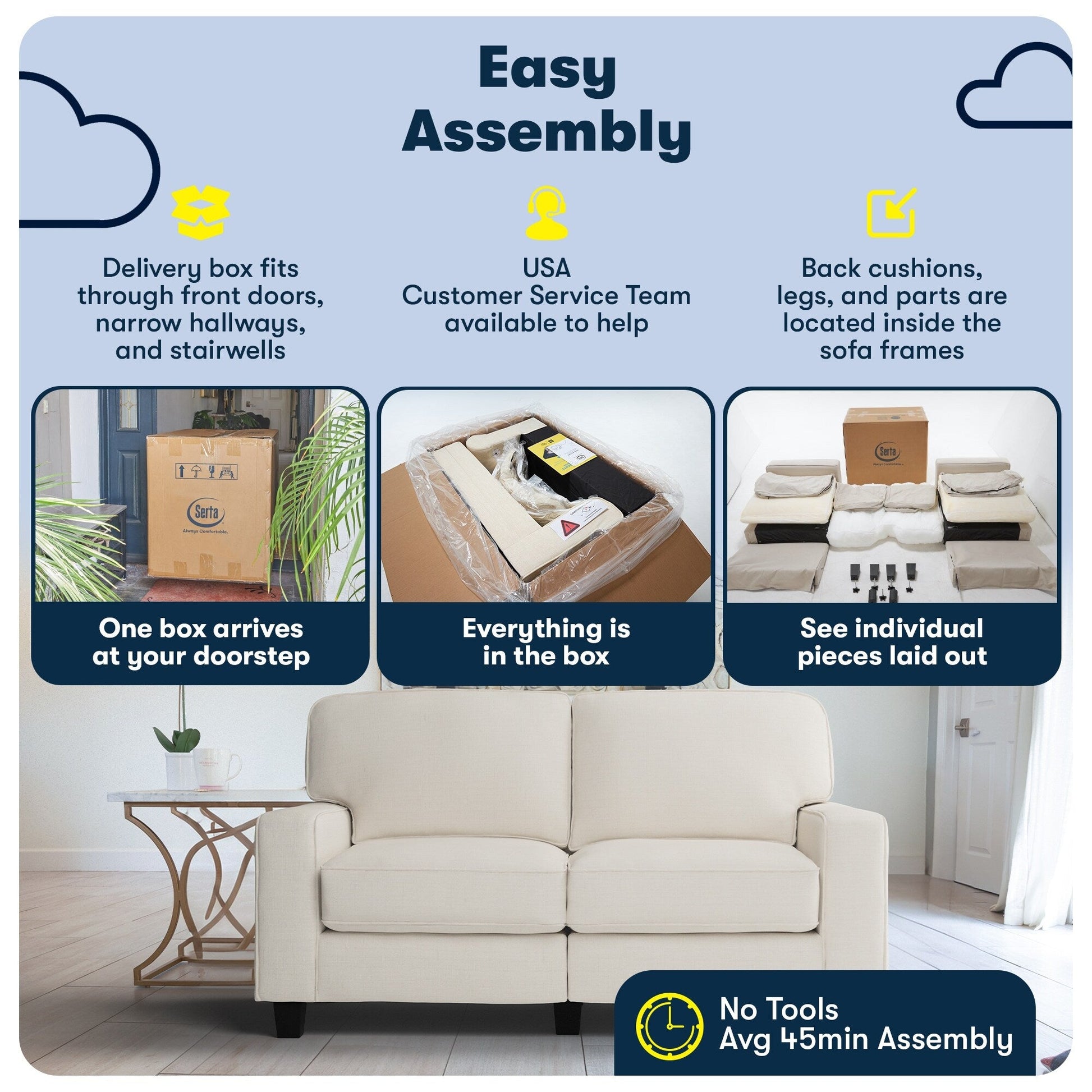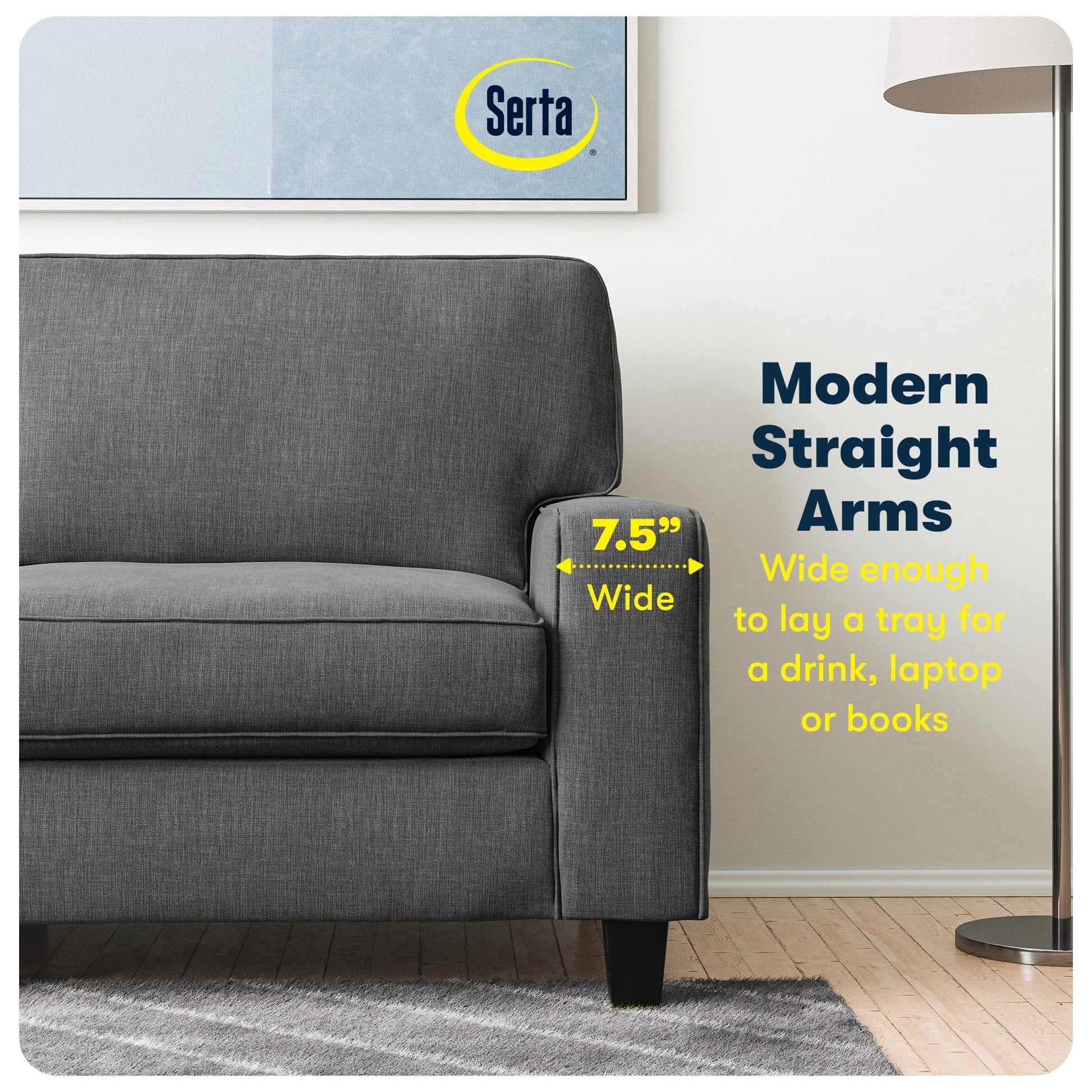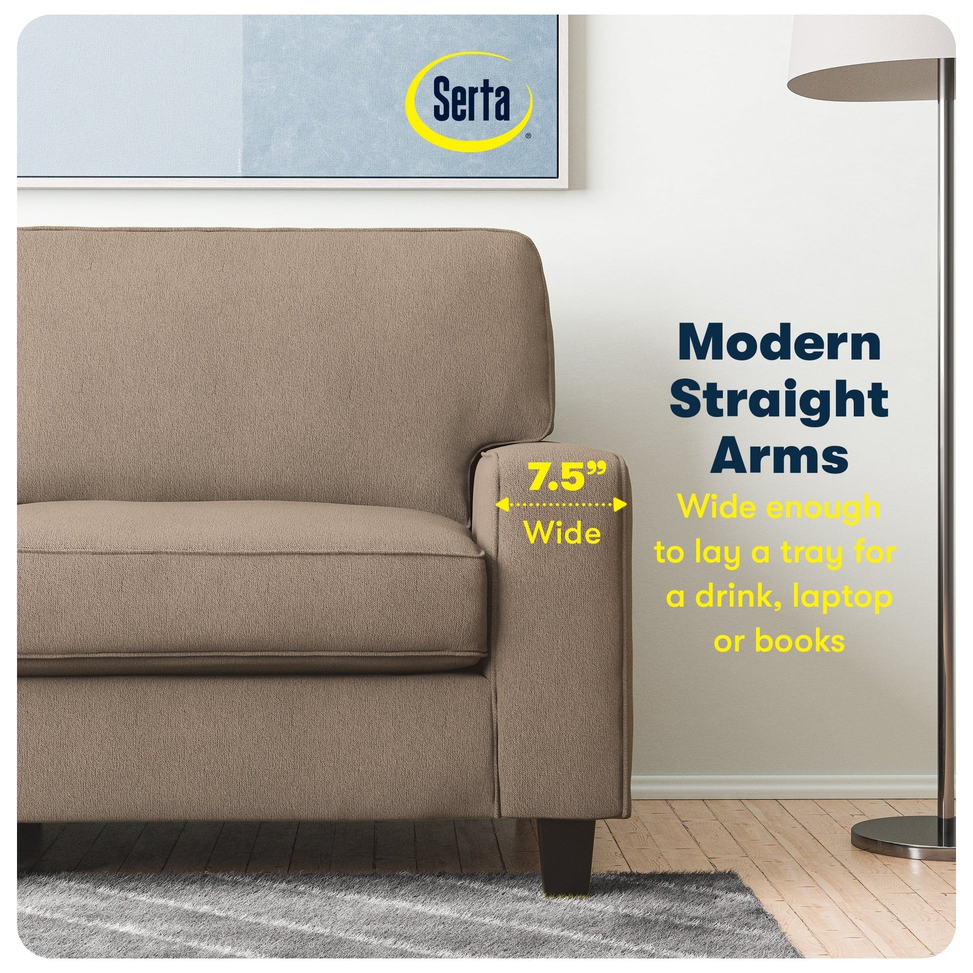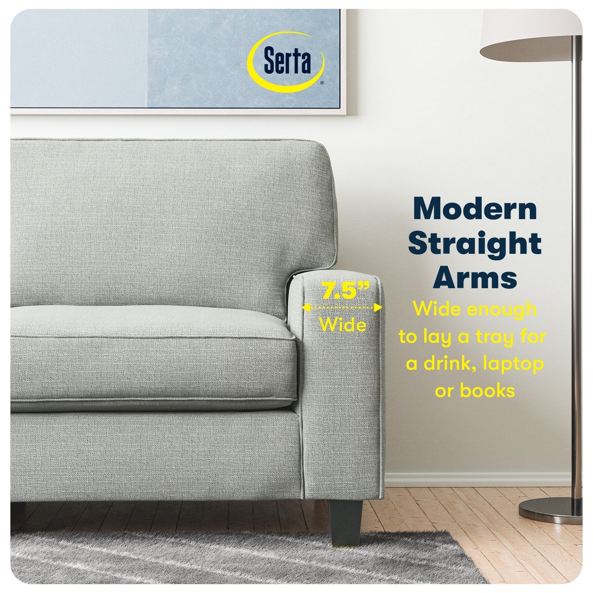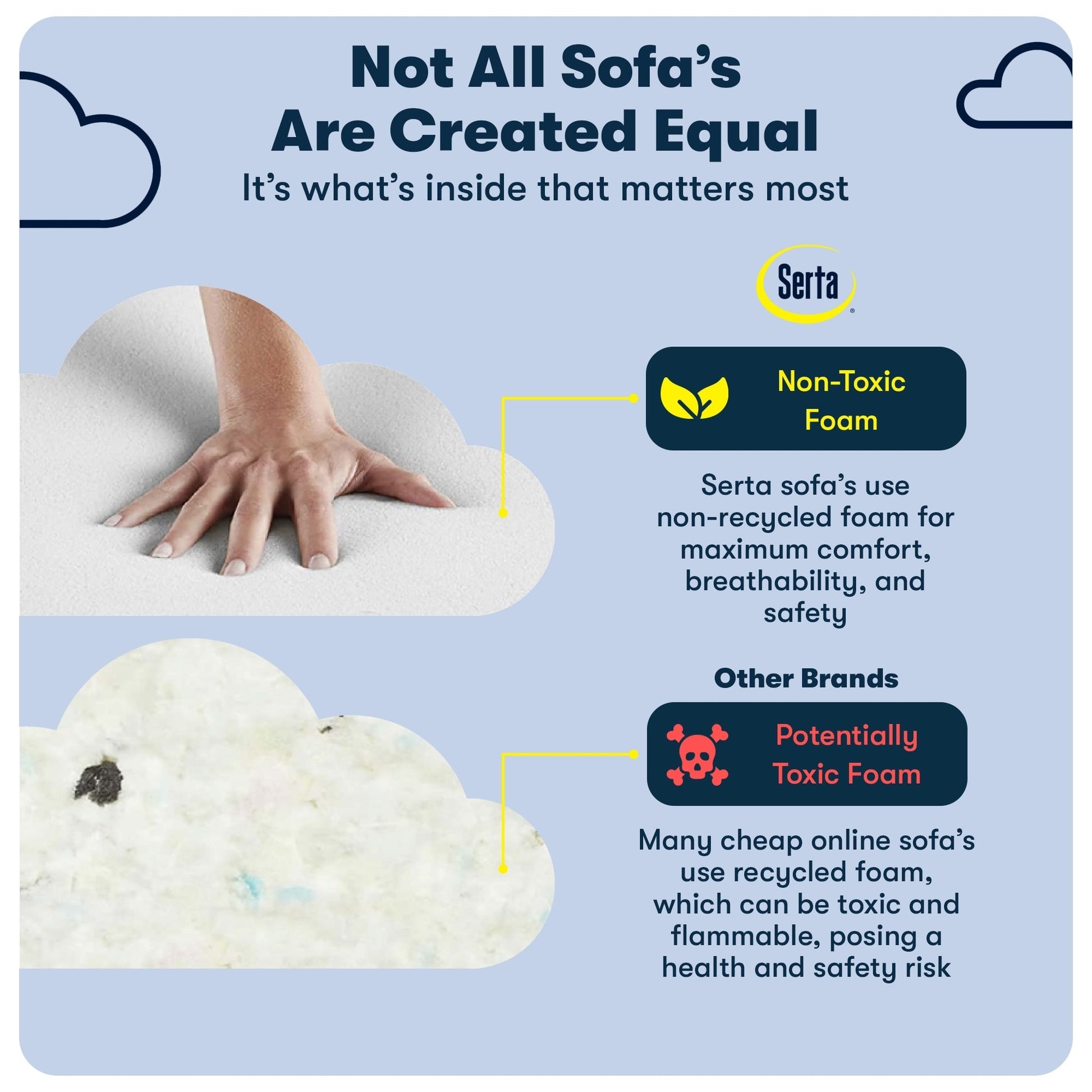 - Mousse et construction Serta : Fabriqués avec un cadre en bois massif équipé de ressorts sinueux pour un soutien accru et de pieds robustes en bois massif pouvant supporter jusqu'à 500 lb. Tous les canapés Serta sont fabriqués à partir de mousse de qualité, non recyclée et non toxique, pour une respirabilité et une sécurité optimales.