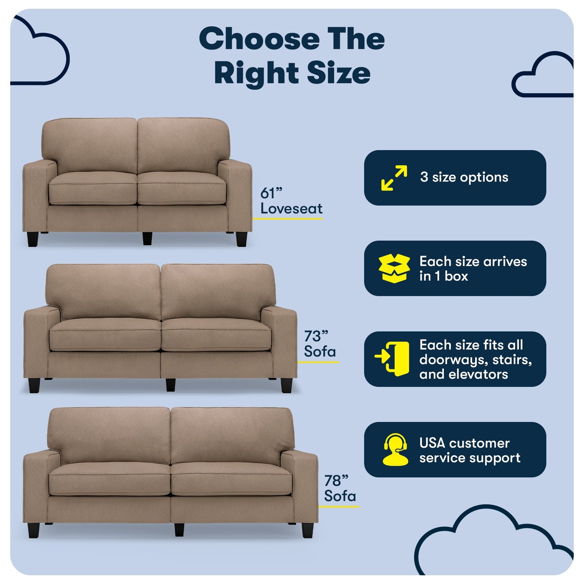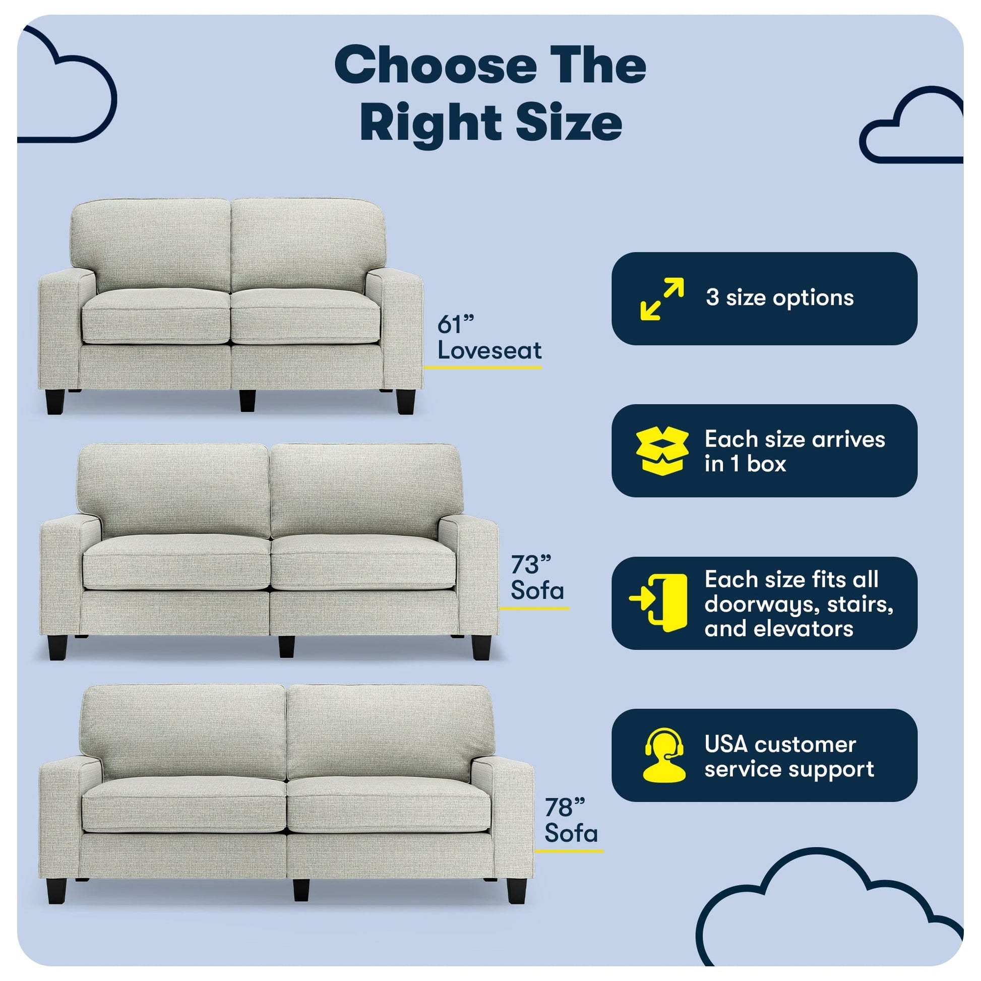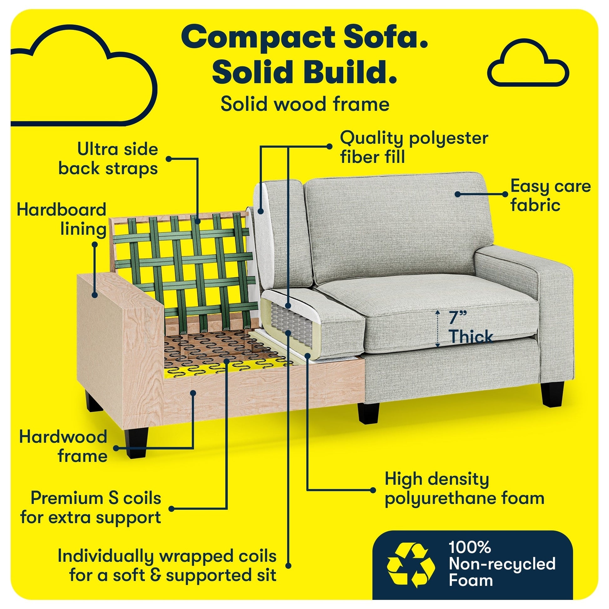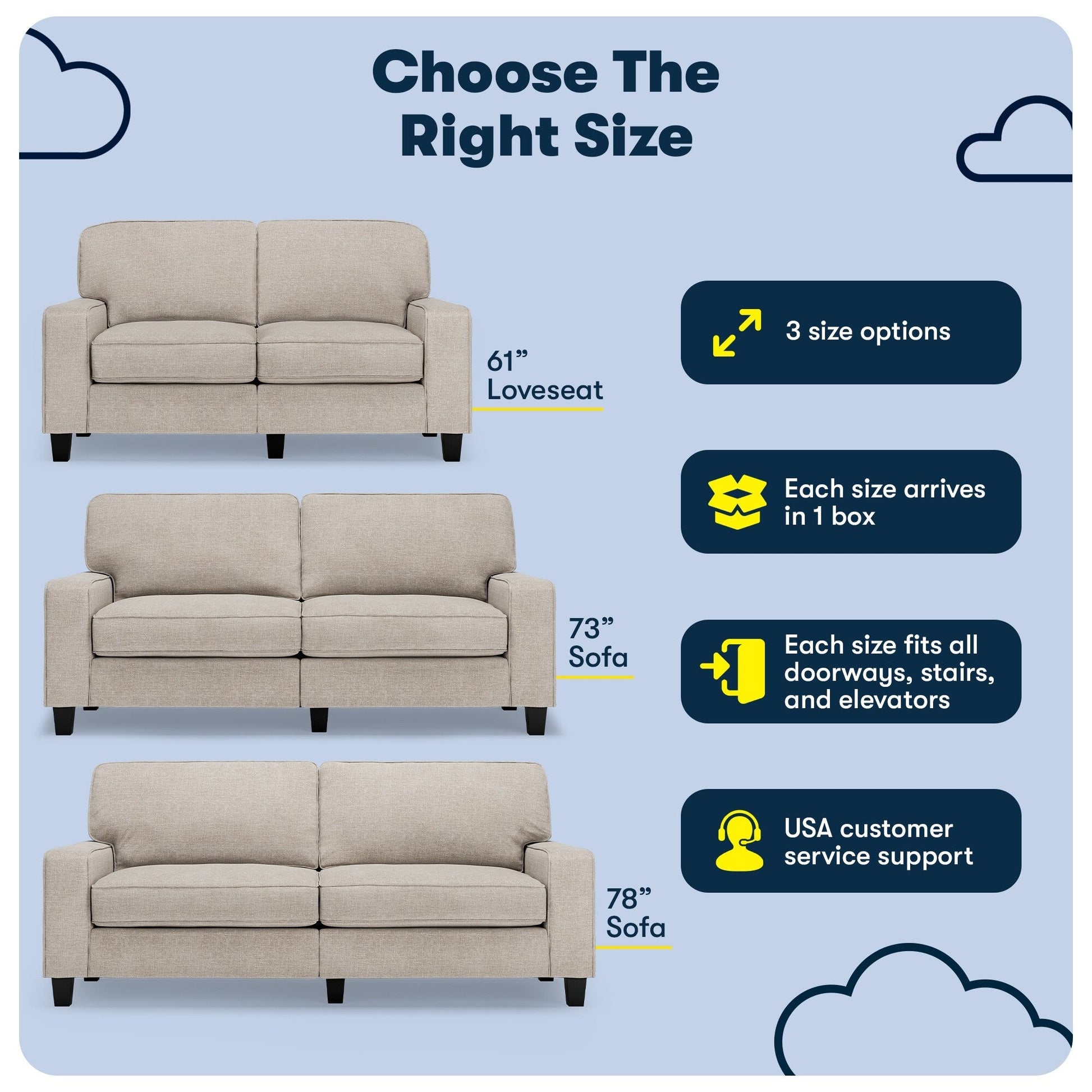- Mousse et construction Serta : Fabriqués avec un cadre en bois massif équipé de ressorts sinueux pour un soutien accru et de pieds robustes en bois massif pouvant supporter jusqu'à 500 lb. Tous les canapés Serta sont fabriqués à partir de mousse de qualité, non recyclée et non toxique, pour une respirabilité et une sécurité optimales.