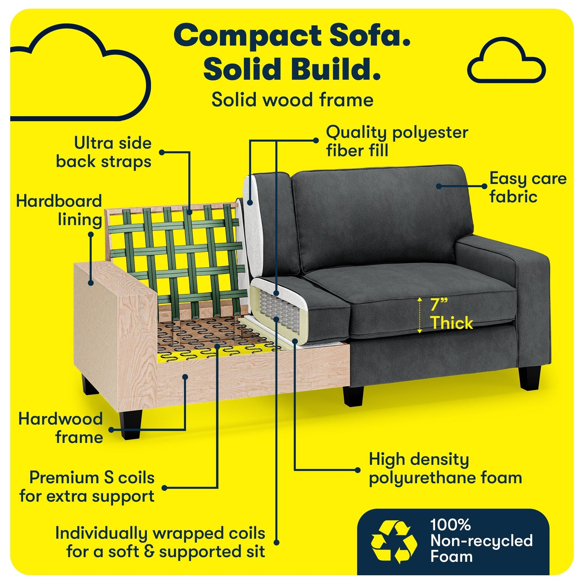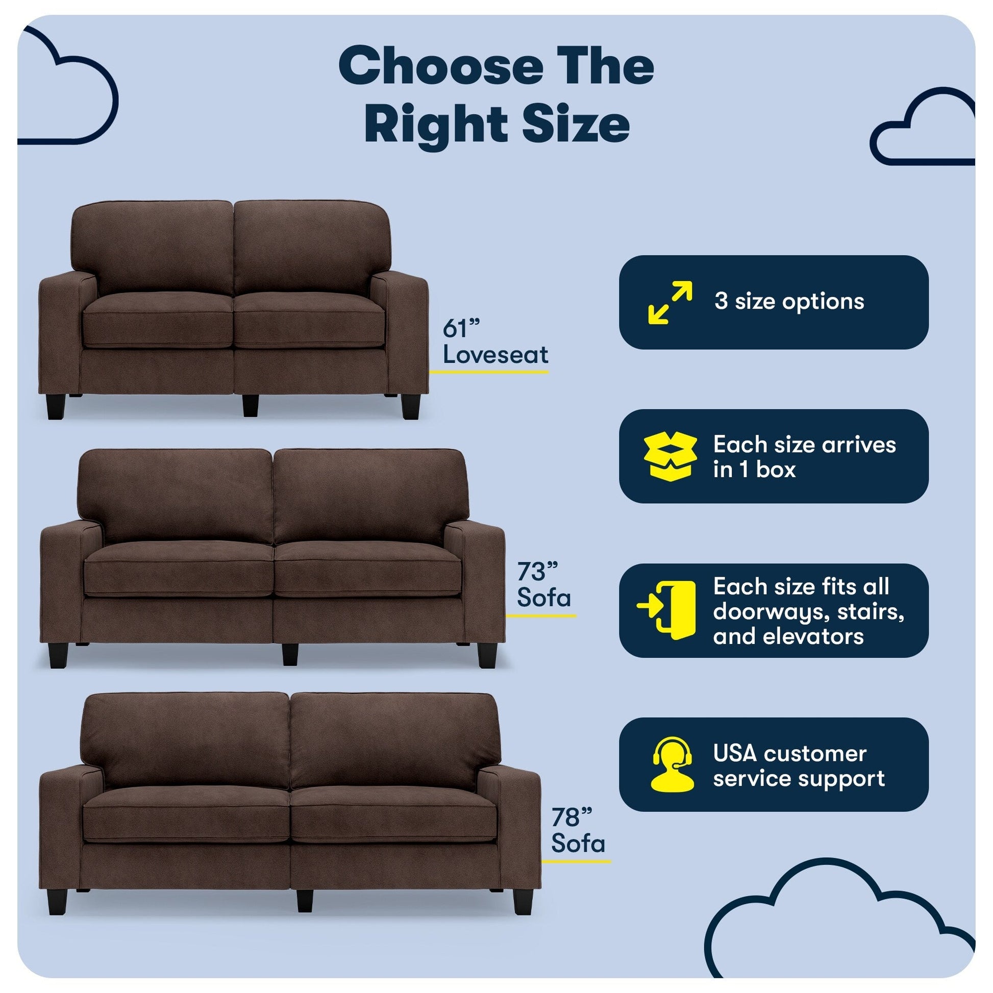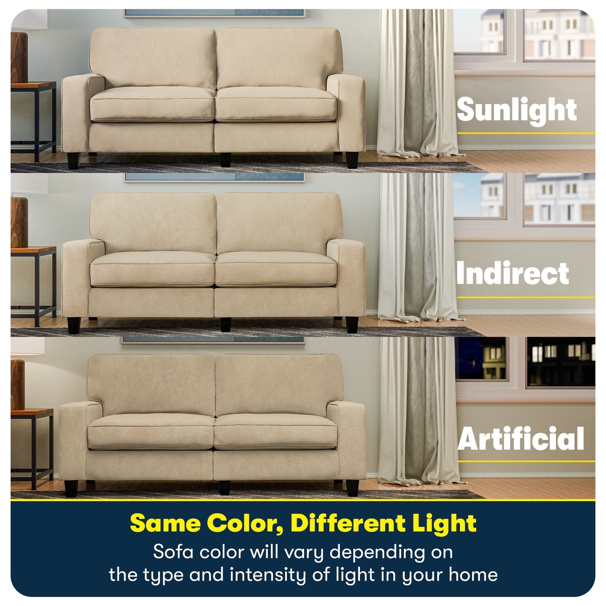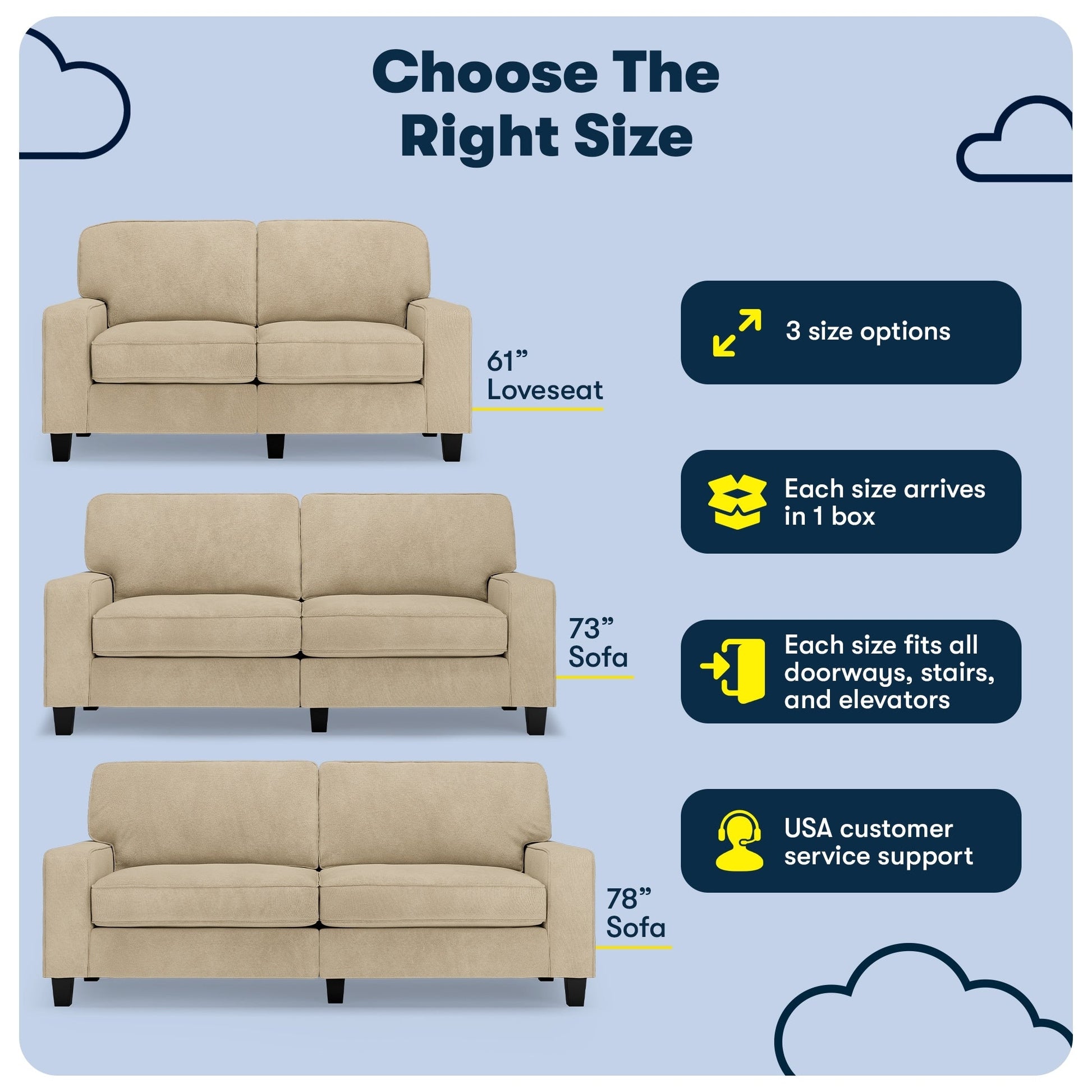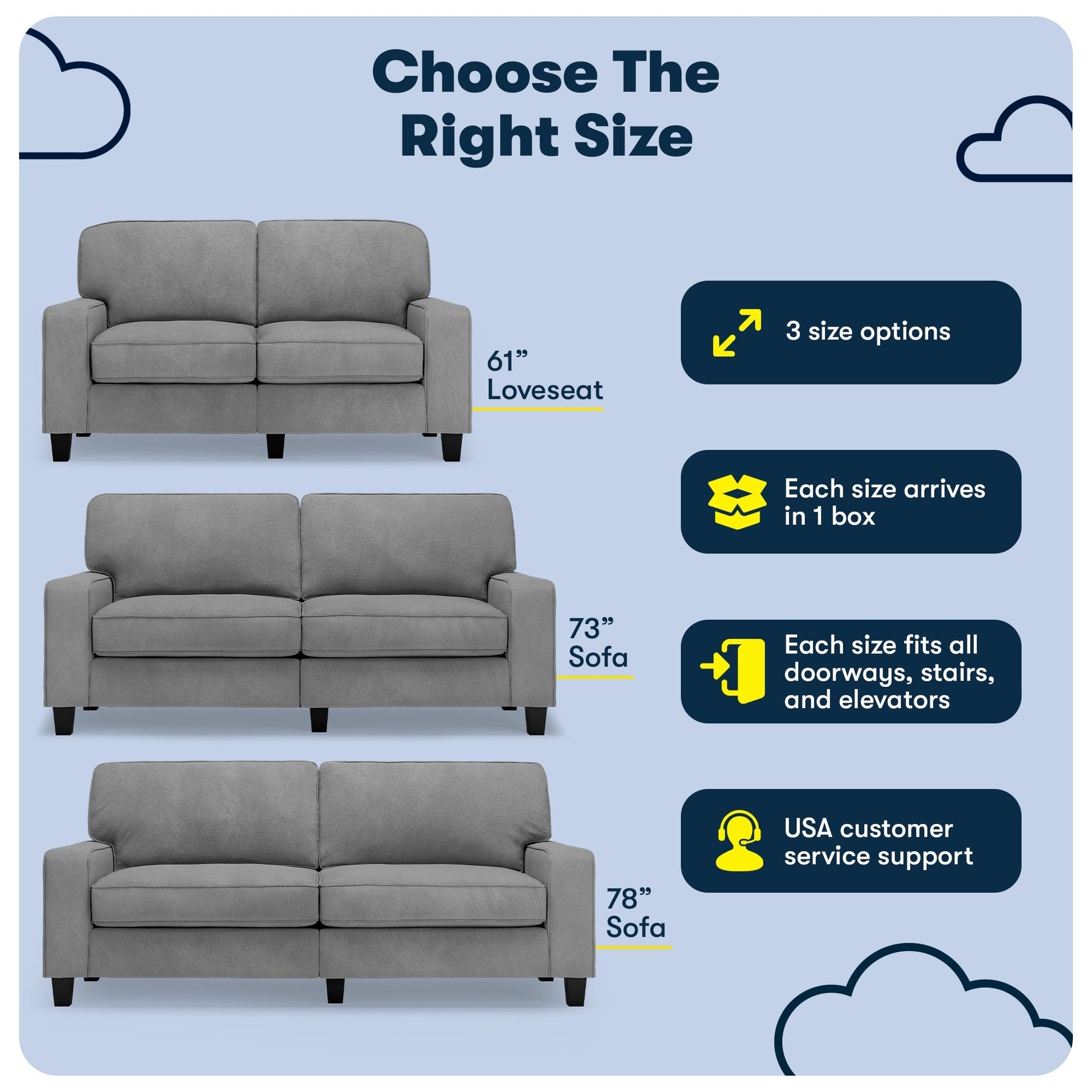 - Mousse et construction Serta : Fabriqués avec un cadre en bois massif équipé de ressorts sinueux pour un soutien accru et de pieds robustes en bois massif pouvant supporter jusqu'à 500 lb. Tous les canapés Serta sont fabriqués à partir de mousse de qualité, non recyclée et non toxique, pour une respirabilité et une sécurité optimales.