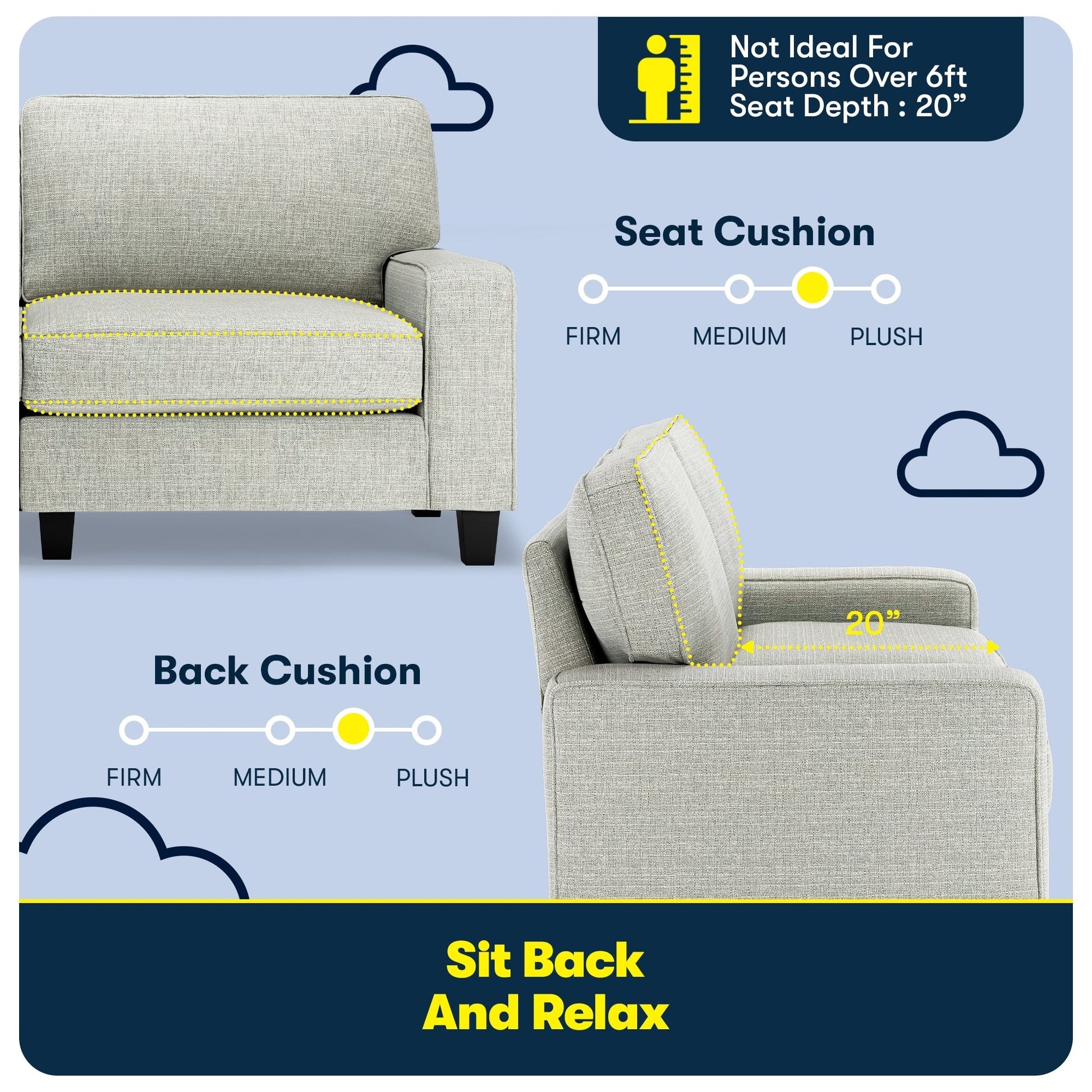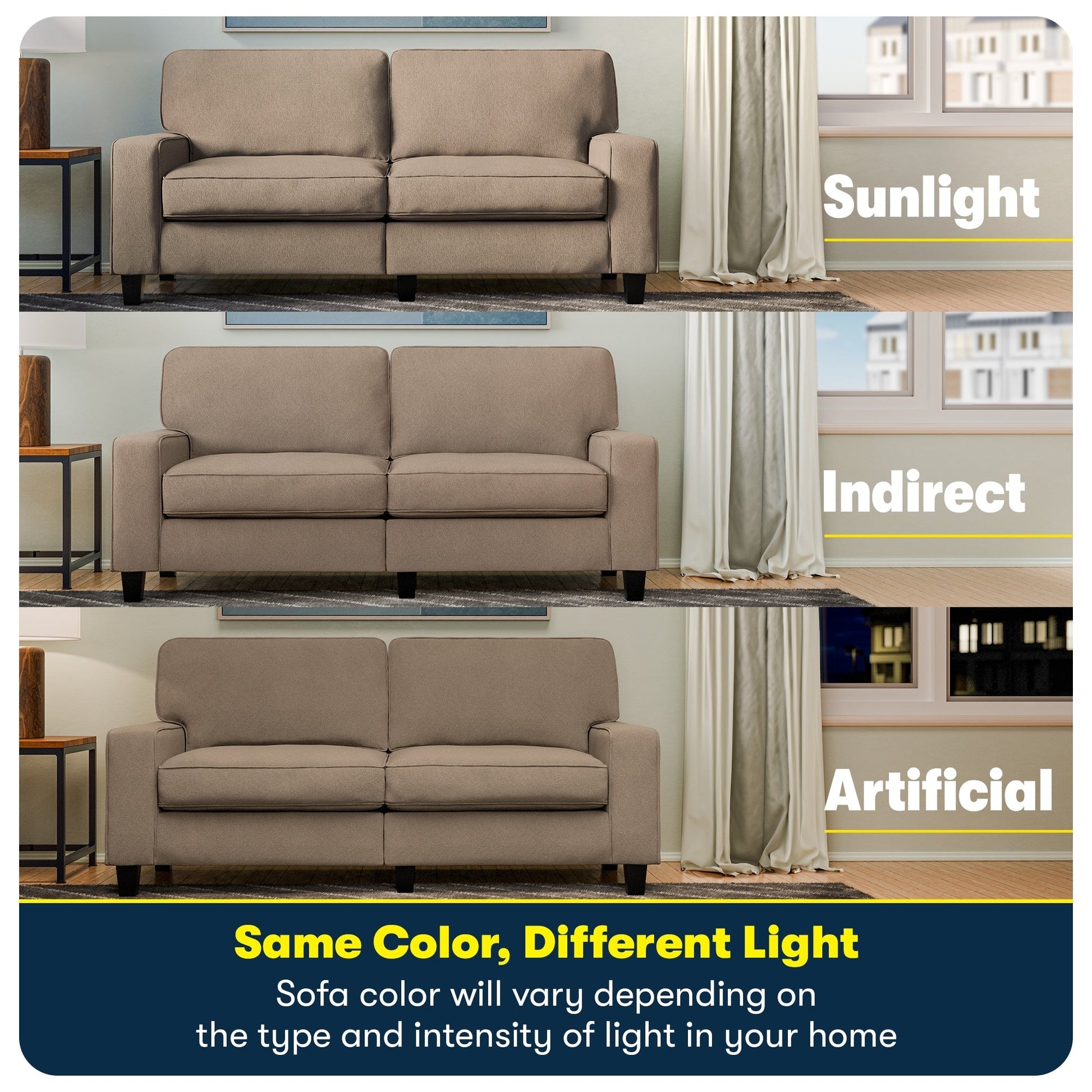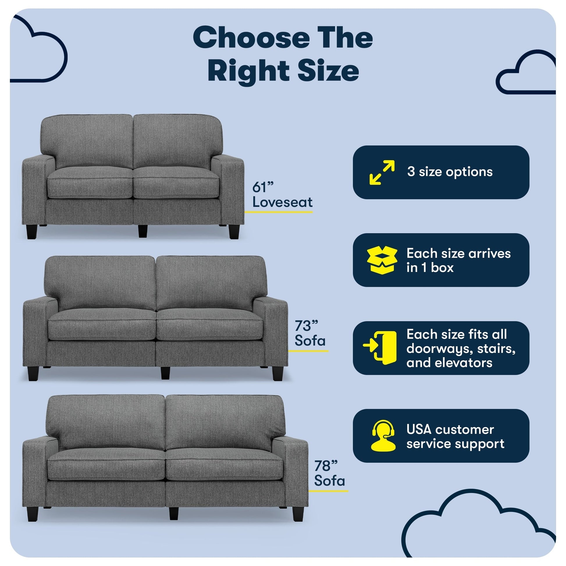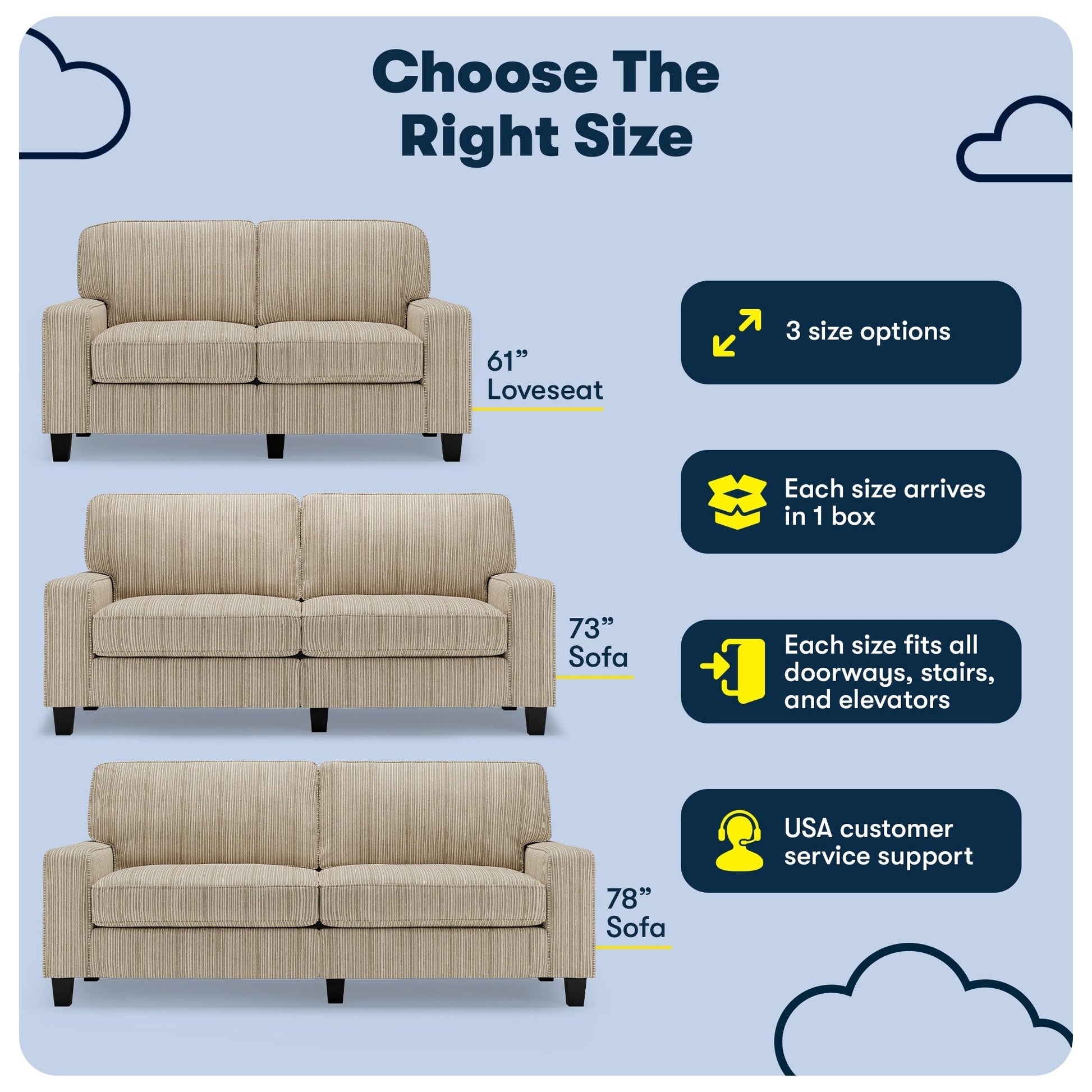 - Mousse et construction Serta : Fabriqués avec un cadre en bois massif équipé de ressorts sinueux pour un soutien accru et de pieds robustes en bois massif pouvant supporter jusqu'à 500 lb. Tous les canapés Serta sont fabriqués à partir de mousse de qualité, non recyclée et non toxique, pour une respirabilité et une sécurité optimales.