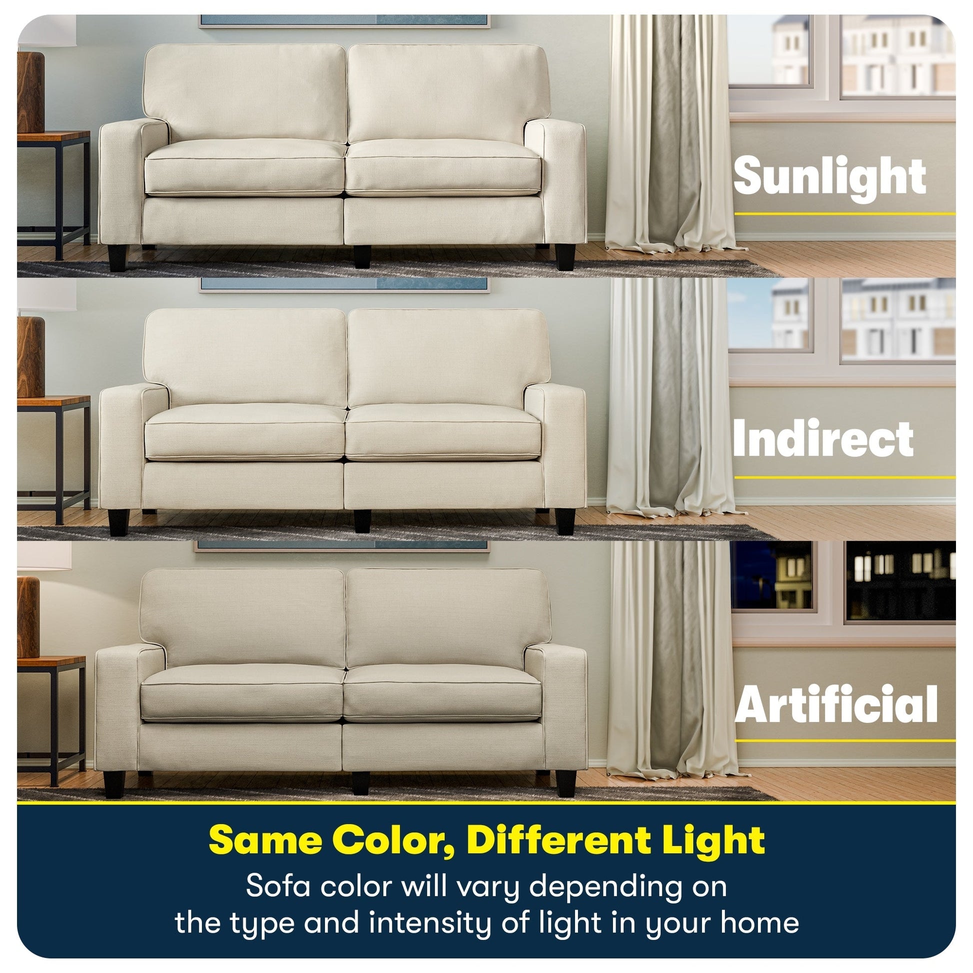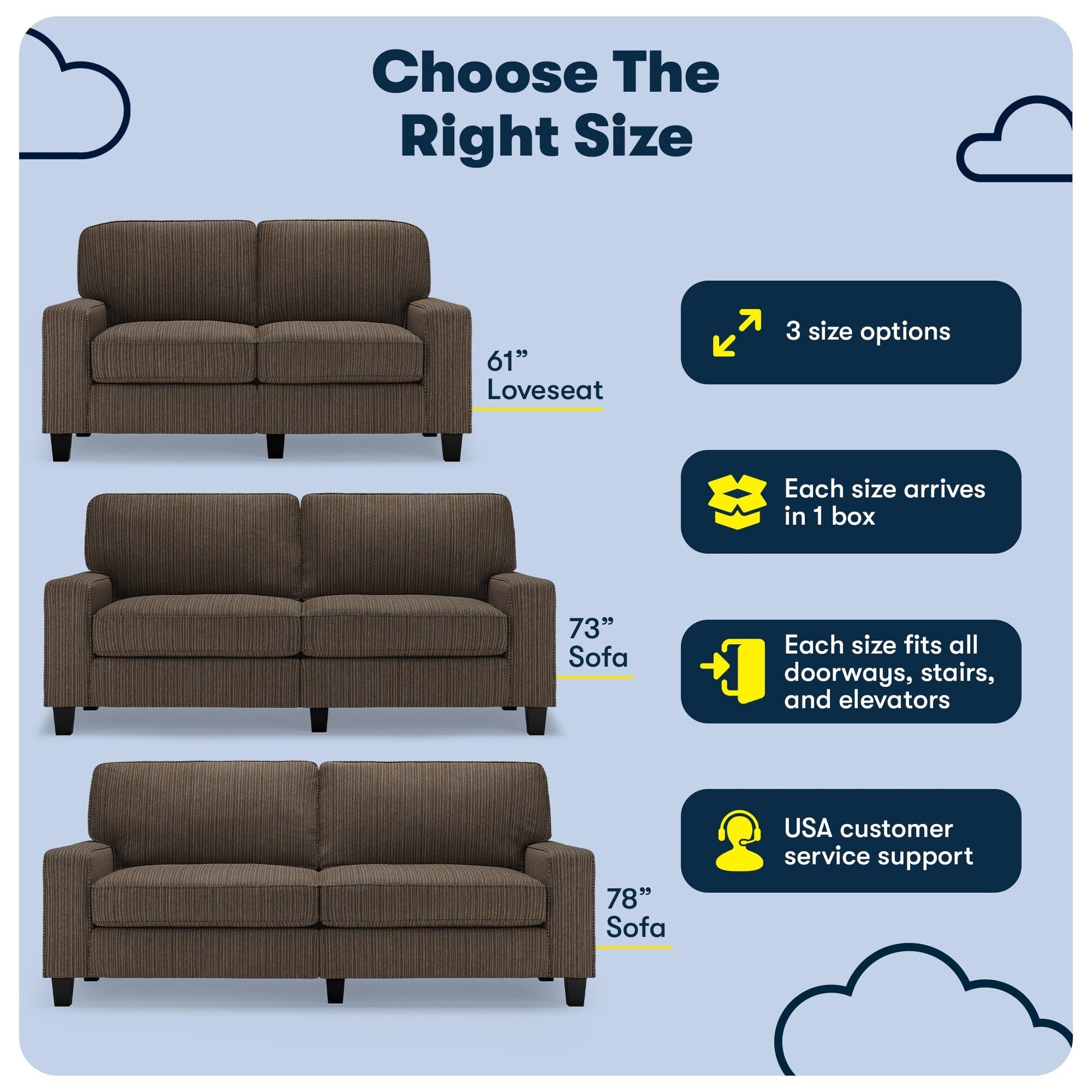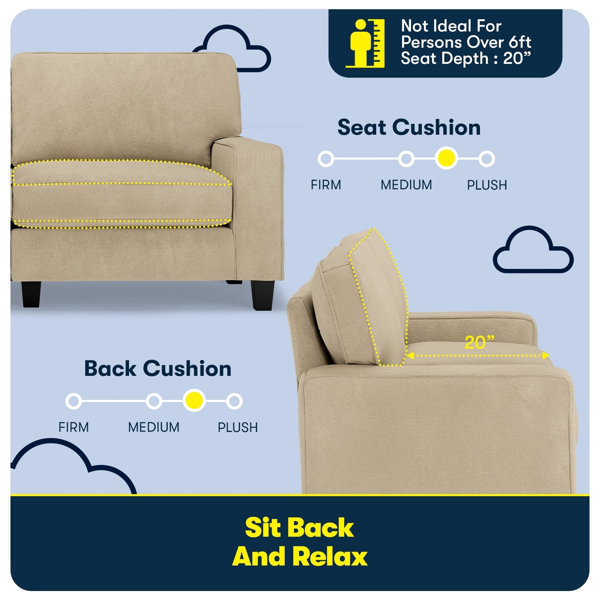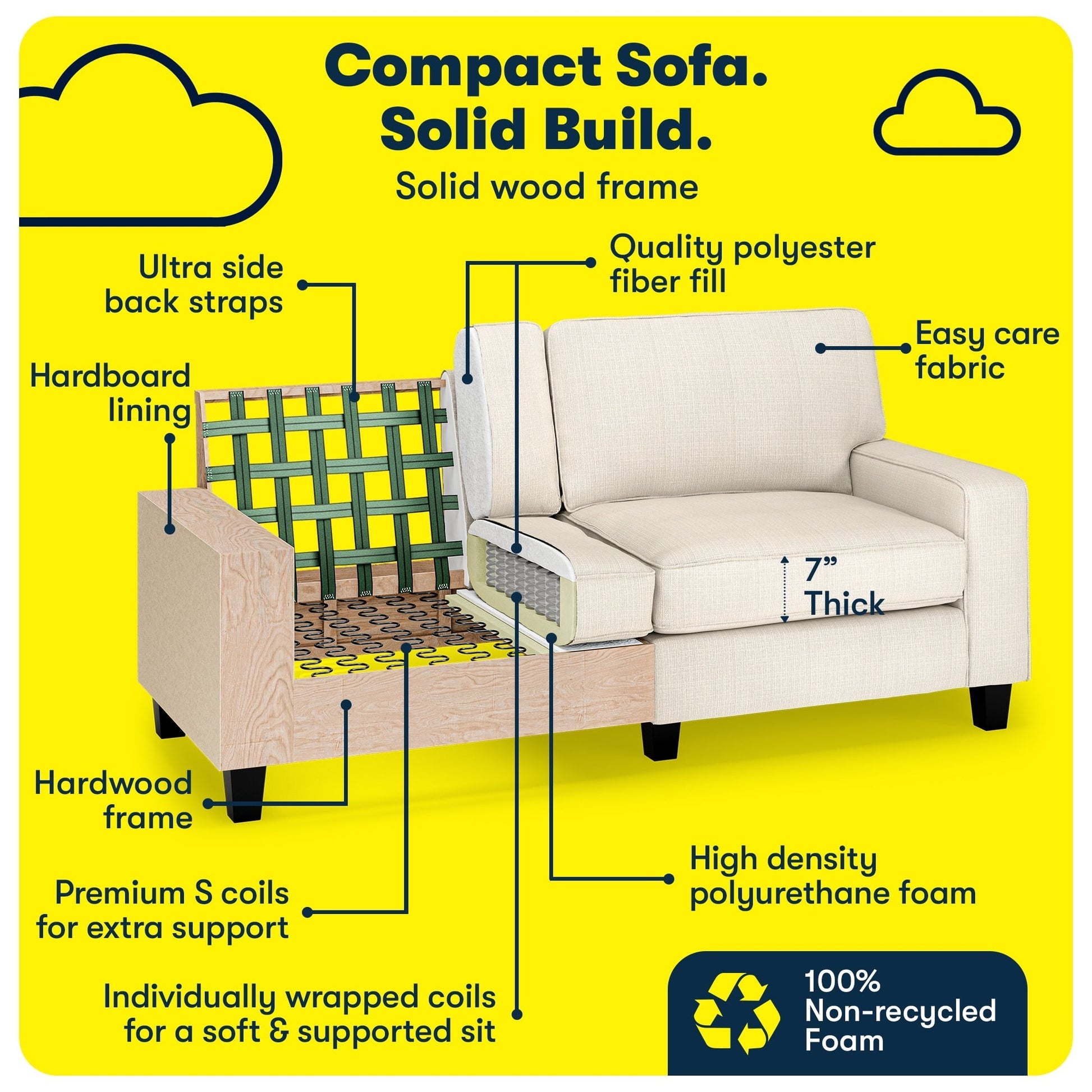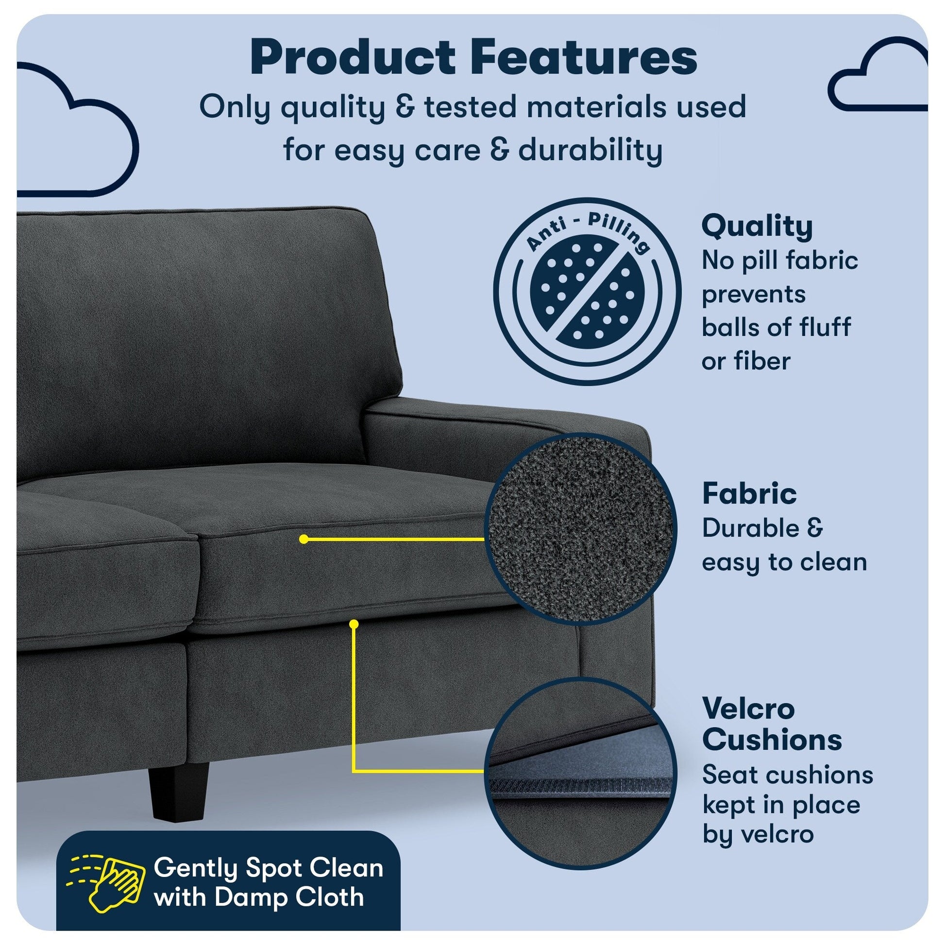 - Mousse et construction Serta : Fabriqués avec un cadre en bois massif équipé de ressorts sinueux pour un soutien accru et de pieds robustes en bois massif pouvant supporter jusqu'à 500 lb. Tous les canapés Serta sont fabriqués à partir de mousse de qualité, non recyclée et non toxique, pour une respirabilité et une sécurité optimales.