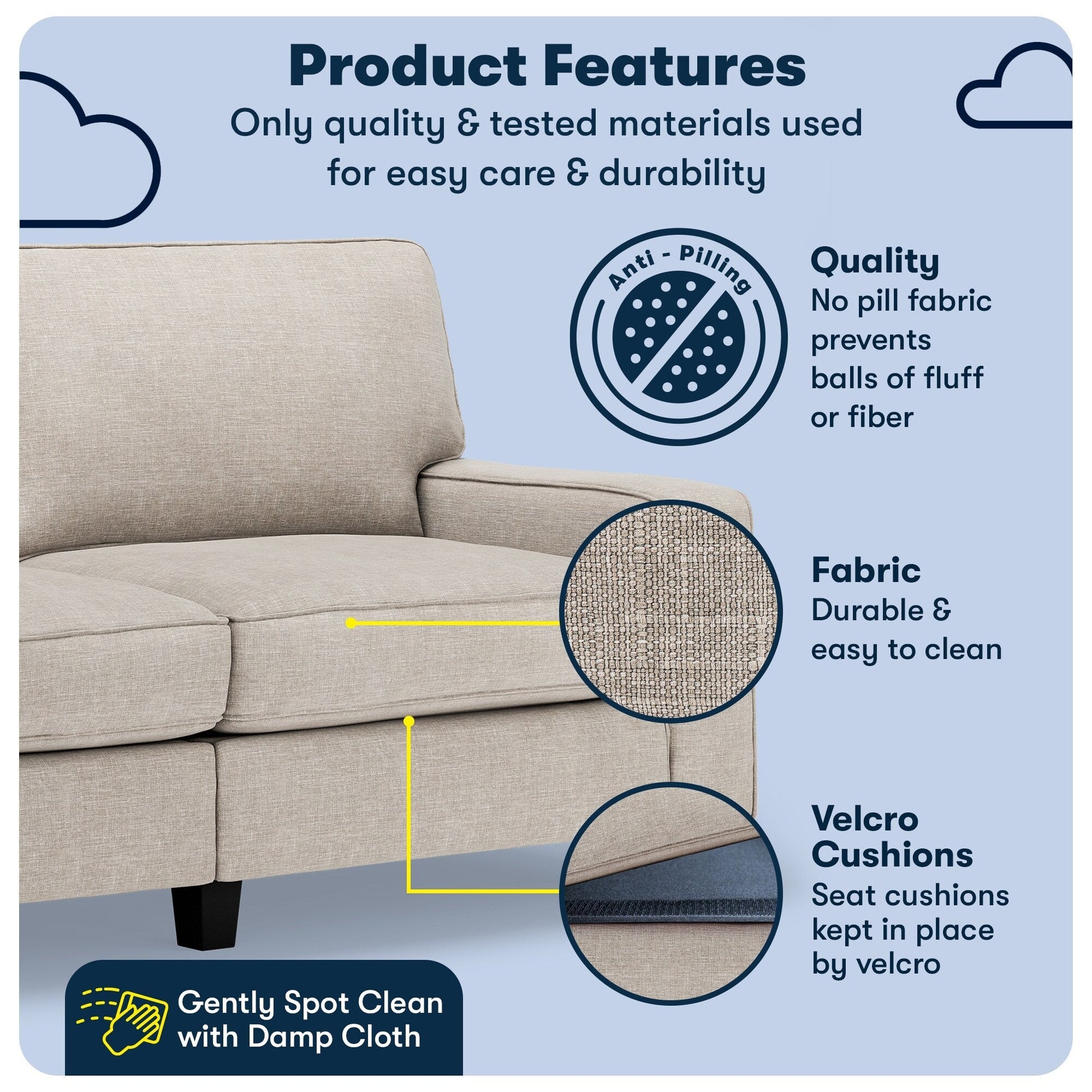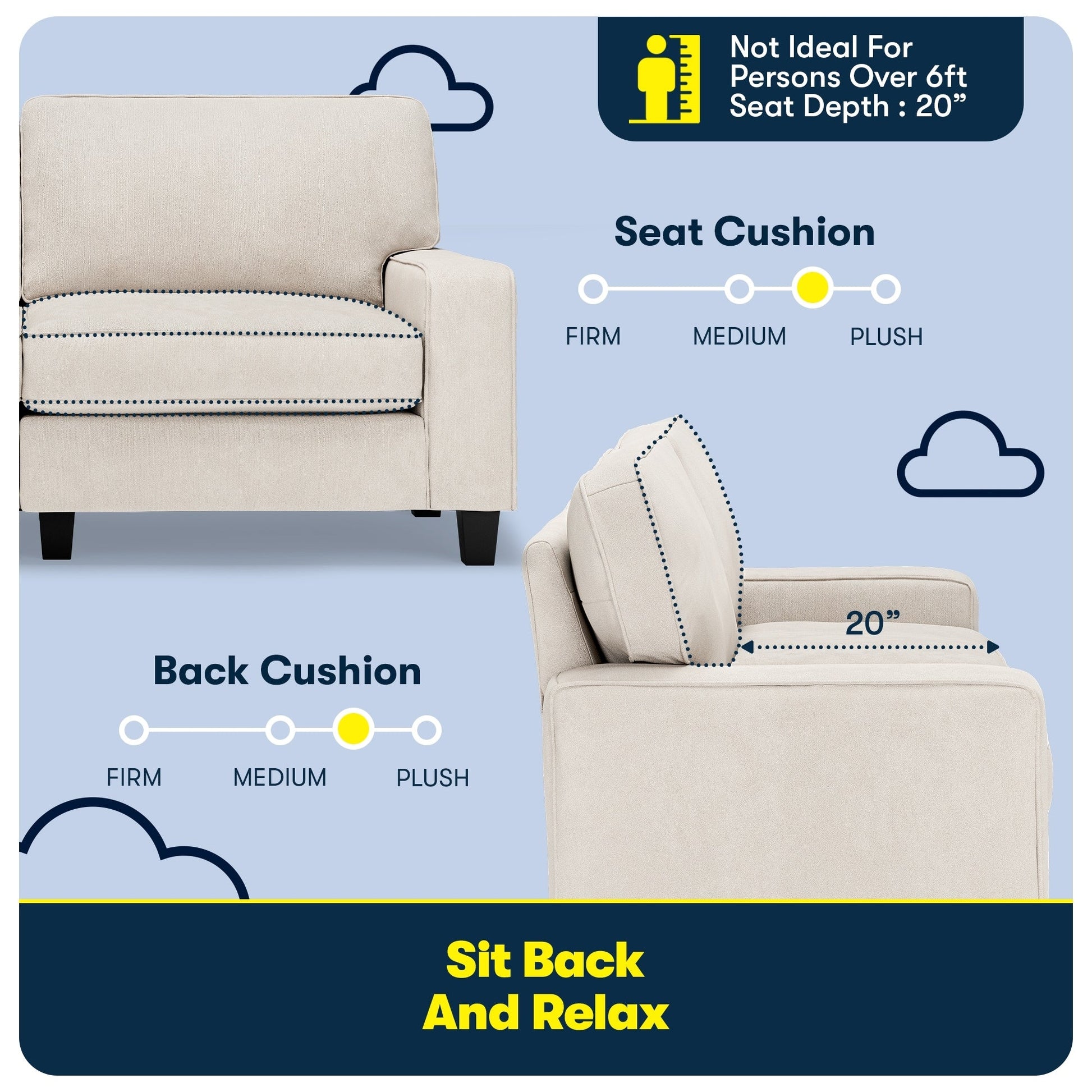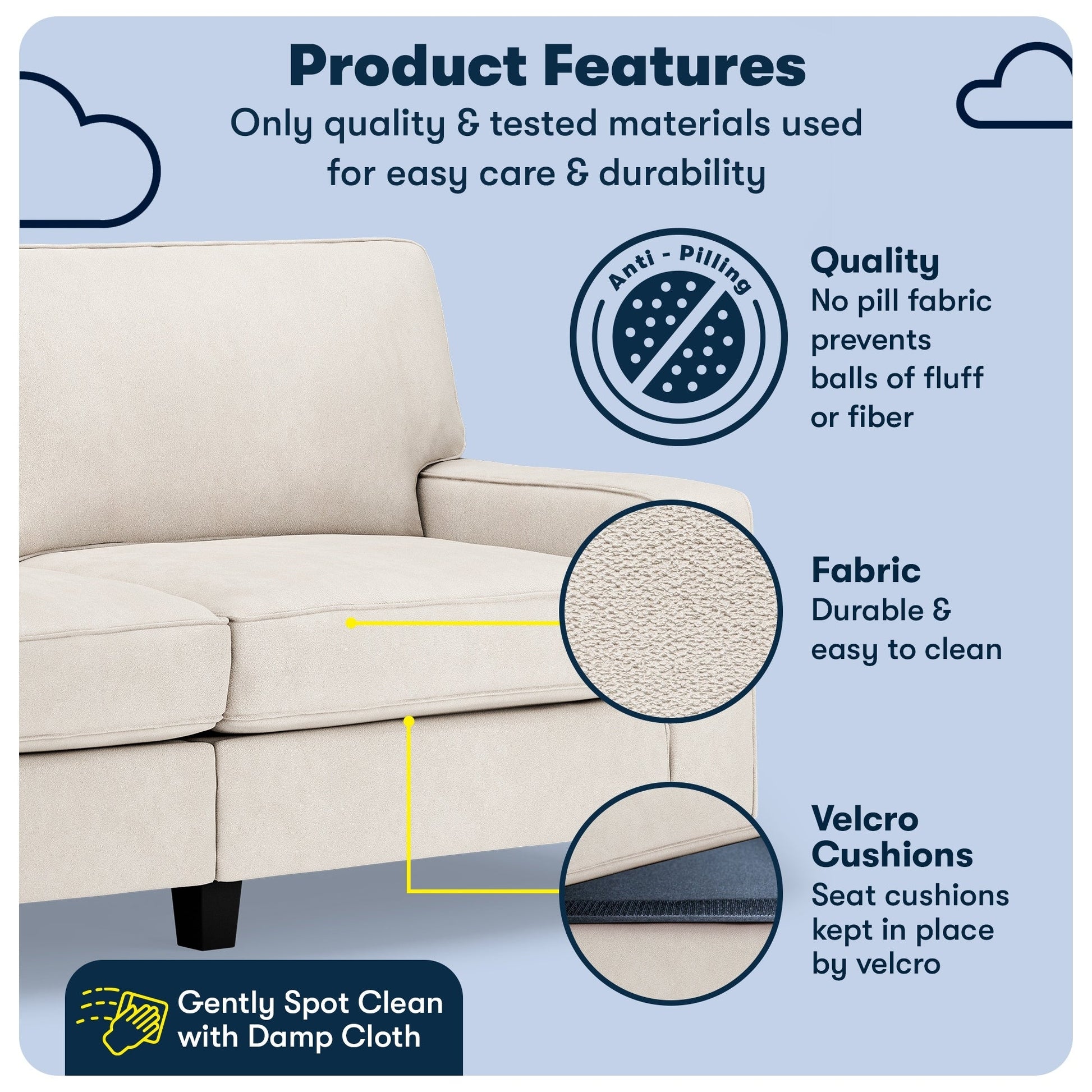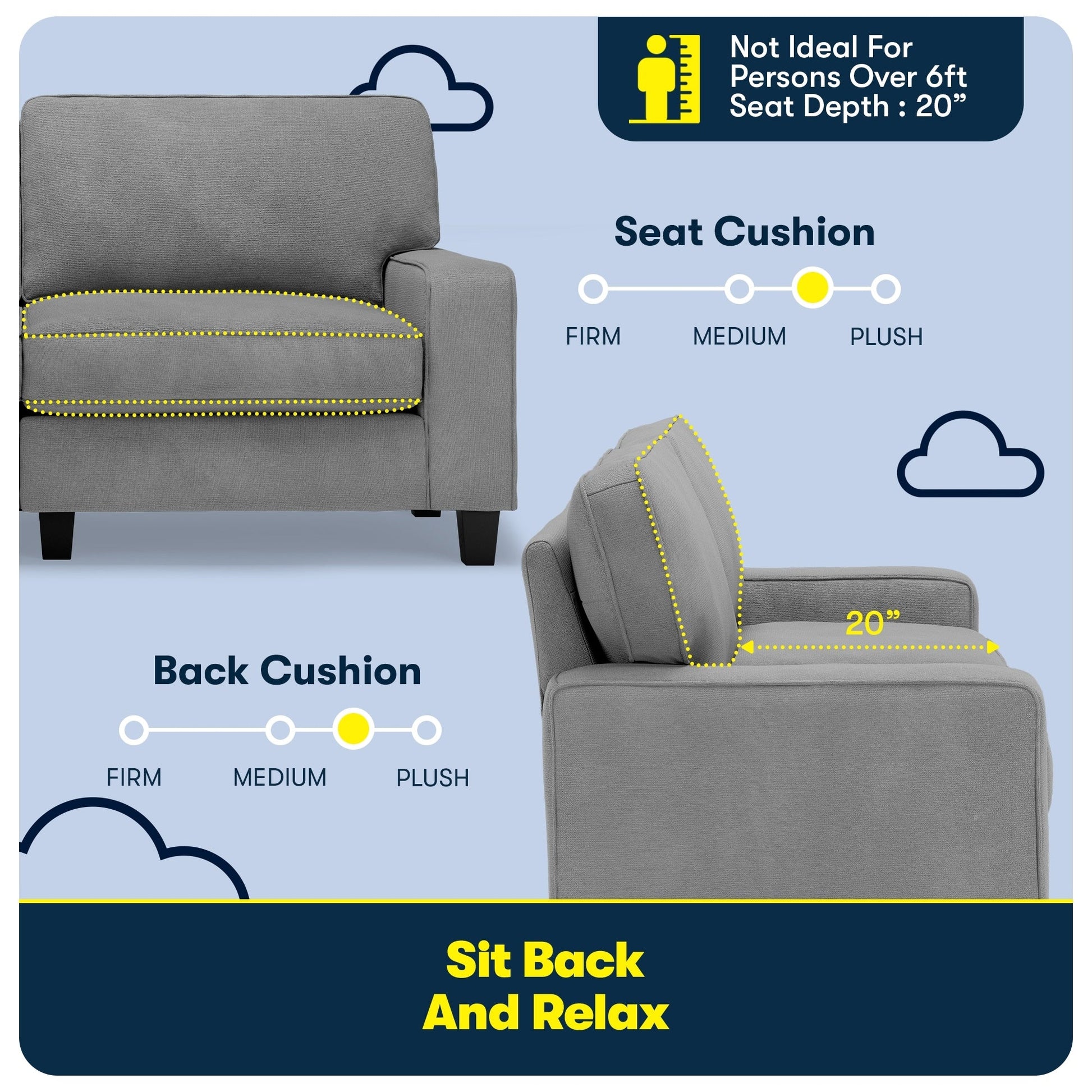 - Mousse et construction Serta : Fabriqués avec un cadre en bois massif équipé de ressorts sinueux pour un soutien accru et de pieds robustes en bois massif pouvant supporter jusqu'à 500 lb. Tous les canapés Serta sont fabriqués à partir de mousse de qualité, non recyclée et non toxique, pour une respirabilité et une sécurité optimales.