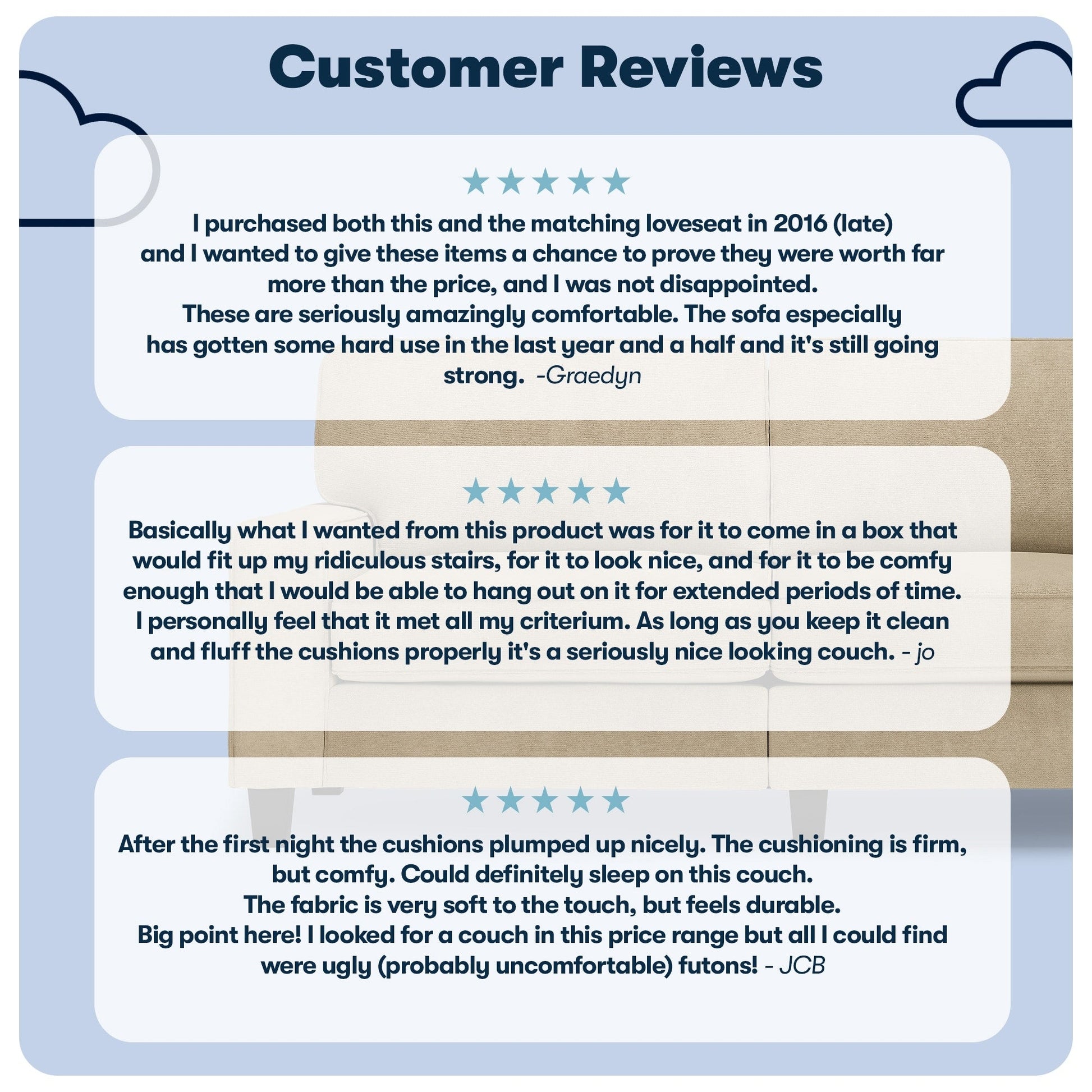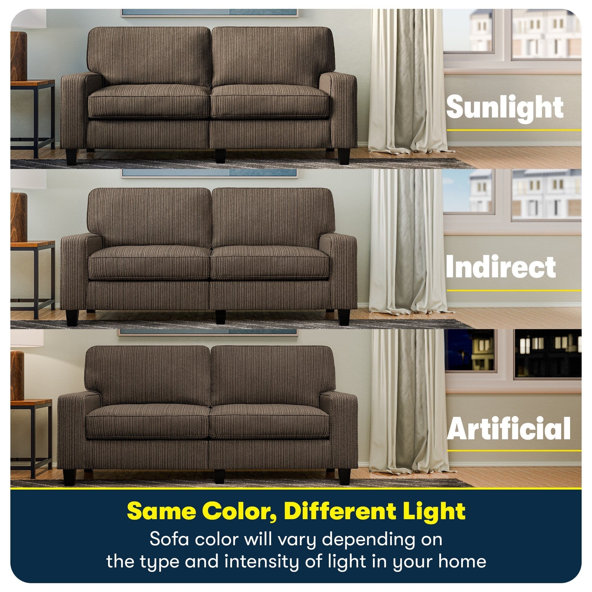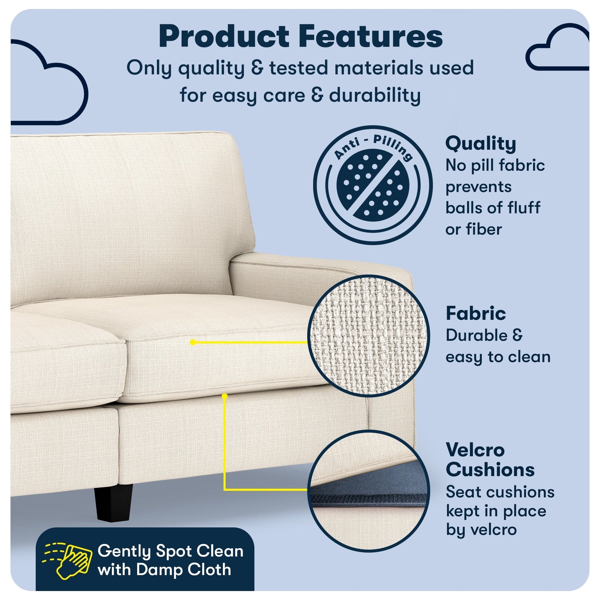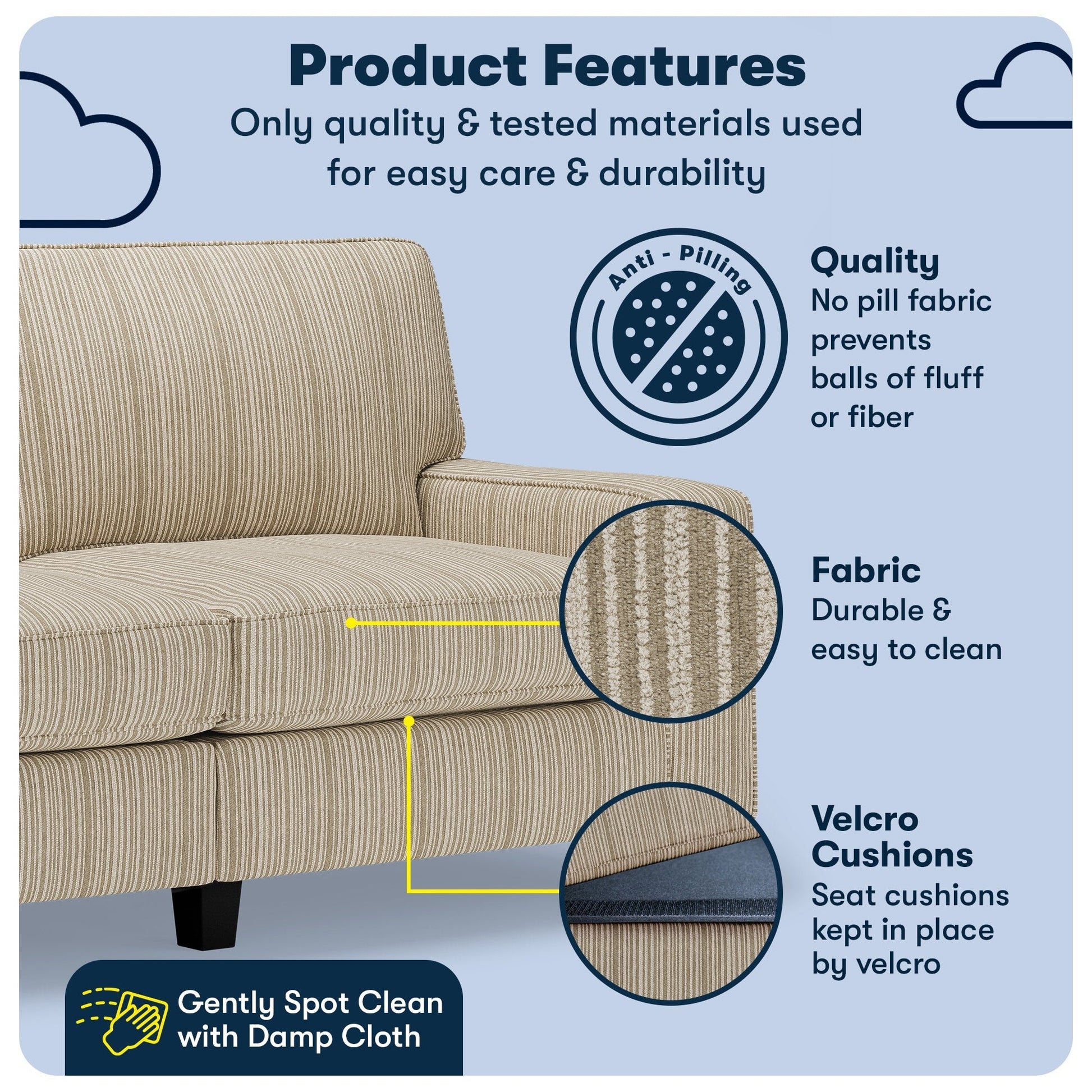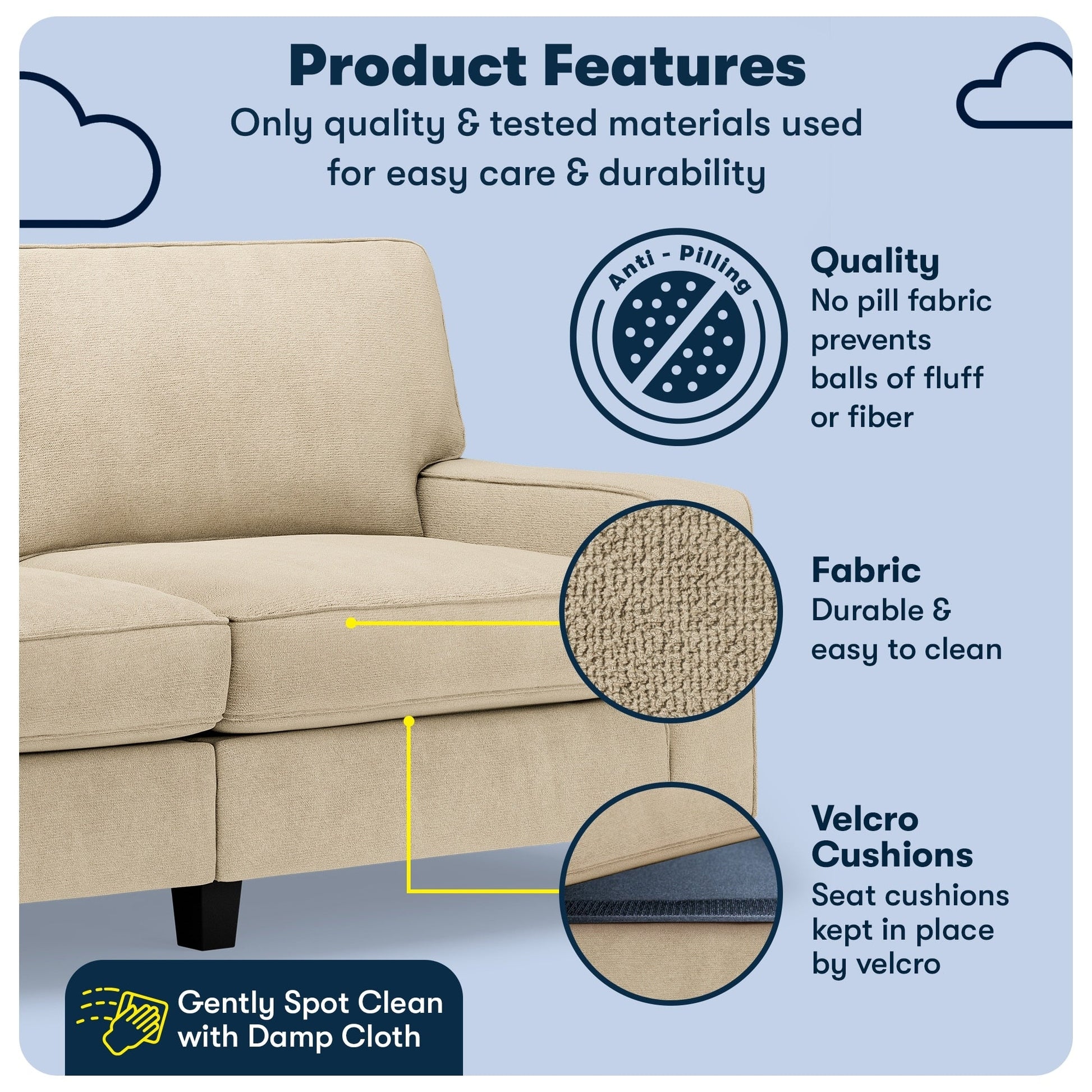 - Mousse et construction Serta : Fabriqués avec un cadre en bois massif équipé de ressorts sinueux pour un soutien accru et de pieds robustes en bois massif pouvant supporter jusqu'à 500 lb. Tous les canapés Serta sont fabriqués à partir de mousse de qualité, non recyclée et non toxique, pour une respirabilité et une sécurité optimales.