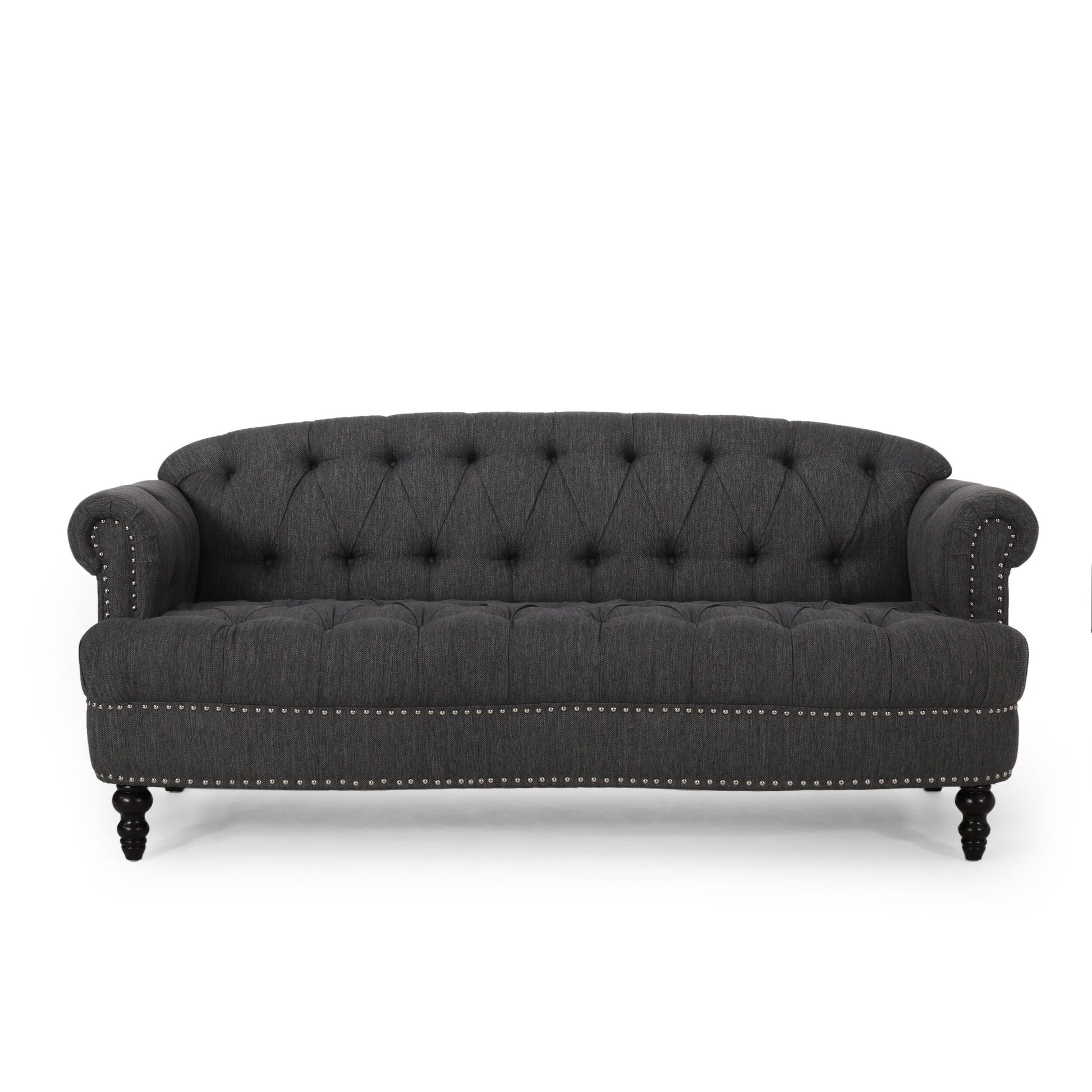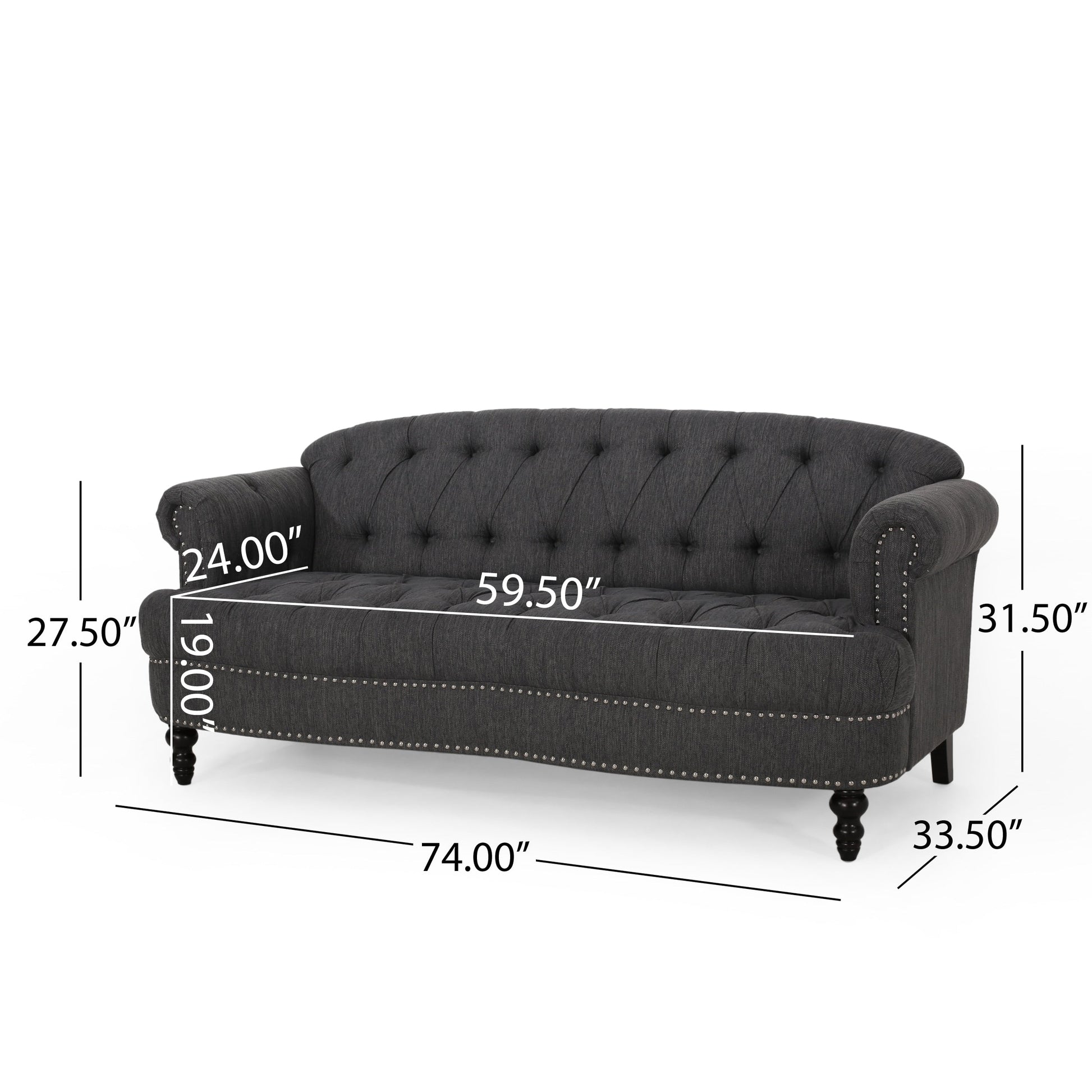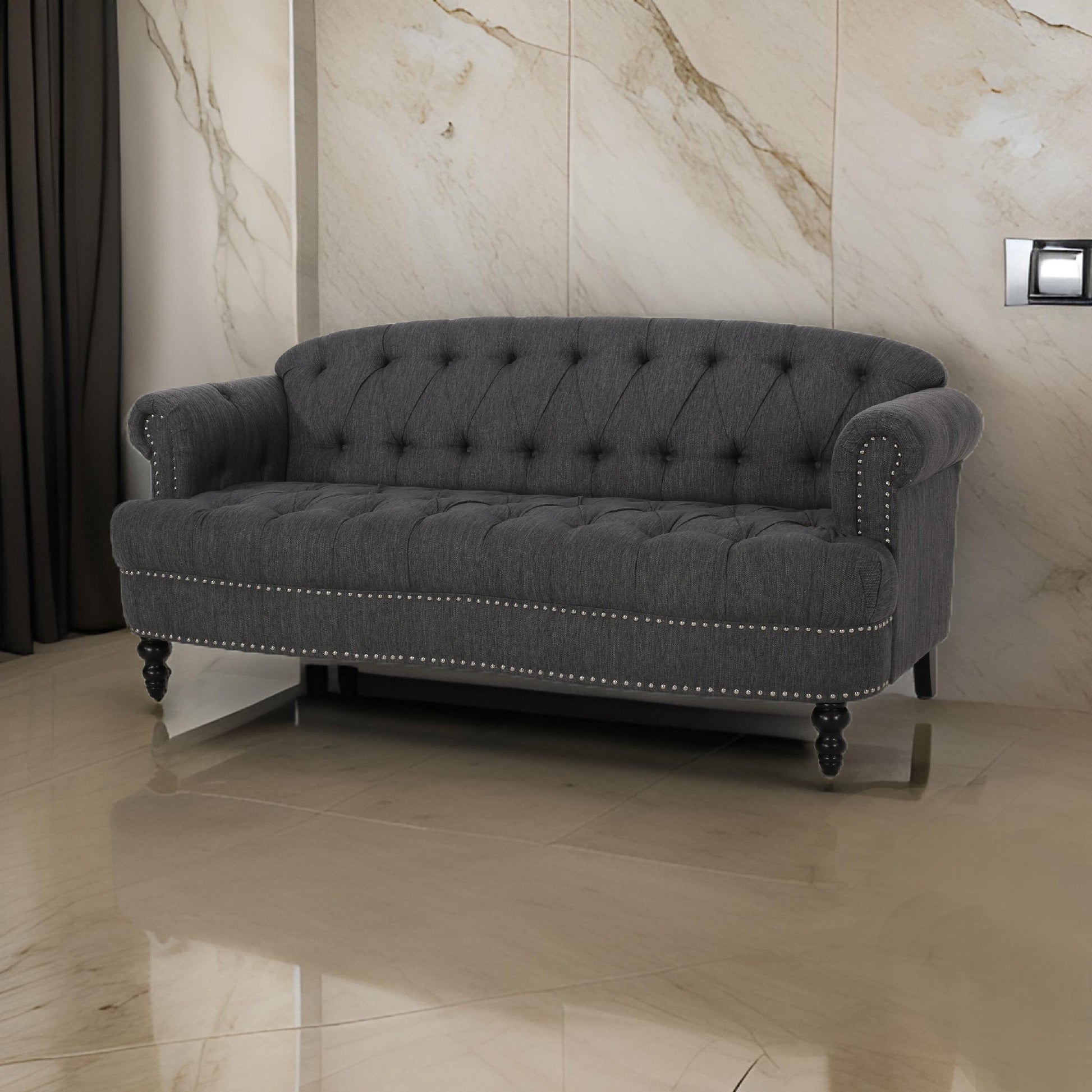 Canapé 3 places 74 pouces, détails rivetés, tissu gris anthracite capitonné à boutons