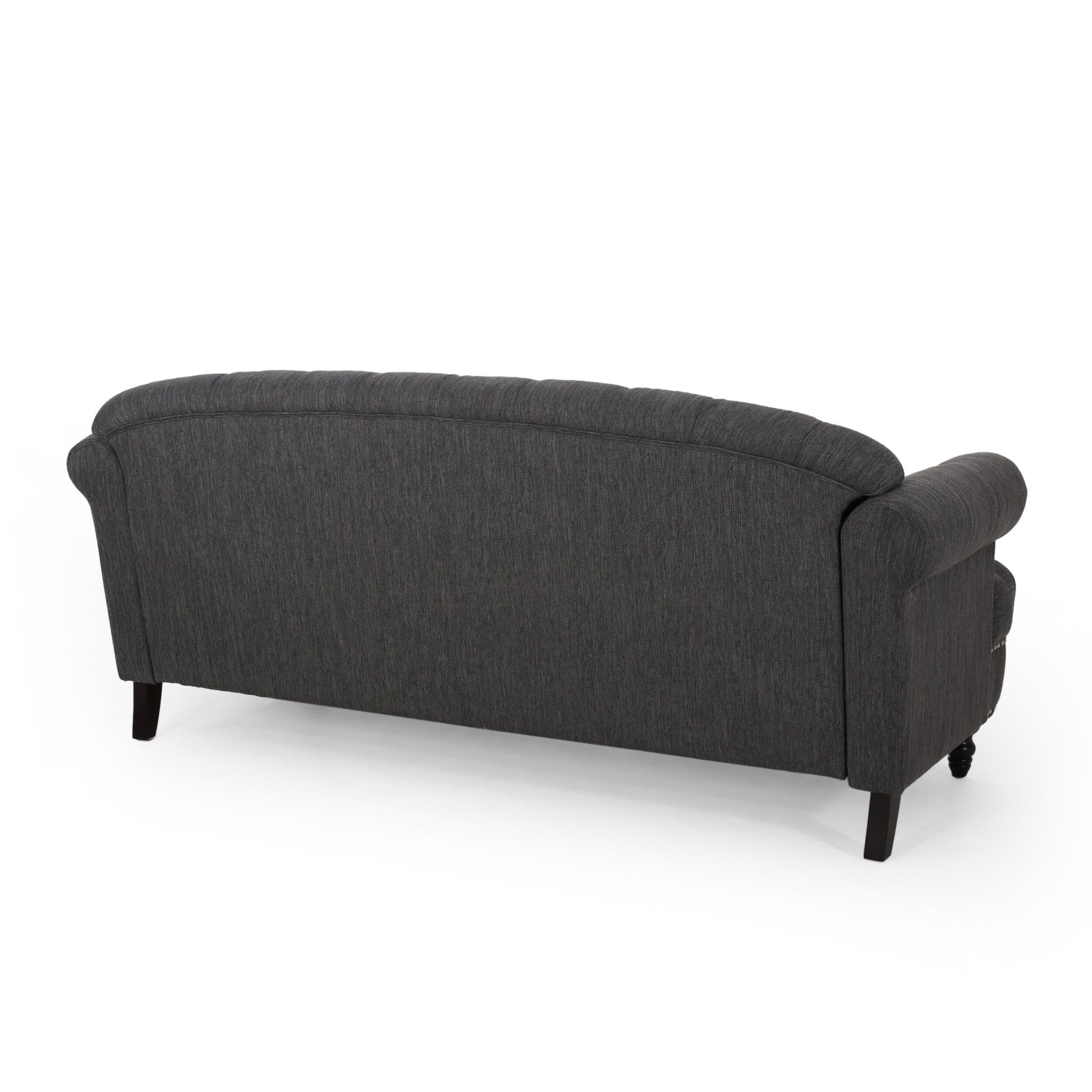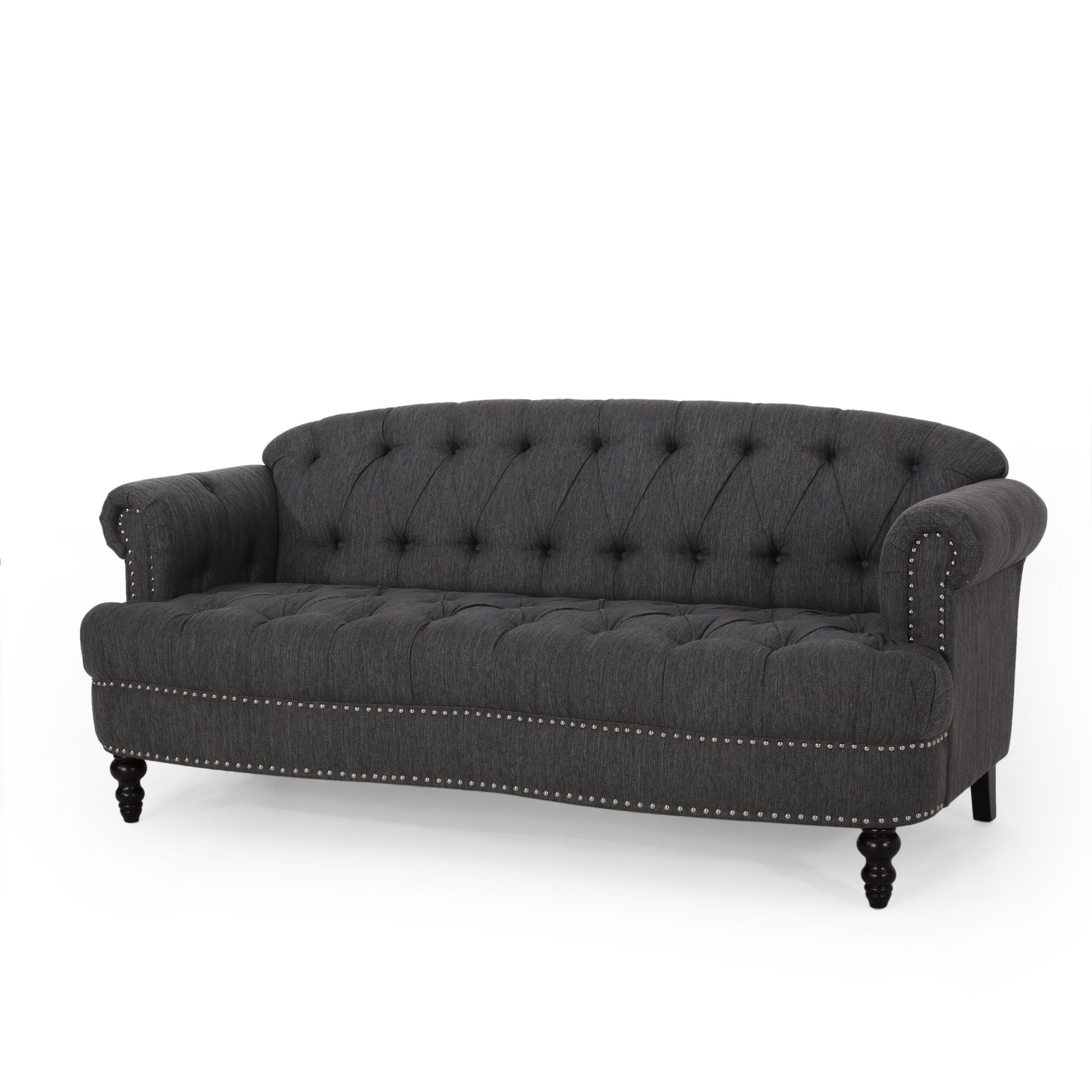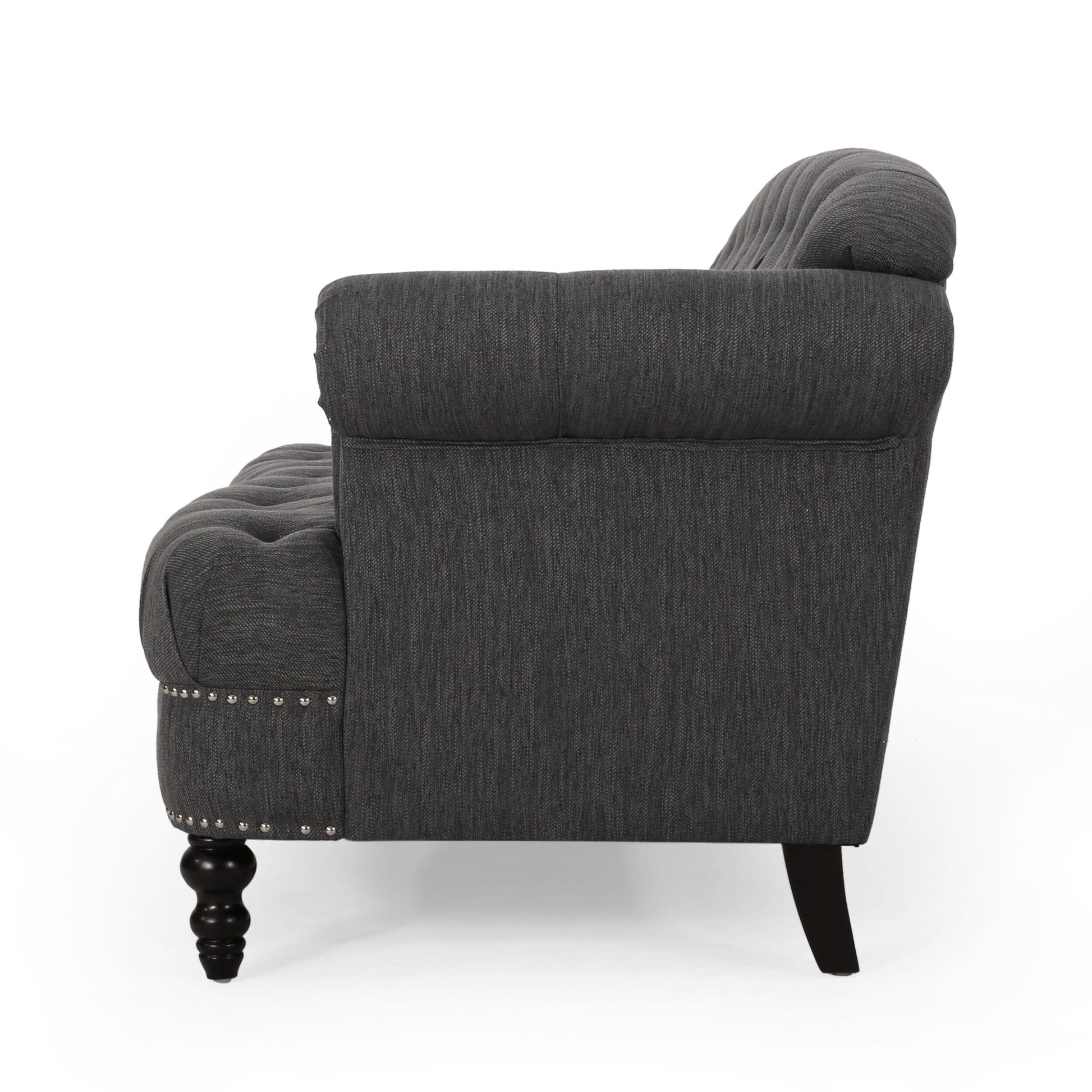 Canapé 3 places 74 pouces, détails rivetés, tissu gris anthracite capitonné à boutons