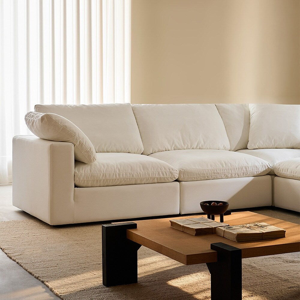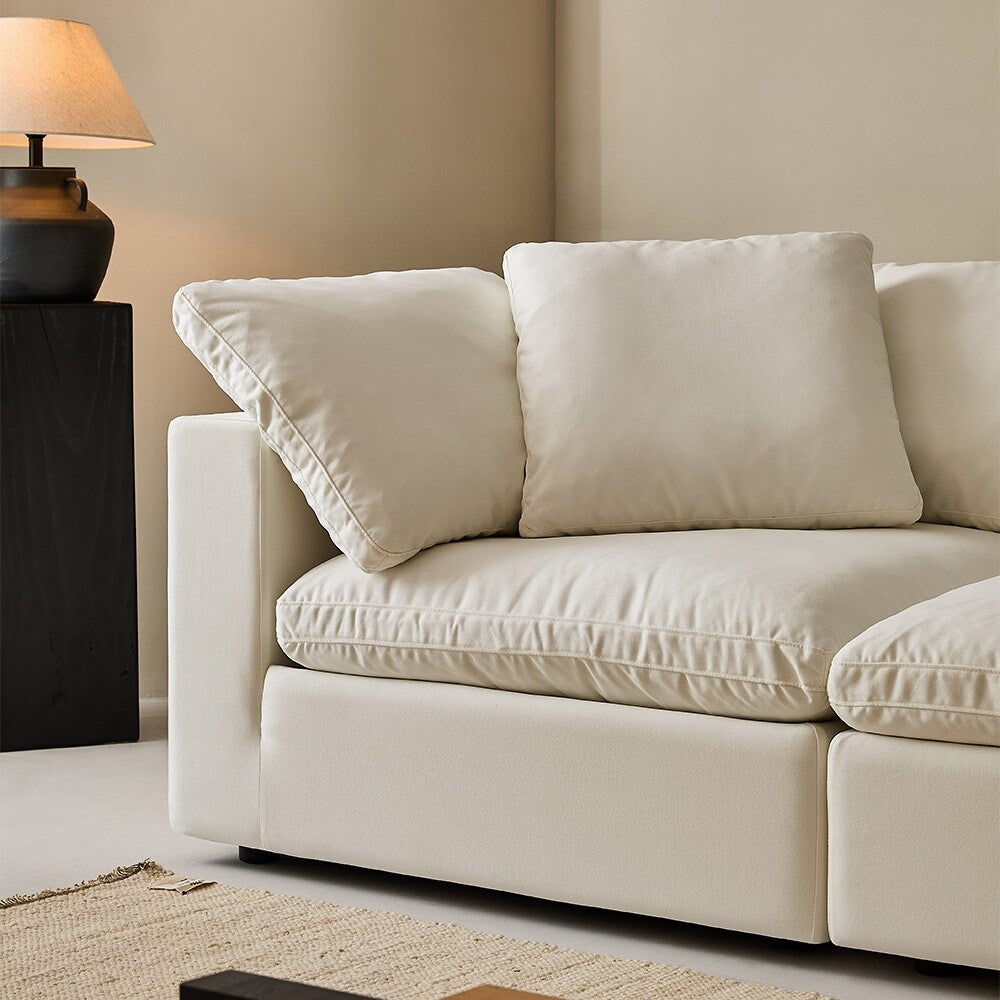 Canapé d'angle rectangulaire en lin à accoudoirs carrés, blanc perle