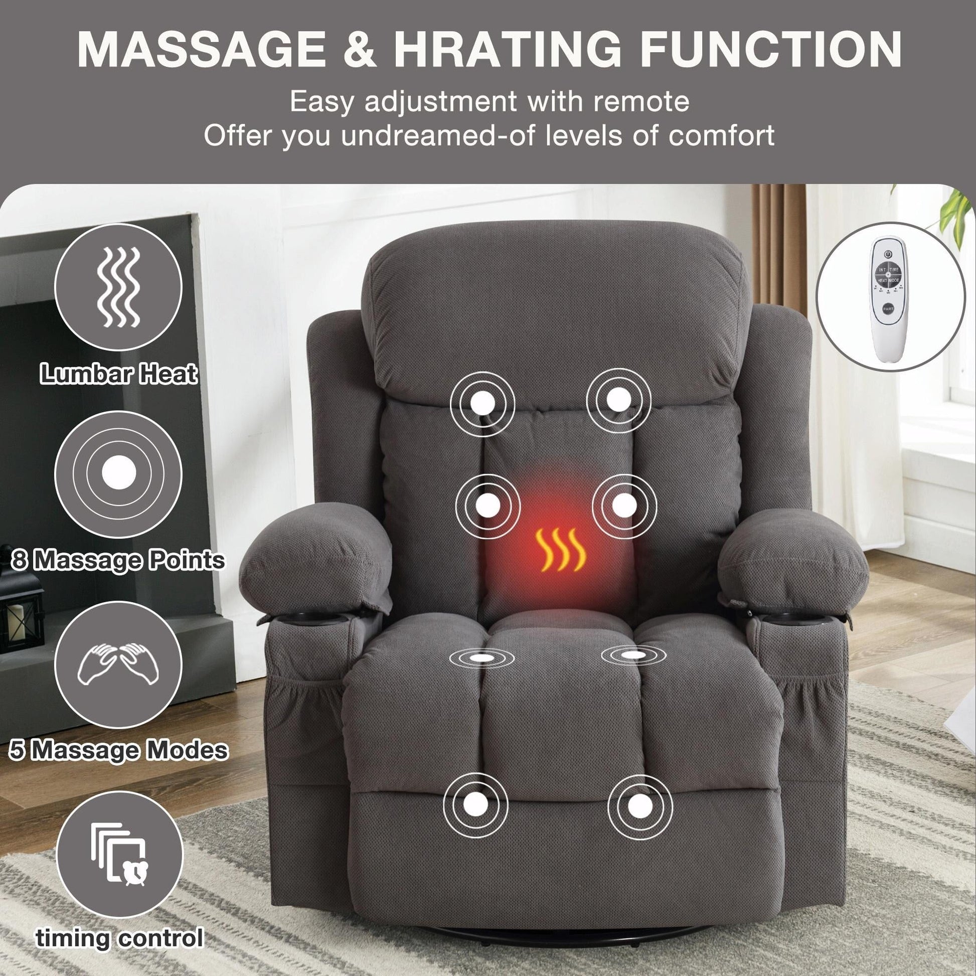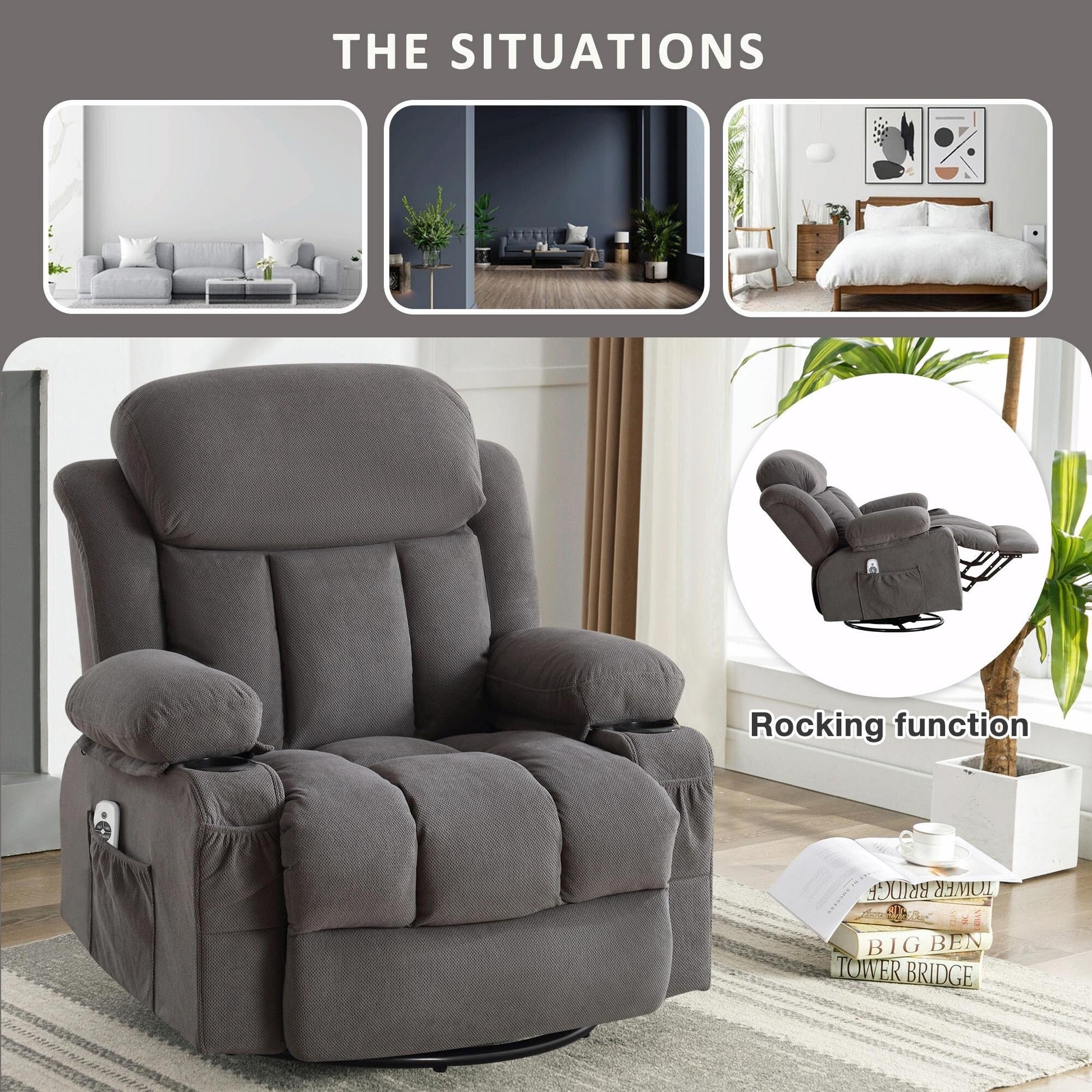 Fauteuil massant chauffant et pivotant, avec port USB et 2 porte-gobelets dans les poches latérales