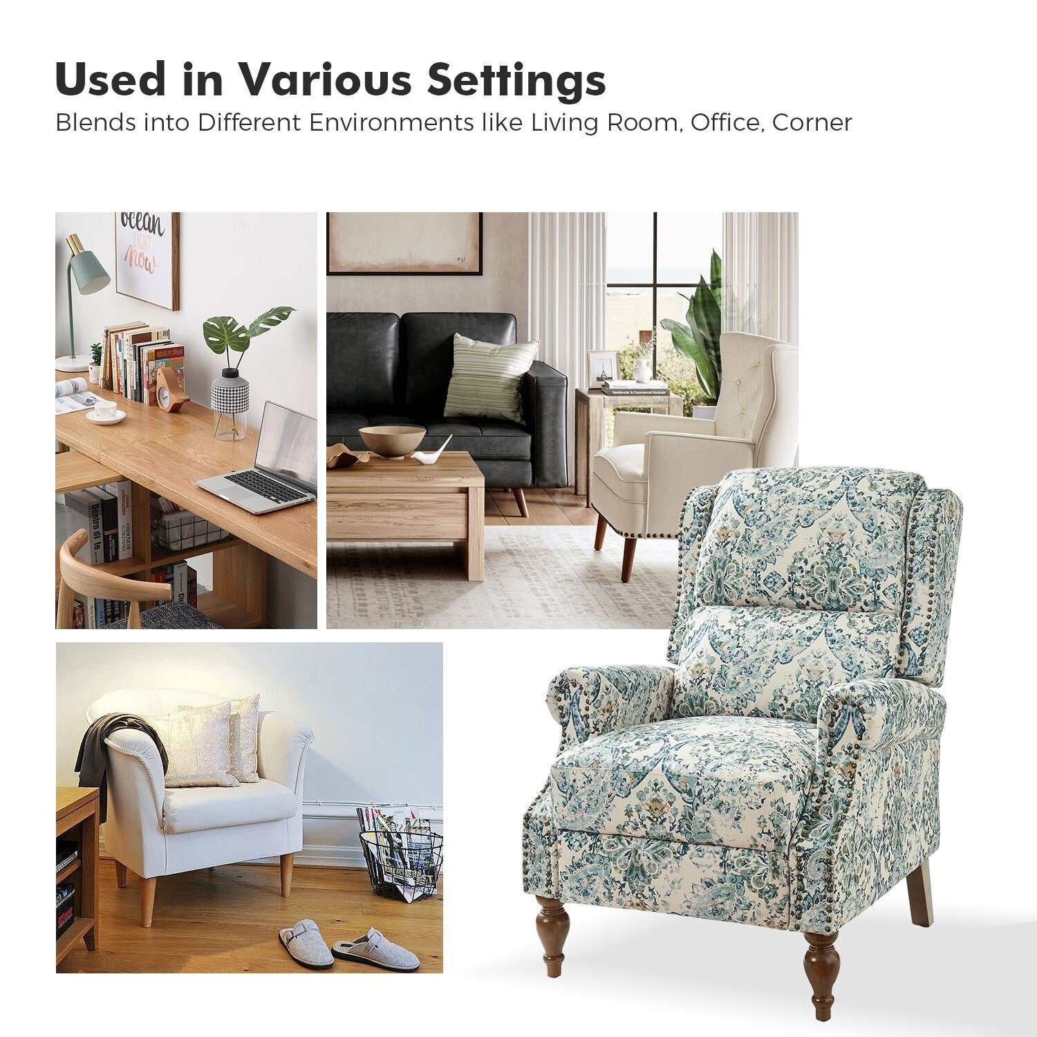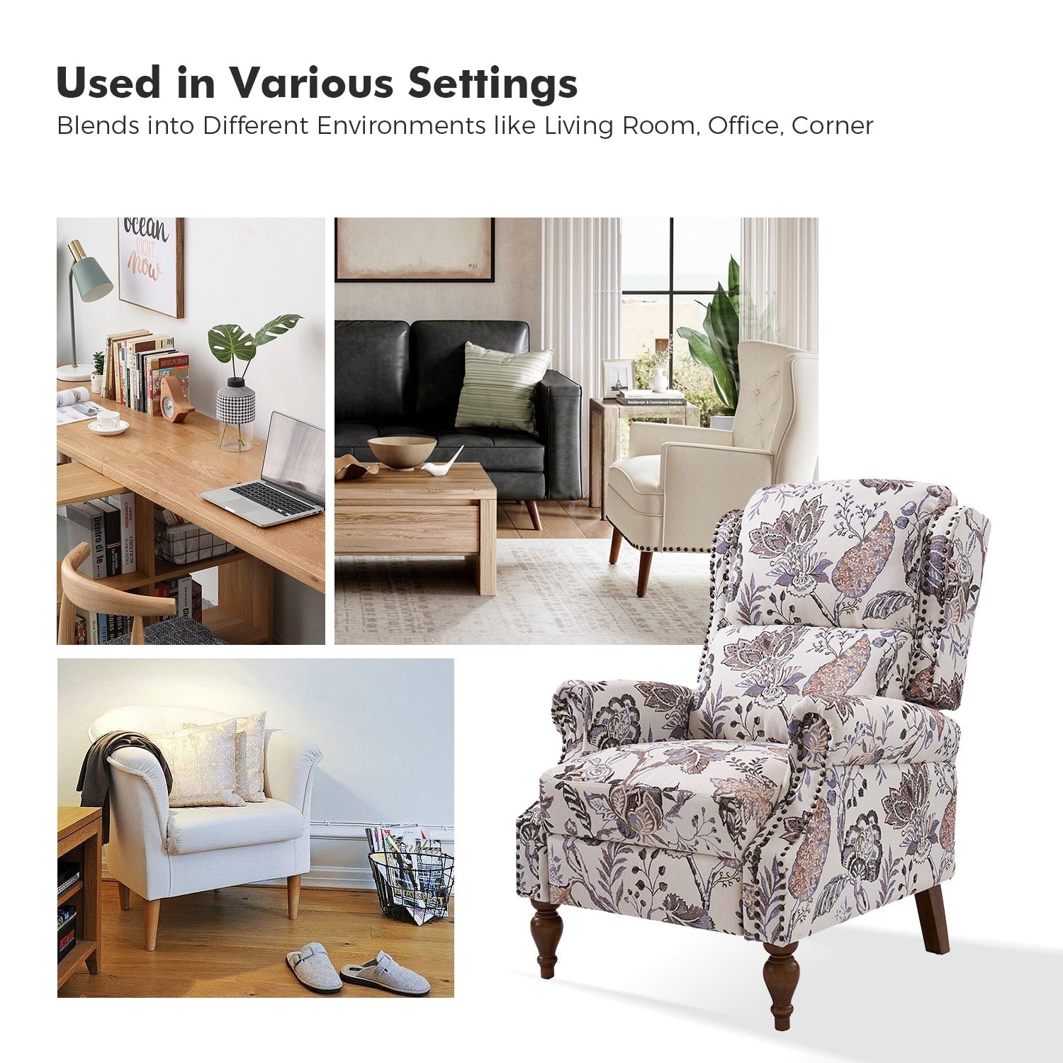 - Pieds en bois massif : Soutenu par des pieds robustes en bois massif, ce fauteuil inclinable offre stabilité et durabilité tandis que la texture et le grain naturels du bois ajoutent de la chaleur au design.