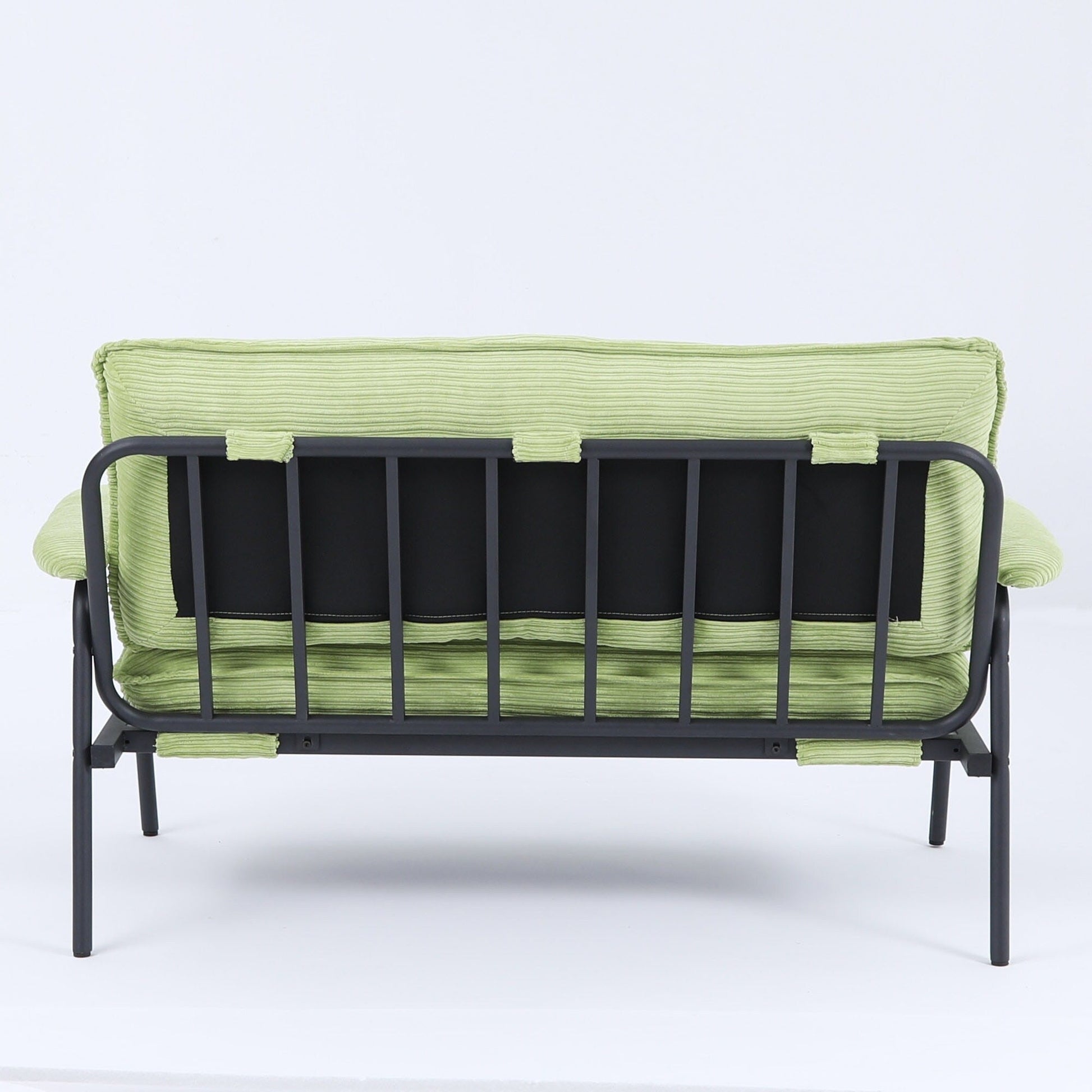 Le design extérieur présente un style simple et moderne. Le tissu rayé vert frais, associé à une structure en métal noir, lui confère une allure naturelle et rafraîchissante. Il s'intègre parfaitement à divers styles de décoration. Le dossier, au design classique capitonné, apporte une touche de raffinement et de charme rétro.