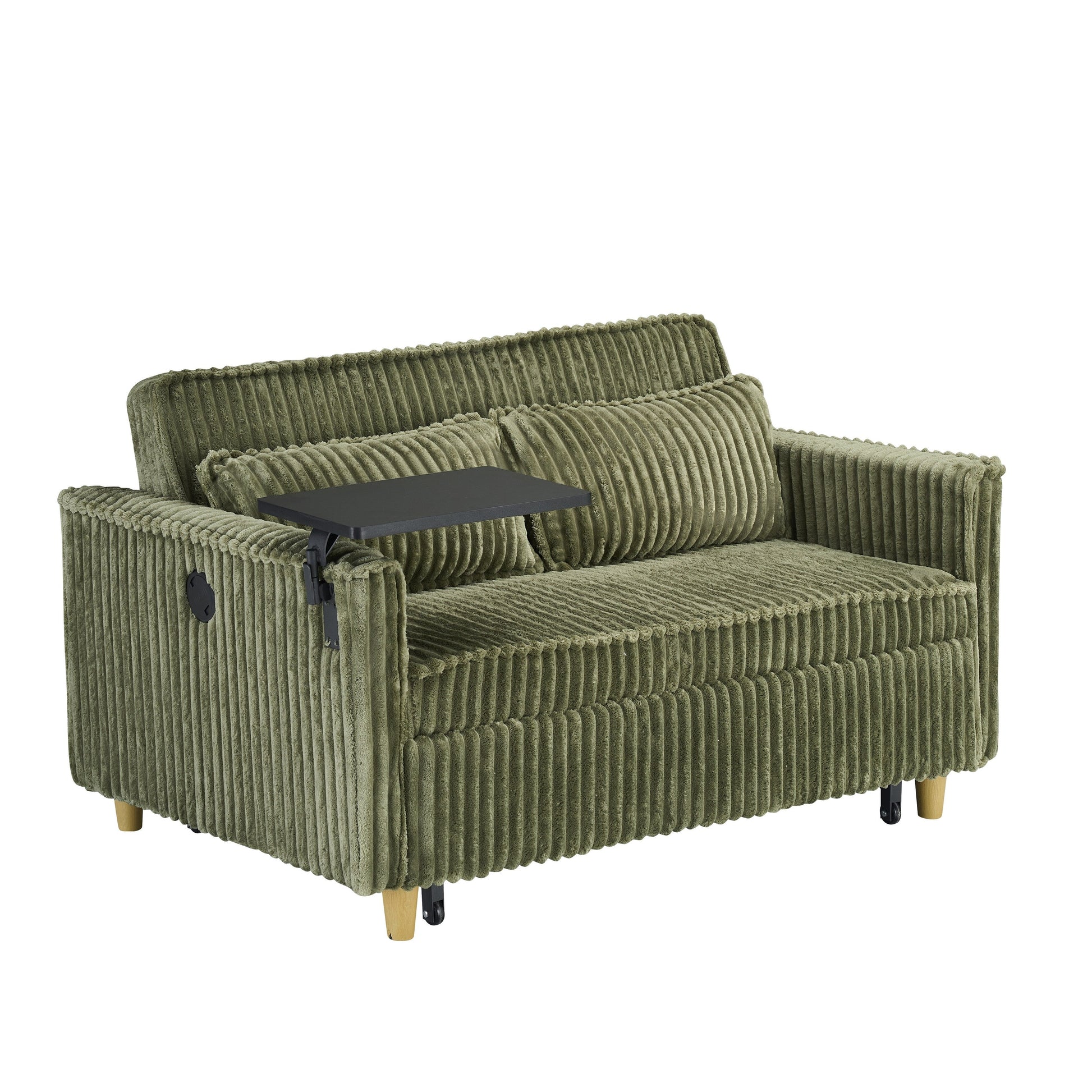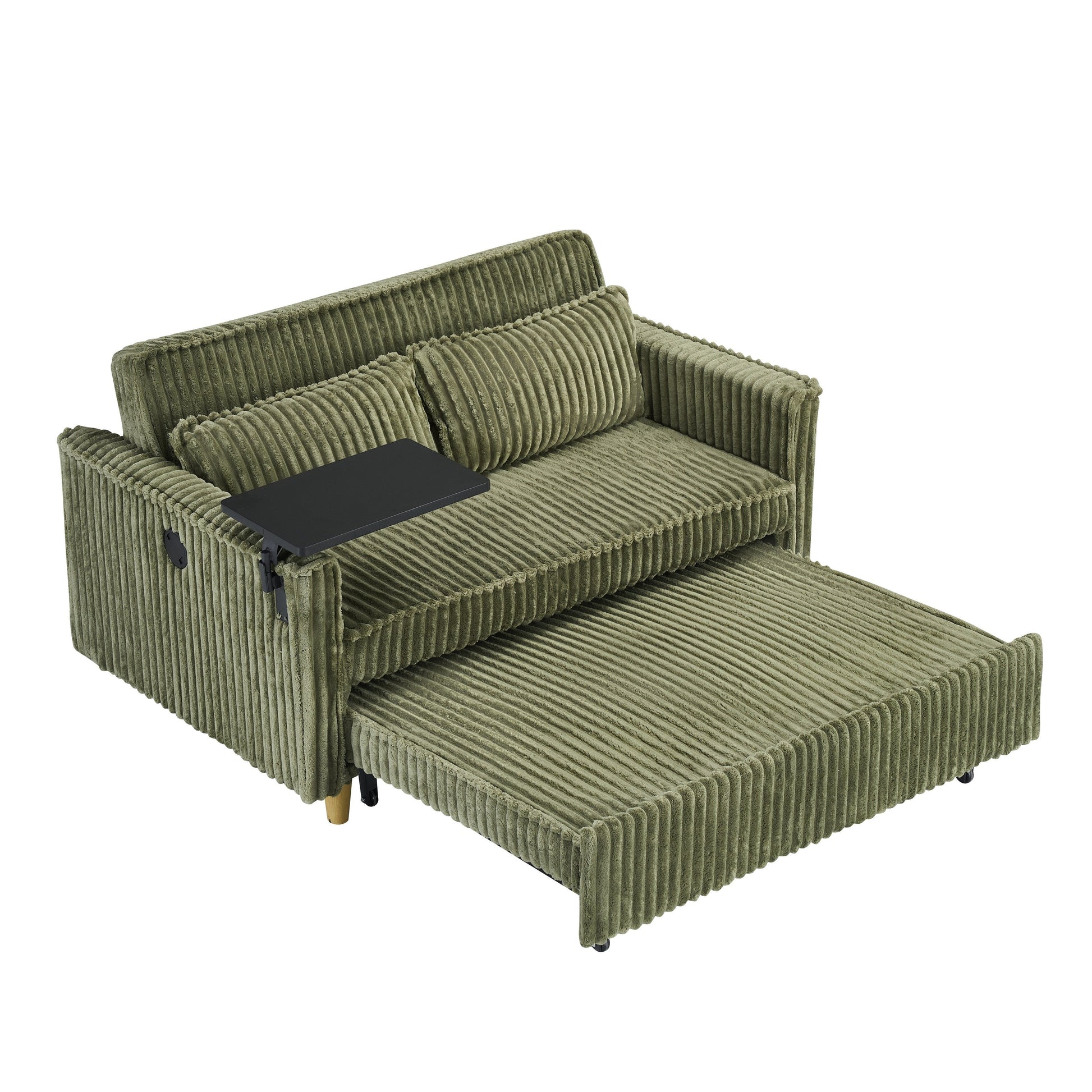 Le canapé est fabriqué en velours côtelé vert de haute qualité, doux, chaud et agréable au toucher. Son design unique, coulissant et inclinable, est remarquable. Grâce à ses roulettes souples situées en bas, il se déploie facilement d'une simple pression et se transforme instantanément en un lit spacieux et confortable, brisant ainsi les contraintes fonctionnelles des meubles traditionnels grâce à ses caractéristiques flexibles et modulables. Un côté de l'accoudoir est ingénieusement équipé d'un plateau amovible, vous permettant de savourer un repas tout en regardant vos séries préférées ou de gérer vos tâches urgentes en télétravail. De plus, un port USB est judicieusement placé sur le côté droit du canapé. Ainsi, lorsque vous êtes allongé sur le canapé pour regarder des séries ou jouer à des jeux, vous n'avez plus à vous soucier de la batterie de votre téléphone. Vous pouvez le recharger à tout moment et profiter d'un divertissement ininterrompu, vous plongeant pleinement dans un moment de détente et de confort.