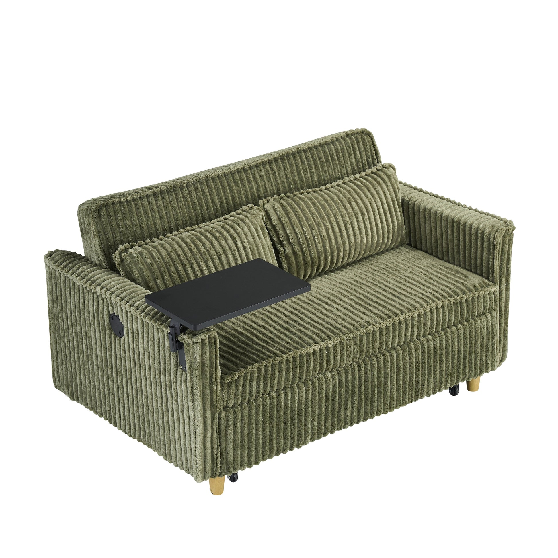 Canapé en velours côtelé vert avec plateau mobile qui peut être tiré et poussé et a une double fonction.