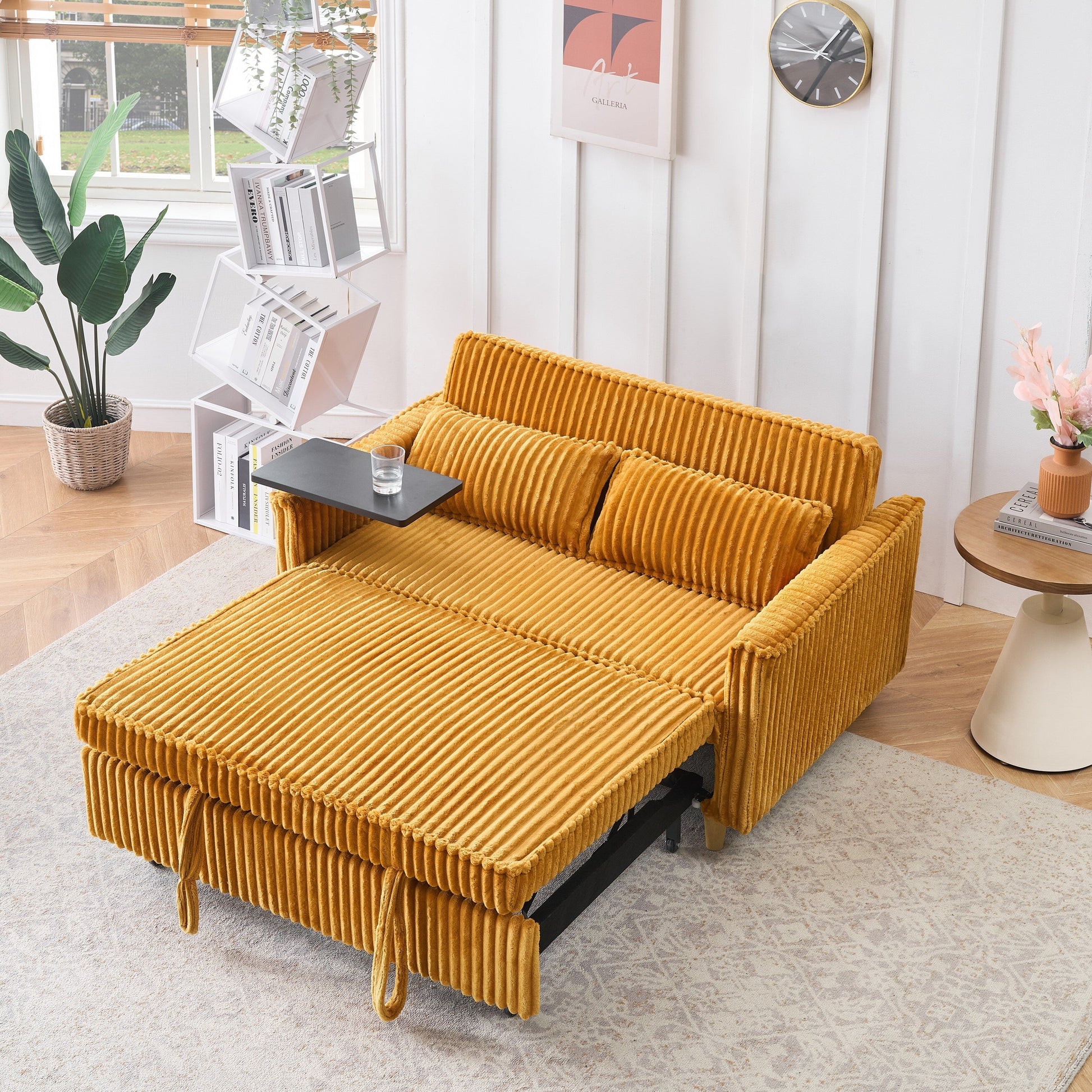 Le canapé gigogne en velours côtelé à double fonction, équipé d'un plateau mobile et de ports USB, convient