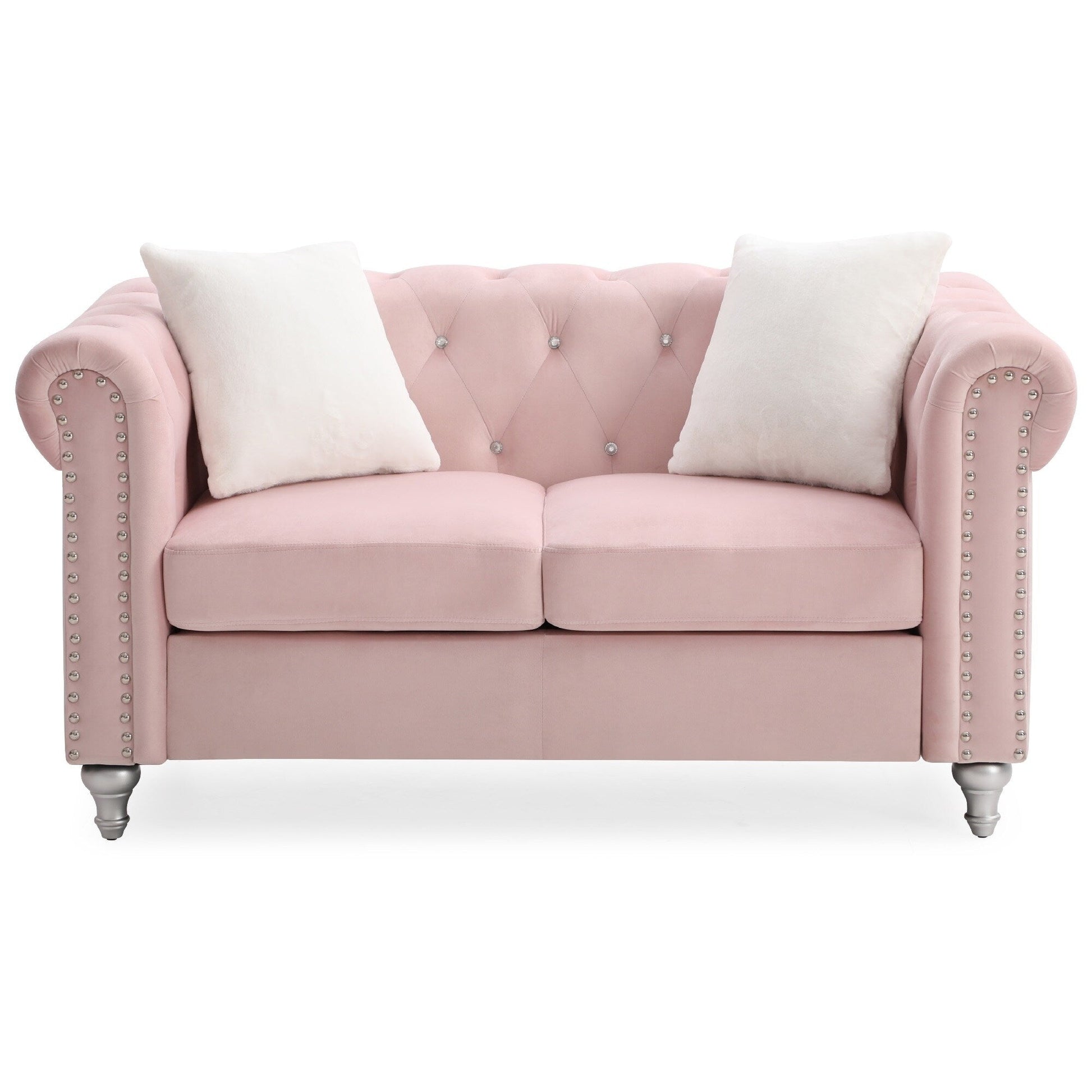 Canapé 2 places capitonné en velours imitation bijou avec coussins décoratifs - 60 - Rose