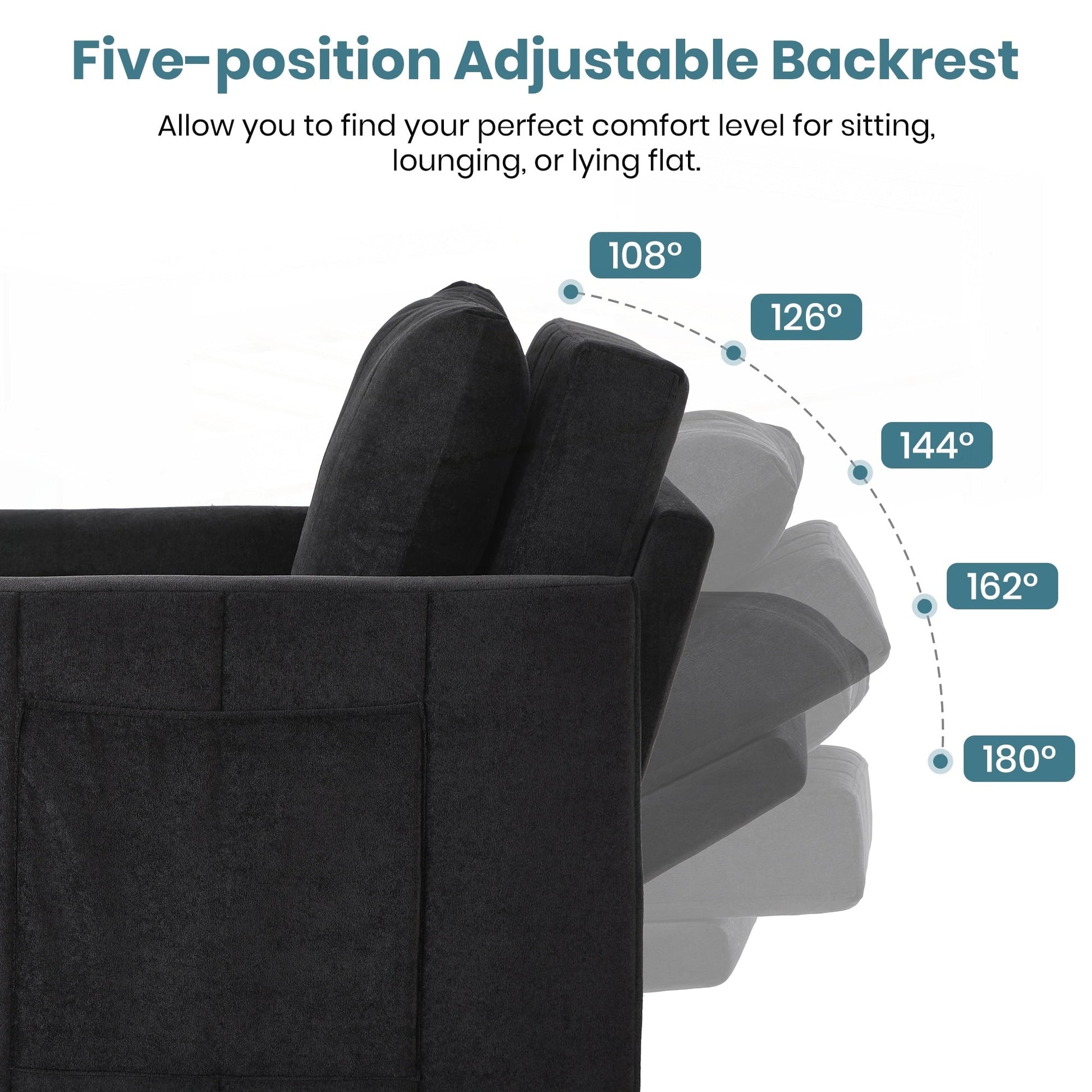 Cinq positions d'inclinaison réglables - Le dossier de ce canapé-lit est doté d'une fonction d'inclinaison unique sur cinq positions (108°, 126°, 144°, 162° et 180°), vous permettant de trouver l'angle de confort idéal. Que vous préfériez vous asseoir droit pour lire ou regarder la télévision, ou vous incliner complètement pour une sieste réparatrice, le dossier s'ajuste facilement à vos préférences.
