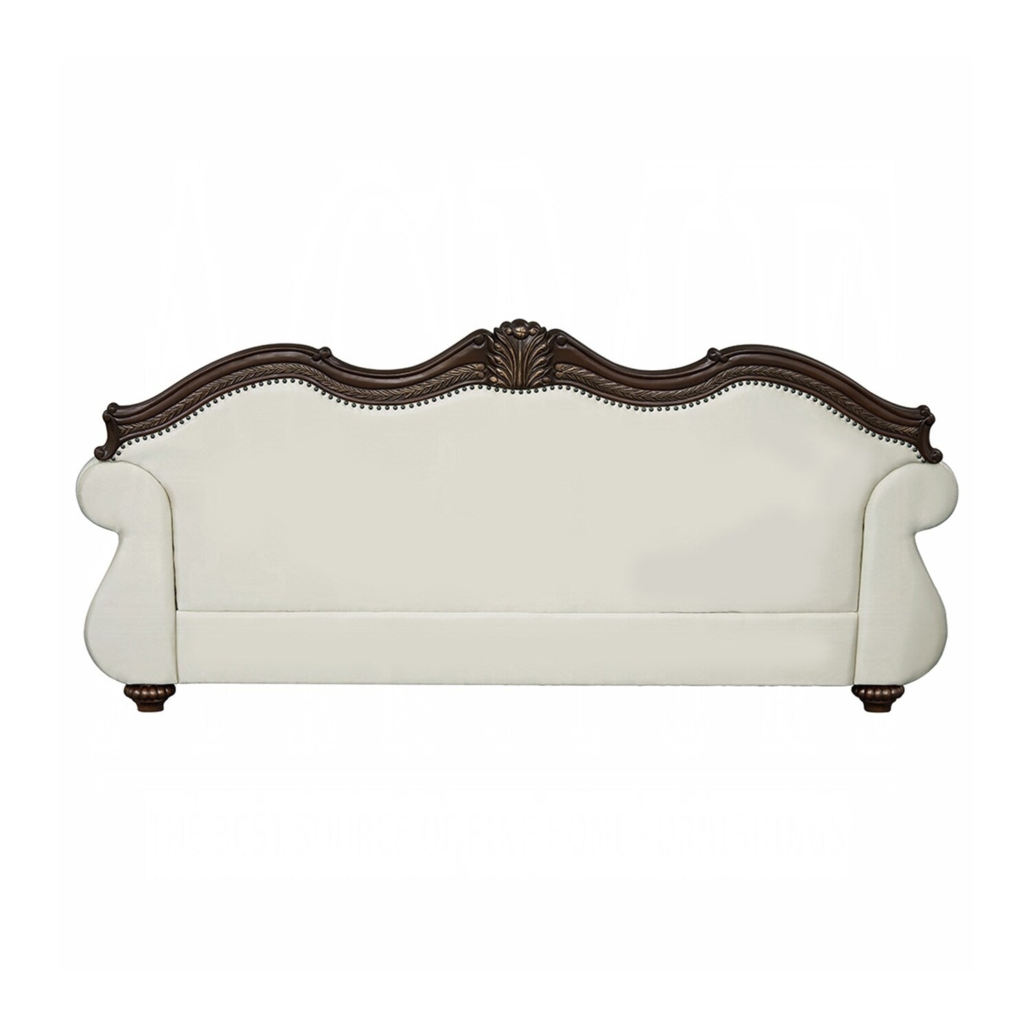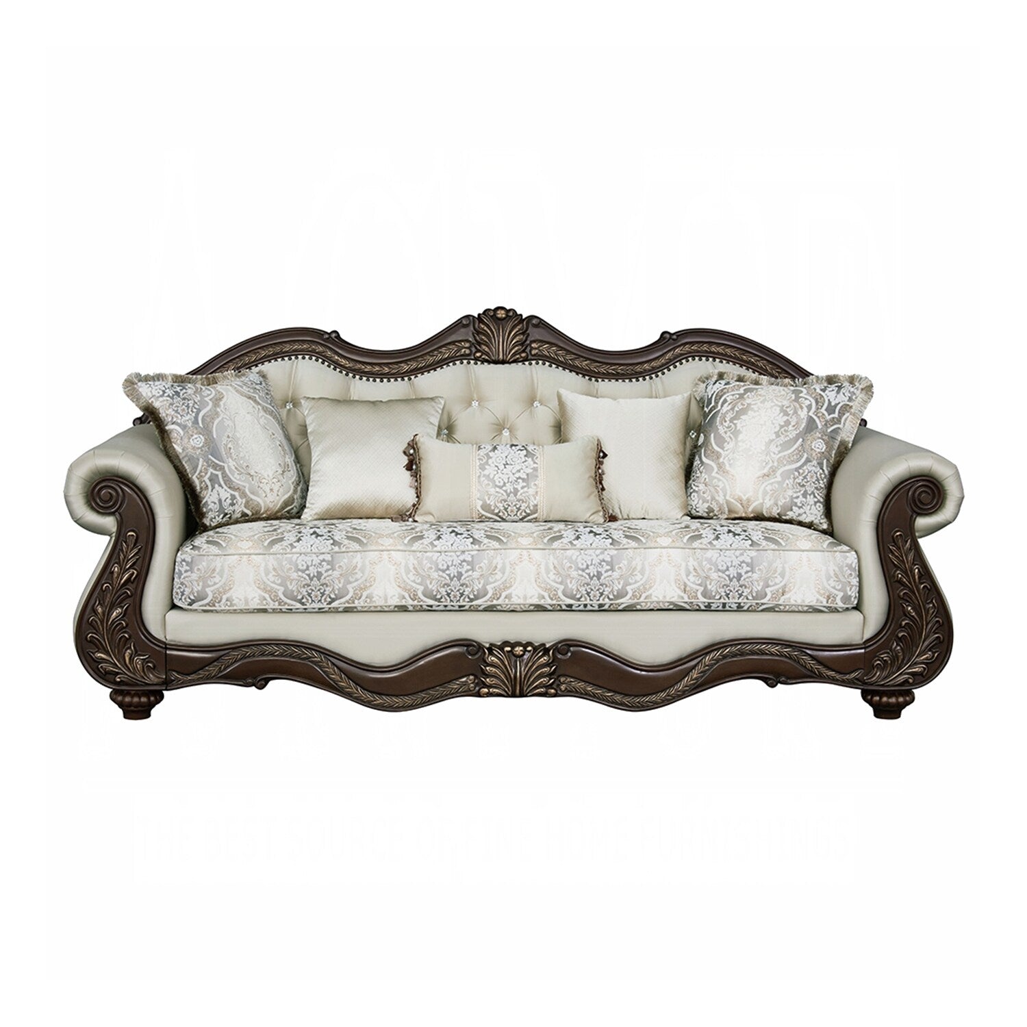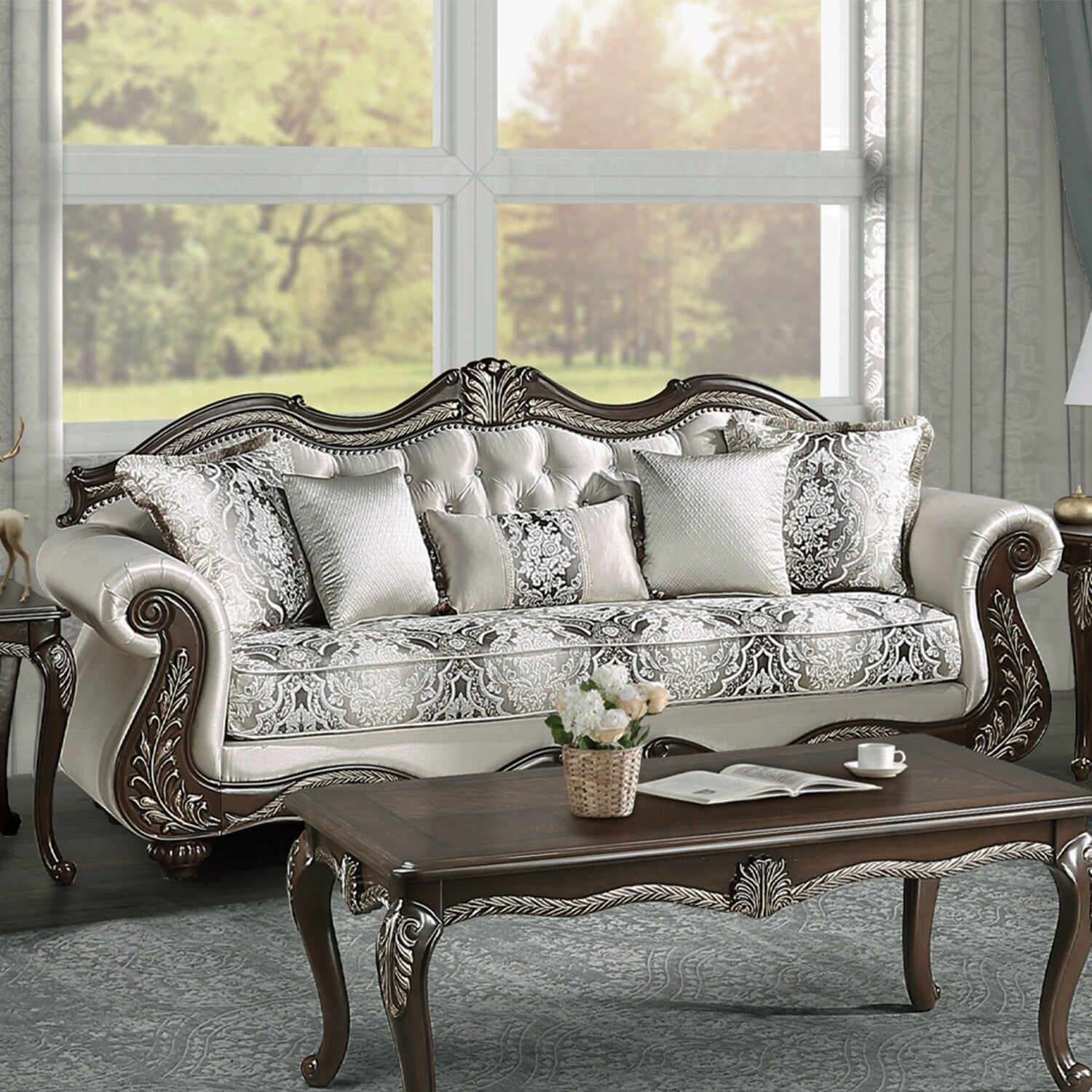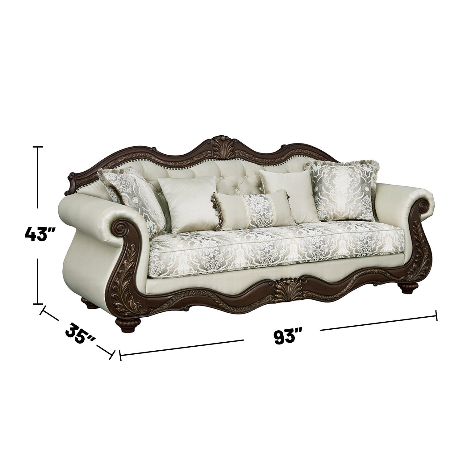 Ce canapé apporte une élégance intemporelle à votre salon grâce à son tissu beige et sa finition cerisier. Il est doté de coussins de dossier fermes et d'assise amovibles à ressorts ensachés pour un confort optimal. Son cadre intérieur en bois garantit sa durabilité, tandis que le capitonnage à boutons et la bordure florale du tablier et des pieds ajoutent une touche de sophistication. Accompagné de coussins décoratifs, ce canapé allie à la perfection charme classique et confort moderne.