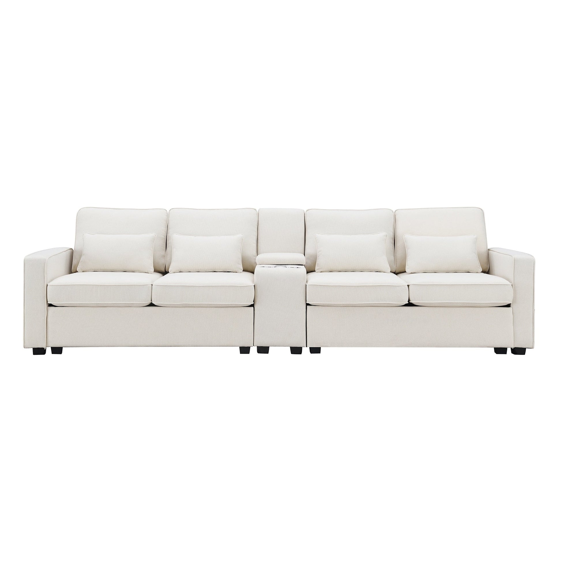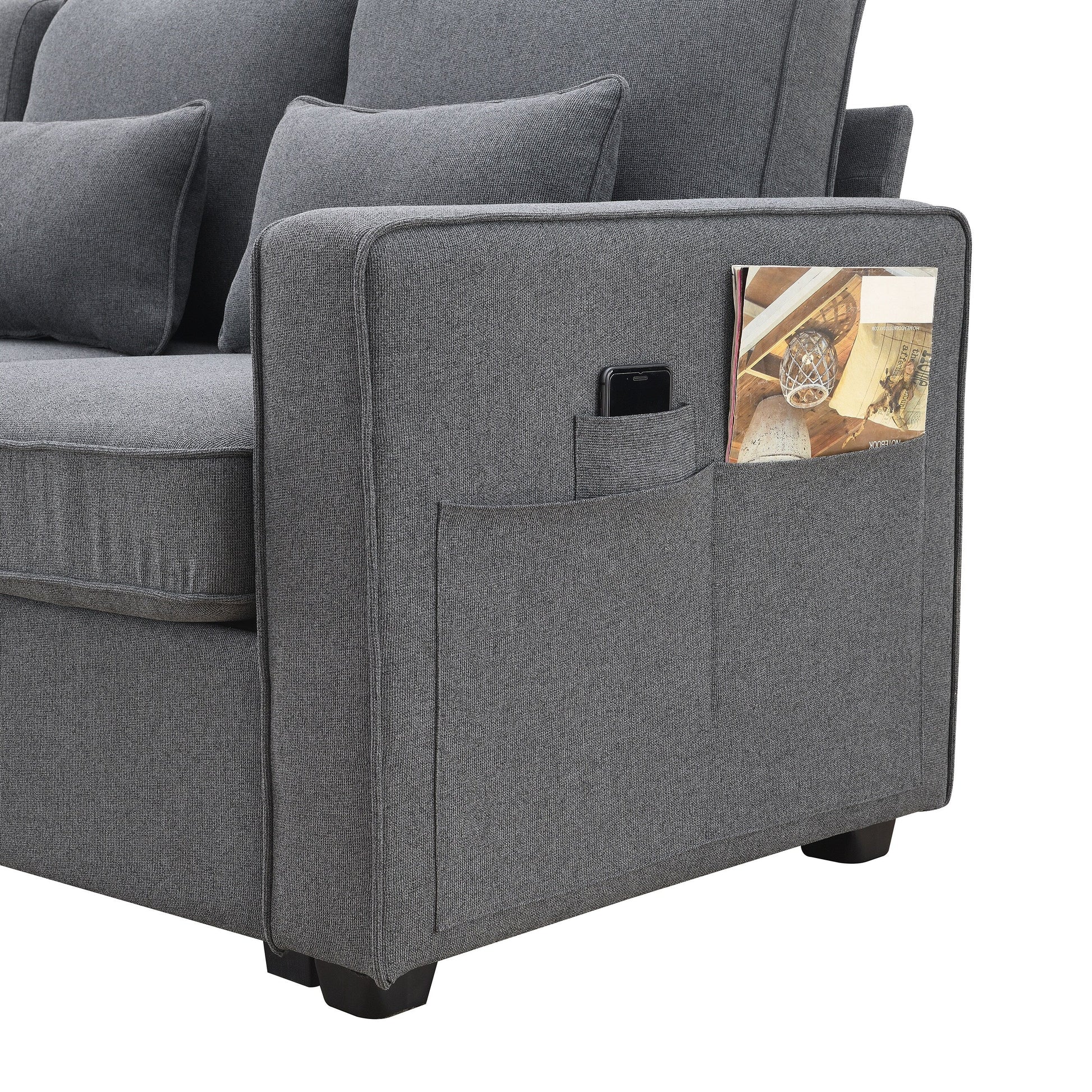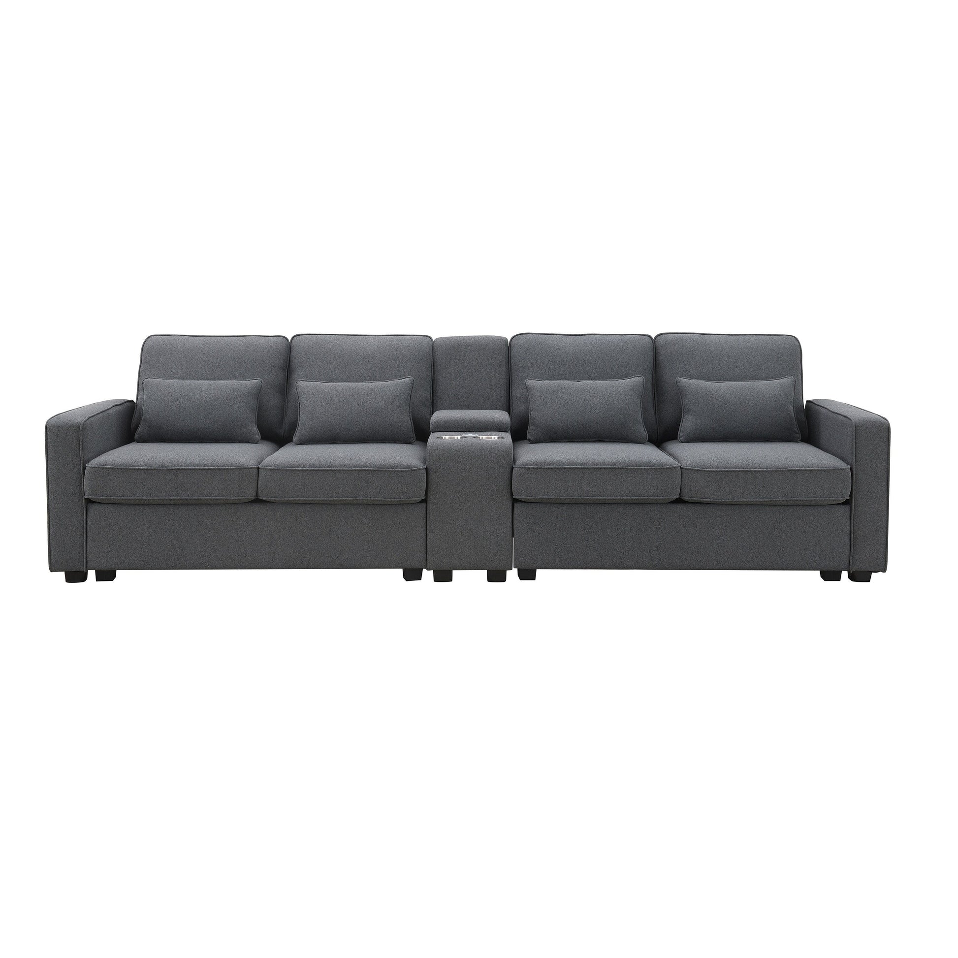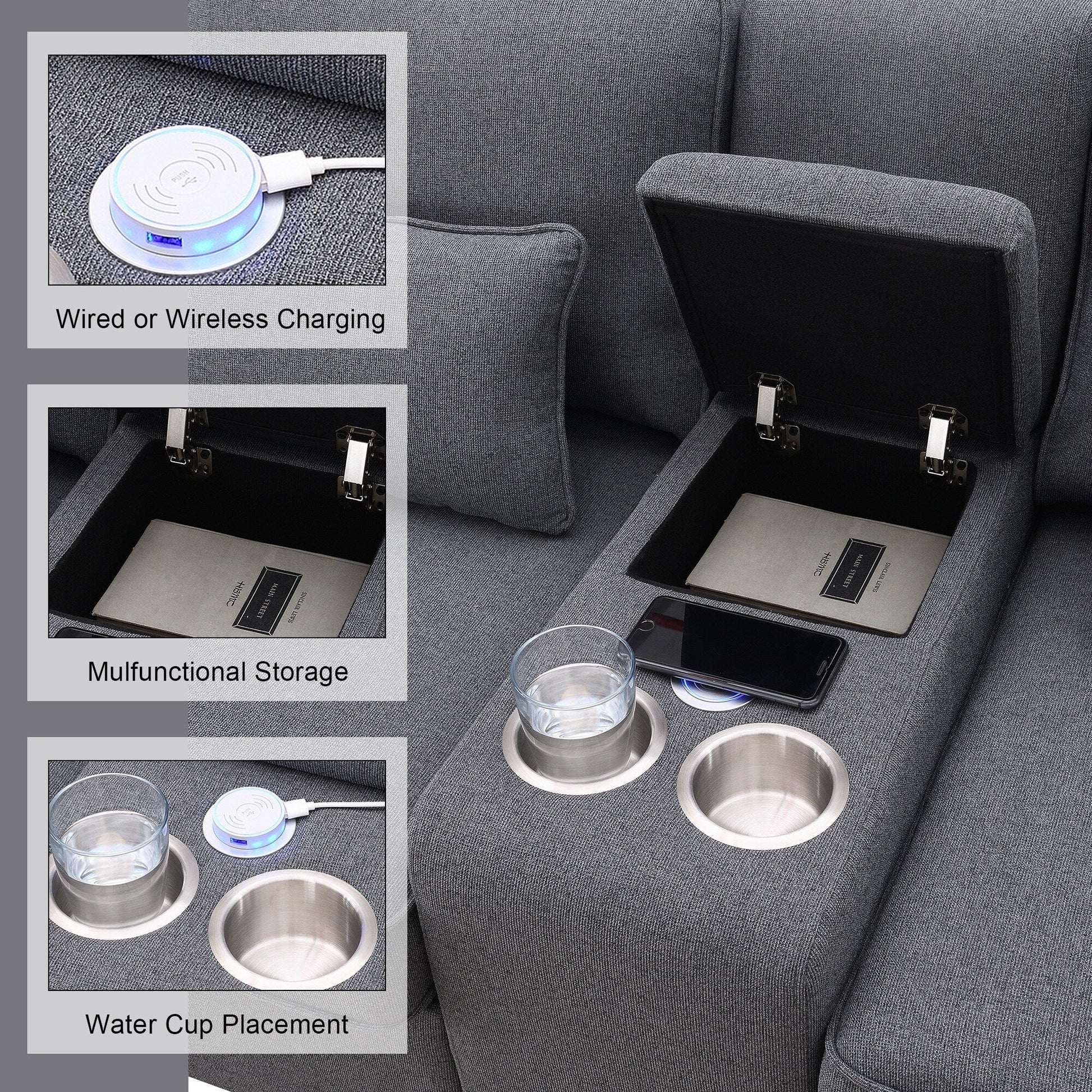 Canapé rembourré avec console, 2 porte-gobelets et 2 ports USB, chargement filaire ou sans fil, canapés en lin avec 4 coussins