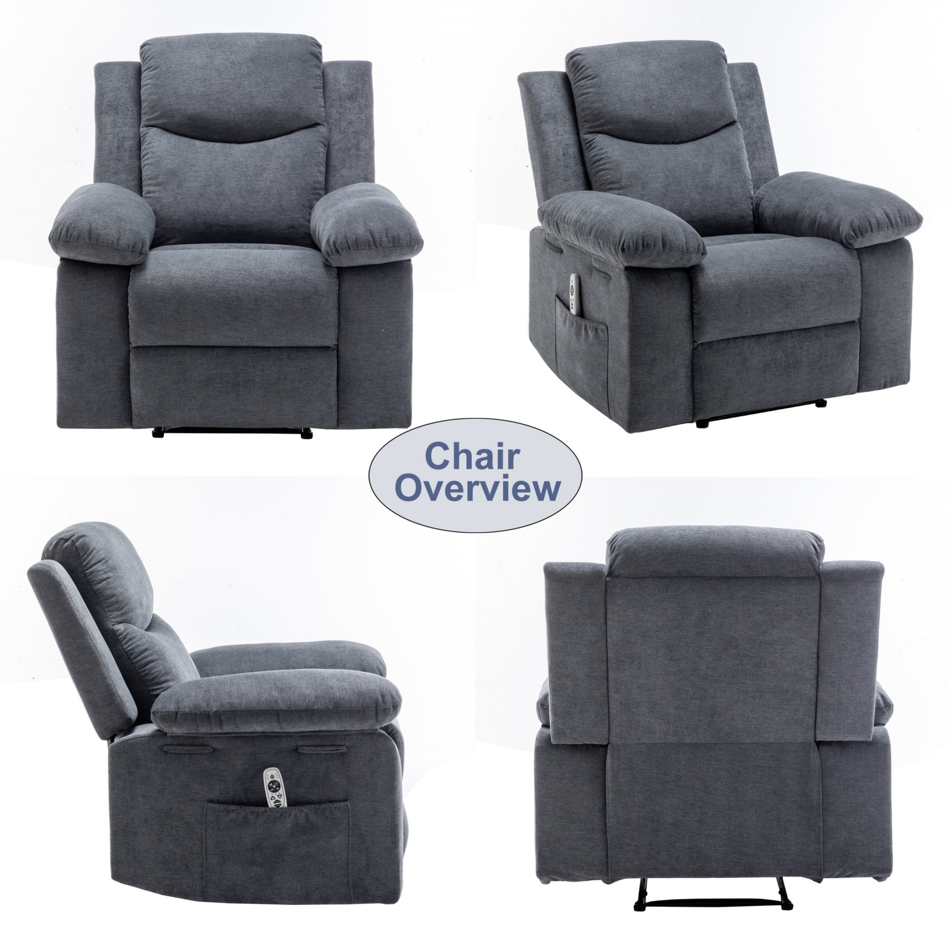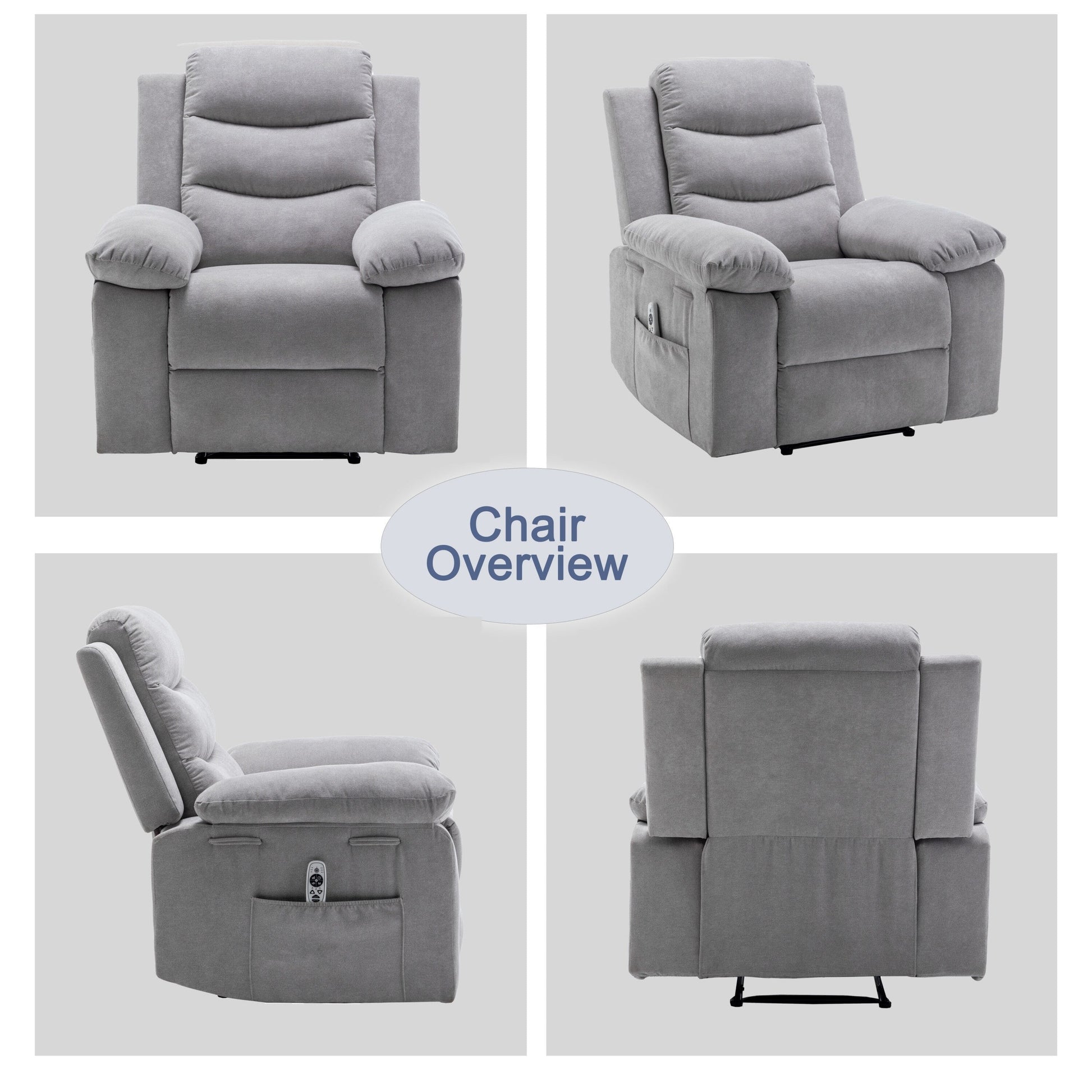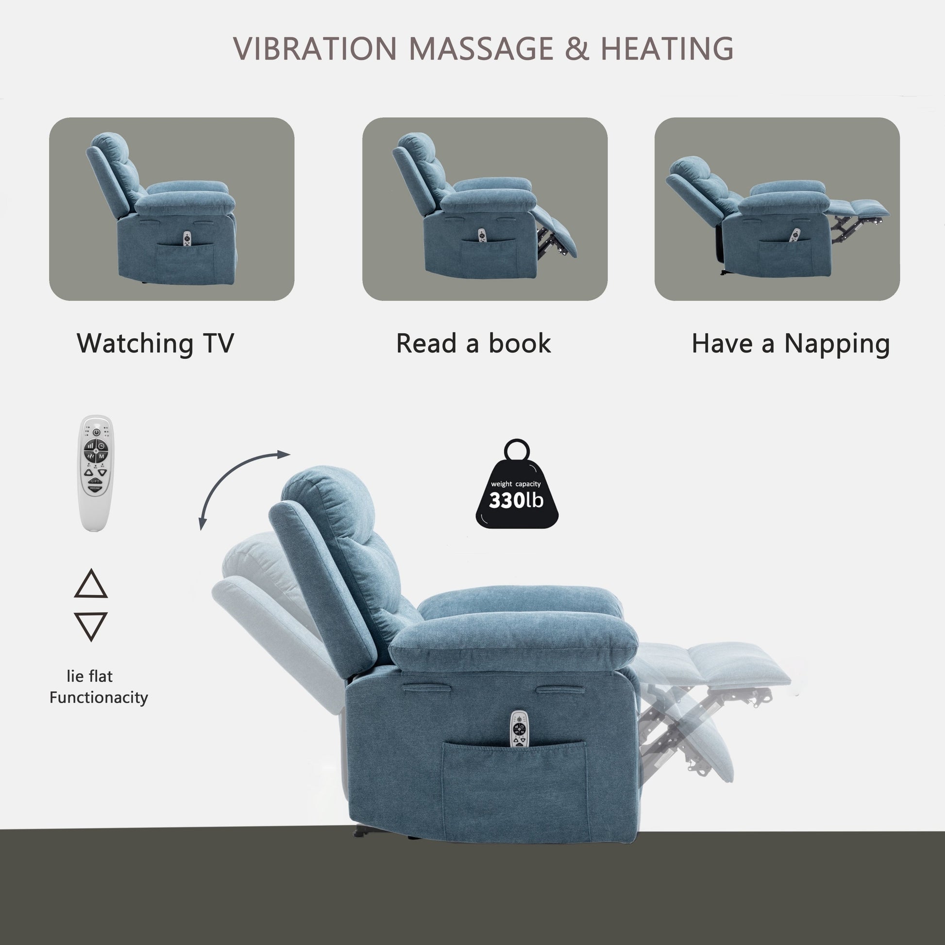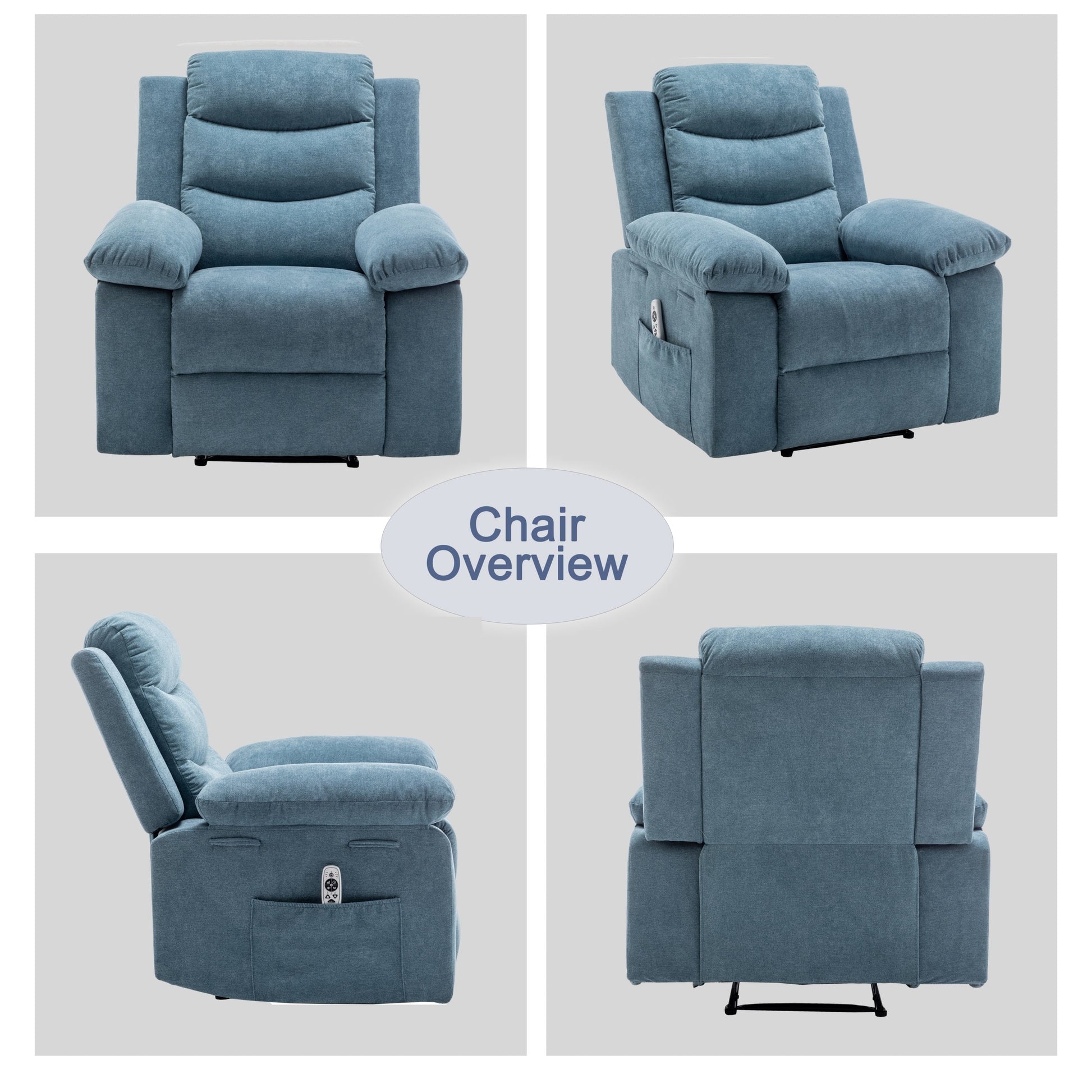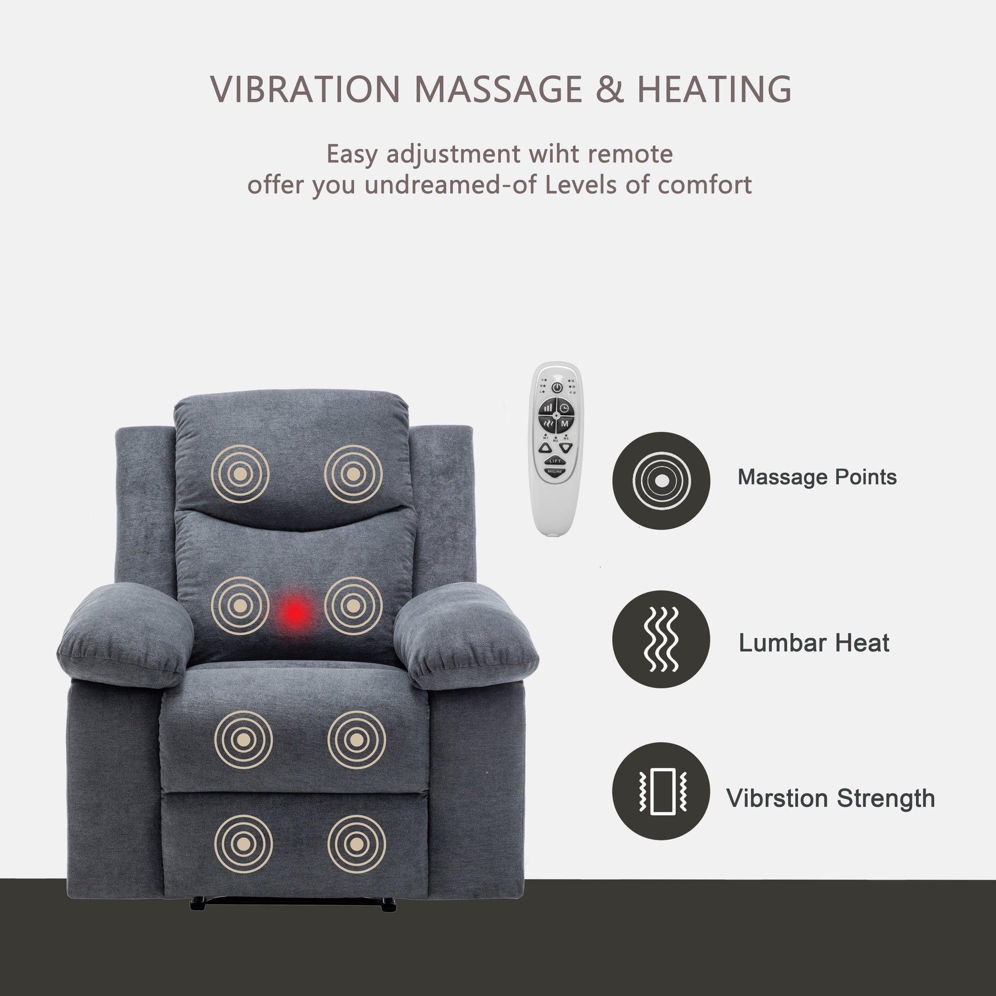 - Massage par vibrations et chauffage : Ce fauteuil inclinable électrique chauffant et massant dispose de 8 points de massage et de trois modes différents pour répondre à vos différents besoins. Les quatre zones de massage sont réparties sur les mollets, les cuisses, la taille et les épaules. Le chauffage de la taille avec point de massage vous permet de stimuler la circulation sanguine pendant le massage et de ressentir une douce chaleur enveloppante.