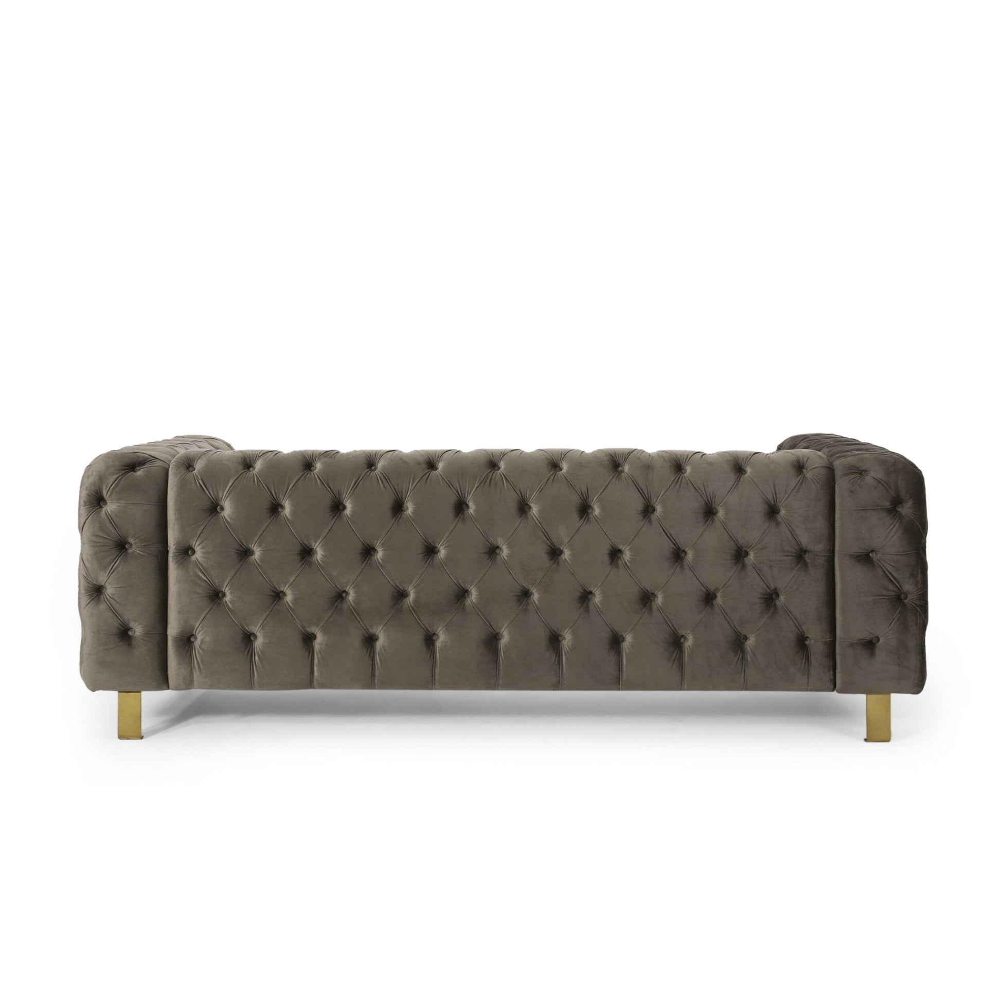 Le canapé Modern Glam en velours capitonné allie à la perfection luxe et confort. Avec ses magnifiques accoudoirs style smoking et ses coutures en losanges capitonnées, ce canapé dégage un style glamour et moderne qui s'harmonise parfaitement avec des lignes droites et épurées et un velours doux. Le velours 100 % polyester offre une douceur et un éclat uniques, une résistance aux plis et une durabilité exceptionnelle. Les pieds en fer, rehaussés d'une superbe finition dorée, garantissent une durabilité exceptionnelle et ajoutent une touche d'élégance. Que vous souhaitiez rénover votre salon ou ajouter une touche d'élégance, ce canapé transformera votre espace grâce à son design élégant et confortable.