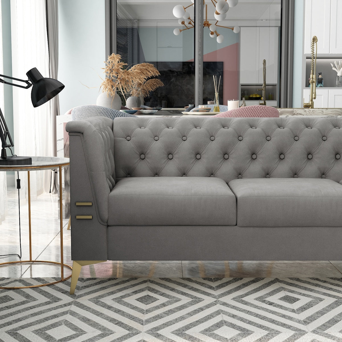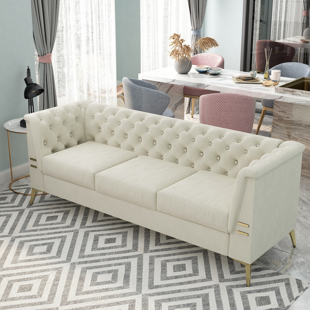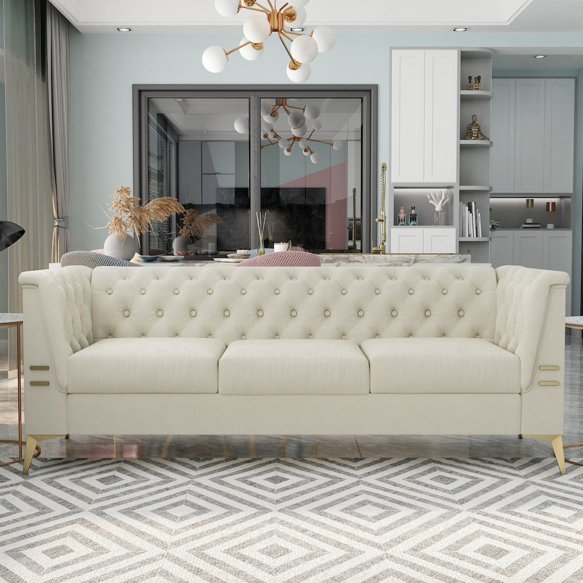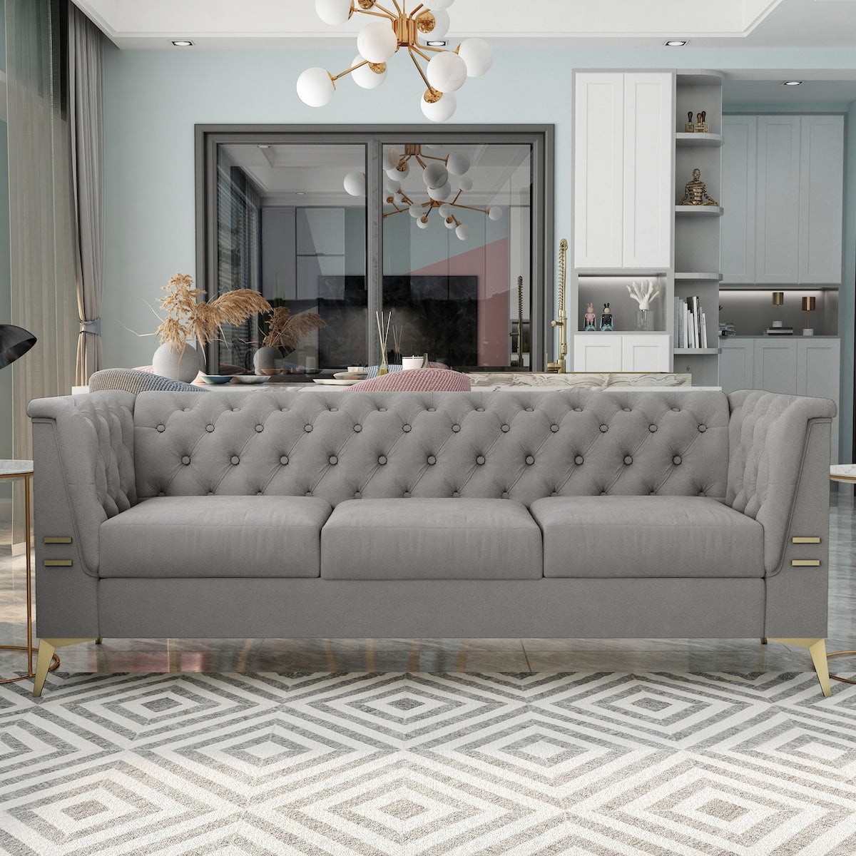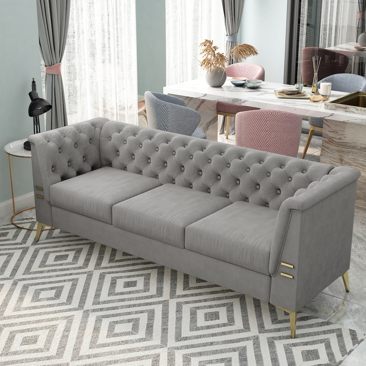 Canapé 3 places rembourré en velours, canapé de salon moderne avec capitonnage à boutons profonds et pieds en métal, accoudoirs carrés
