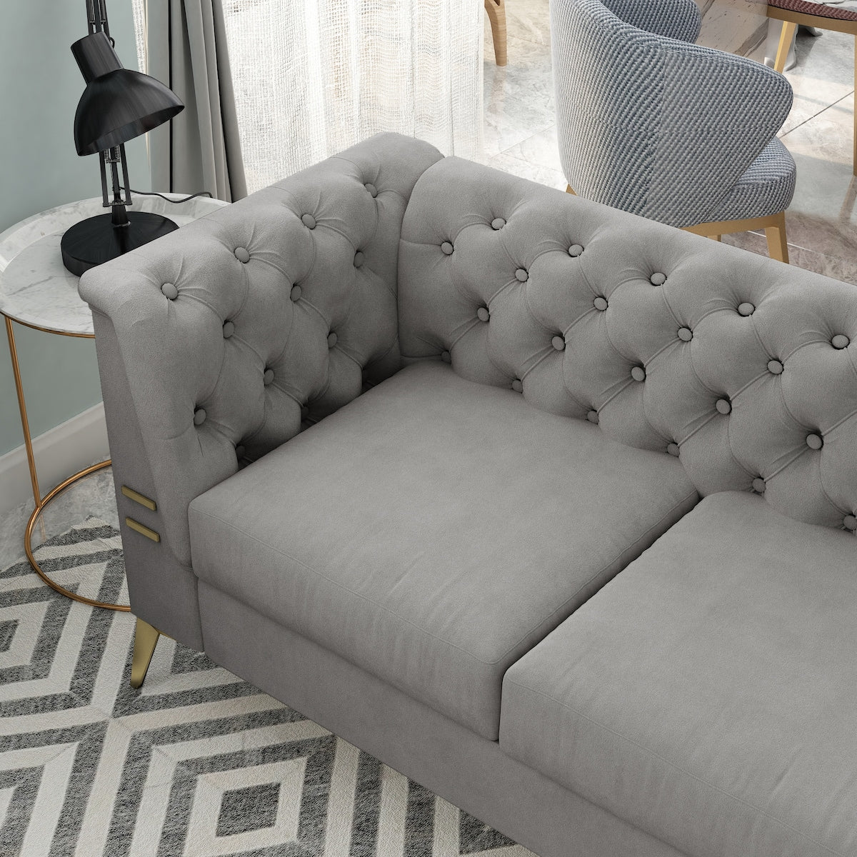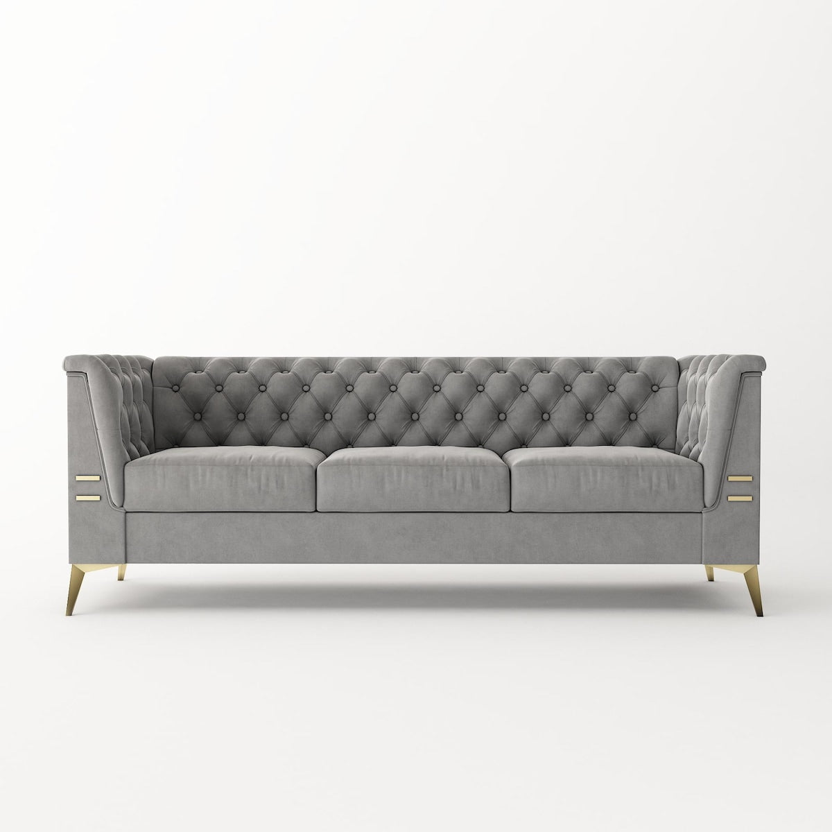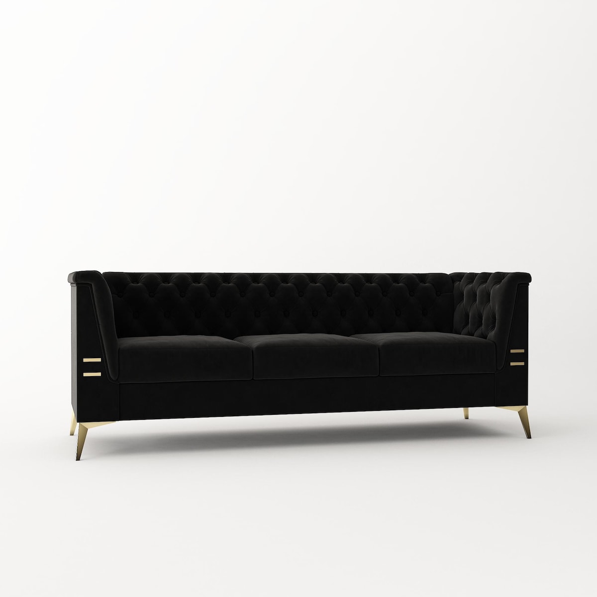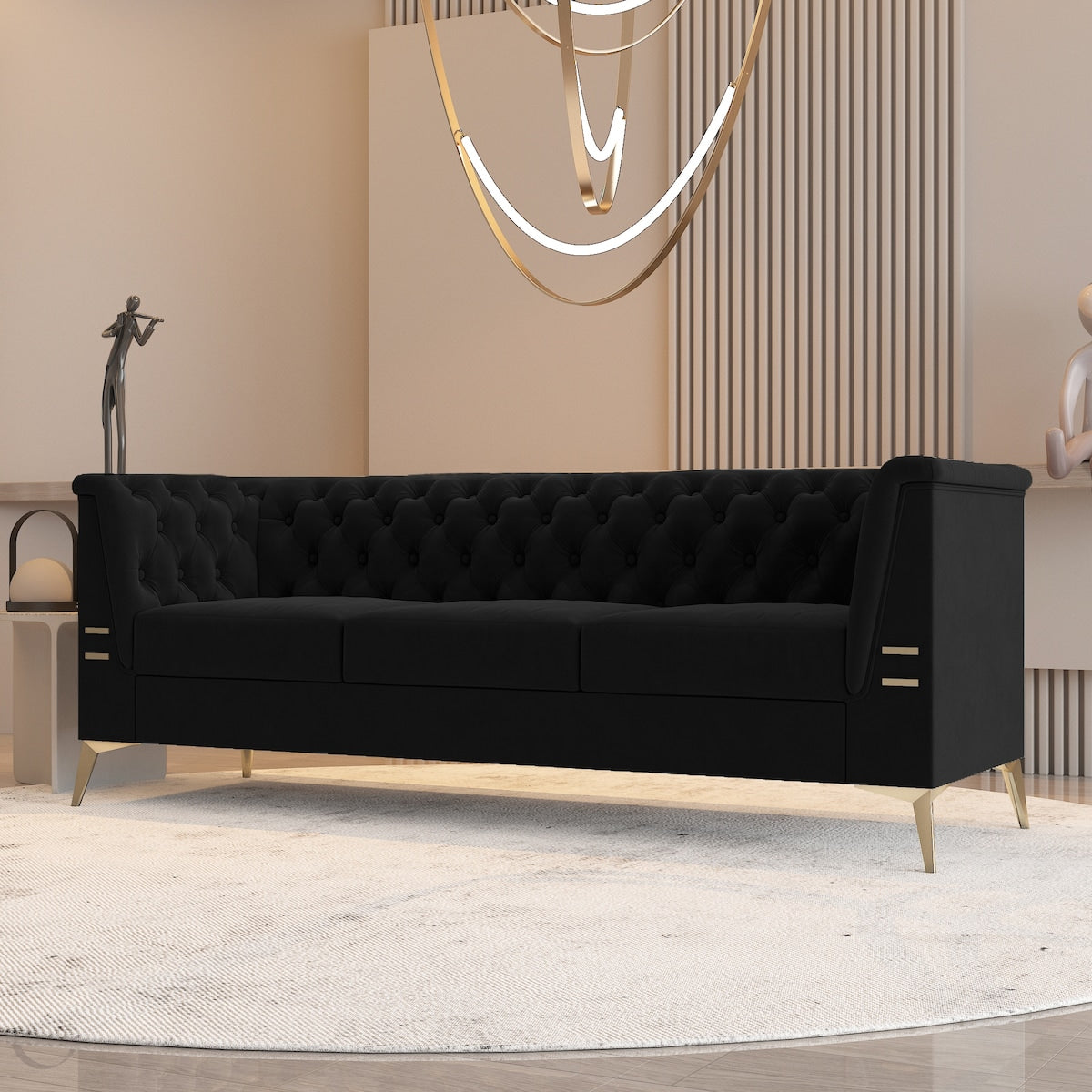 Canapé 3 places rembourré en velours, canapé de salon moderne avec capitonnage à boutons profonds et pieds en métal, accoudoirs carrés