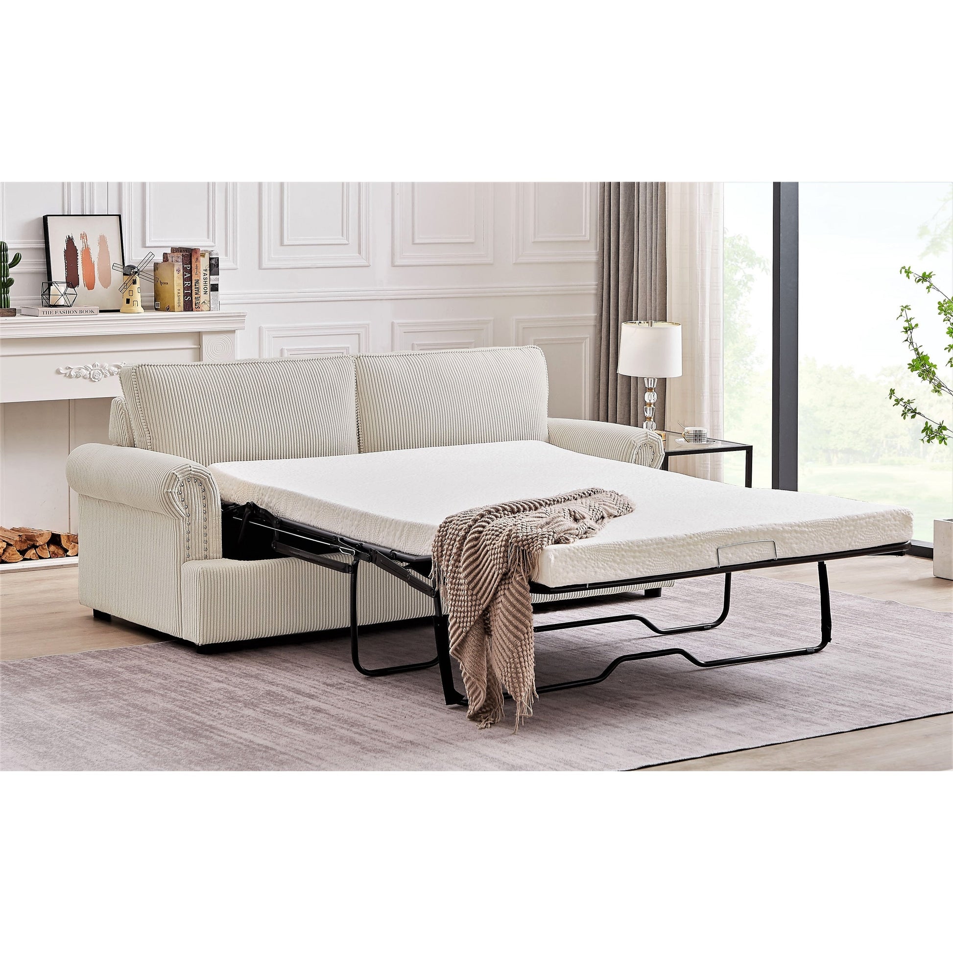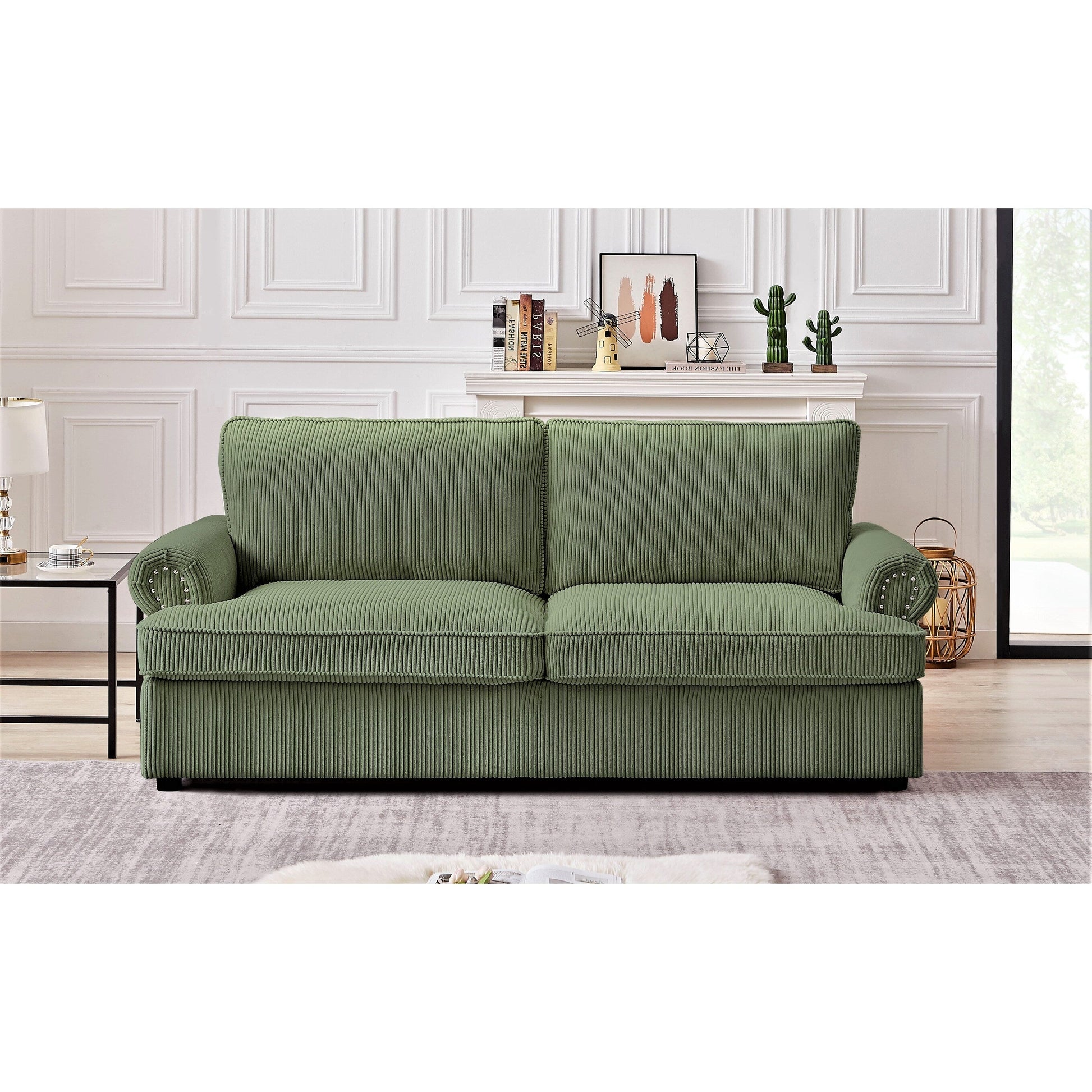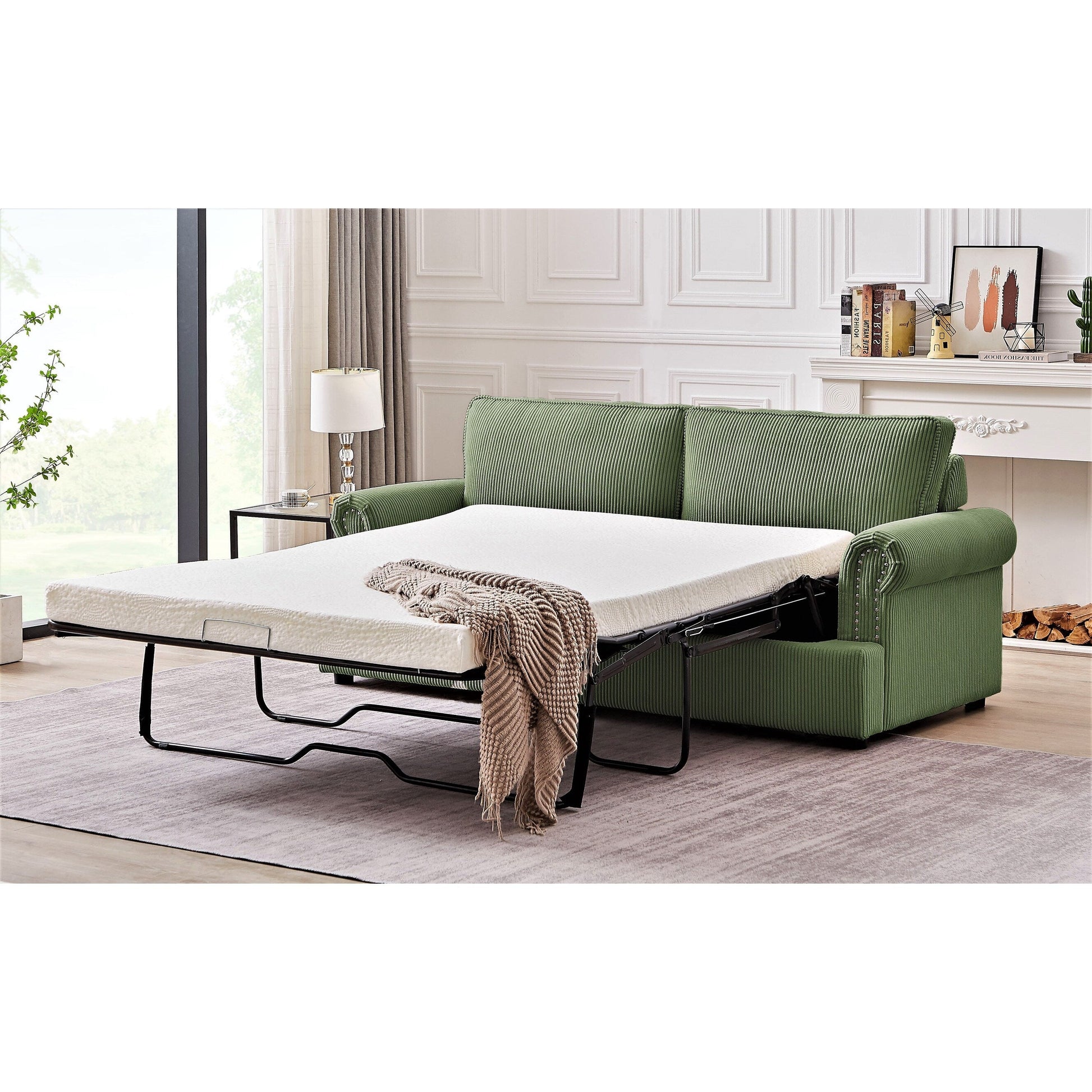 Agrémentez votre salon avec ce canapé-lit, doté d'accoudoirs ronds classiques et de dossiers rembourrés. Il se transforme en lit queen-size, idéal pour accueillir vos invités. Ce canapé-lit, avec ses coussins garnis de mousse, son matelas, sa structure en bois et son mécanisme en métal, lui confère robustesse et durabilité. Il offre un espace de couchage supplémentaire et une touche glamour à votre salon. Revêtu de velours côtelé, il vous offre confort et repos. Son matelas en mousse haute densité vous offrira un repos relaxant. Il convient aussi bien à un usage résidentiel que commercial. Ce canapé-lit est livré avec un lit gigogne équipé d'un matelas en mousse. Le mécanisme est en acier épais, ce qui lui confère une charge maximale de 225 kg. La qualité de fabrication du coussin d'assise assure confort et soutien à chaque fois que vous vous asseyez.