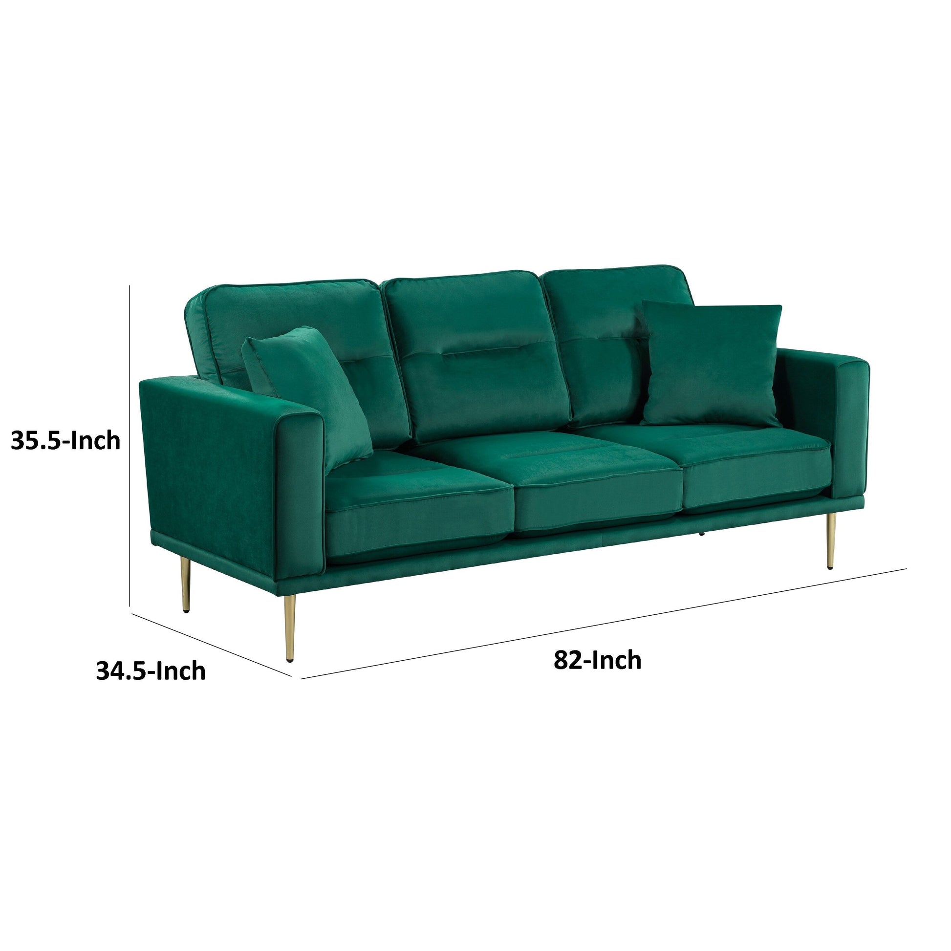 Canapé Voxo, assise rembourrée en velours vert, deux coussins décoratifs, 82 pouces