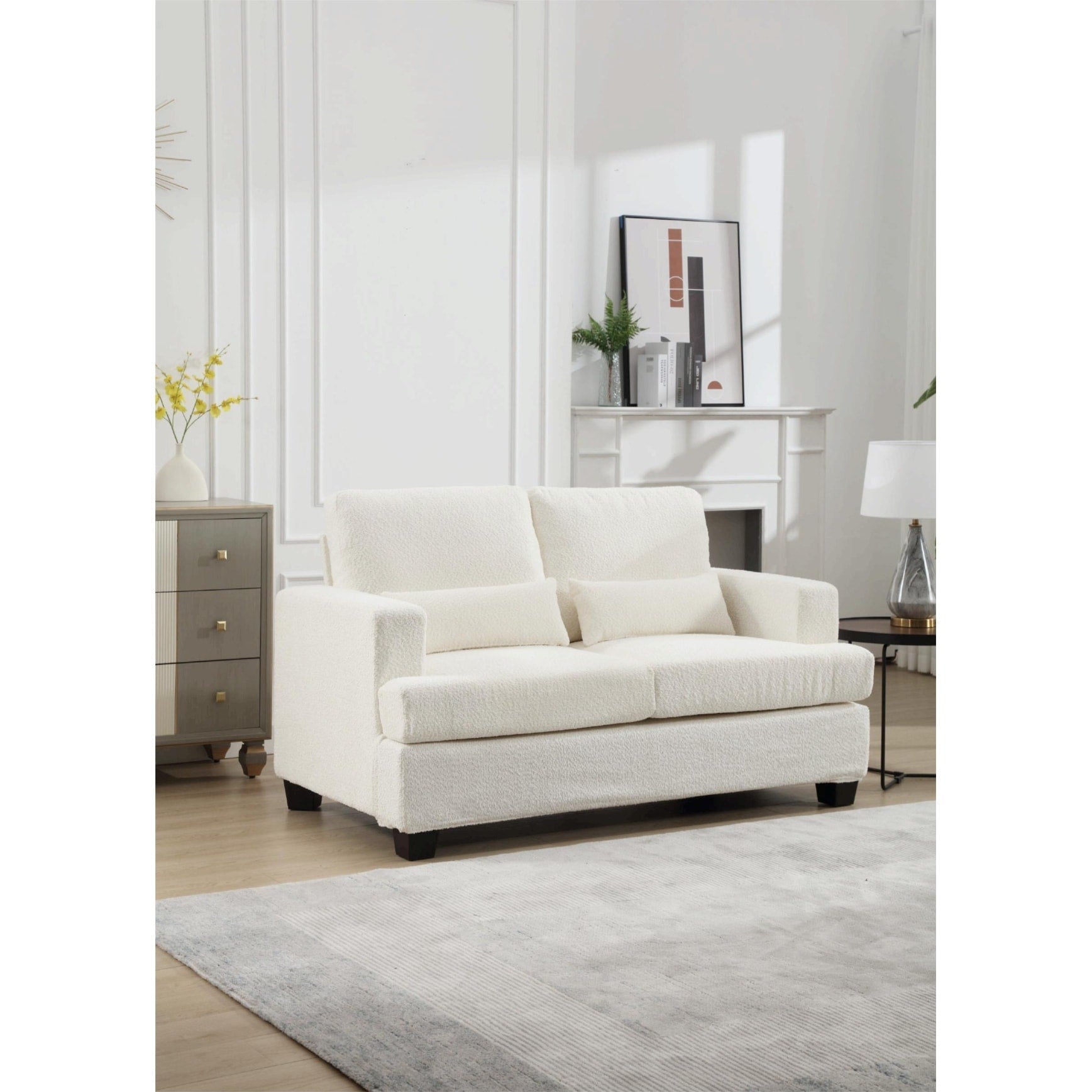 Canapé 2 places en tissu blanc de 63 pouces avec assise profonde et 3 coussins