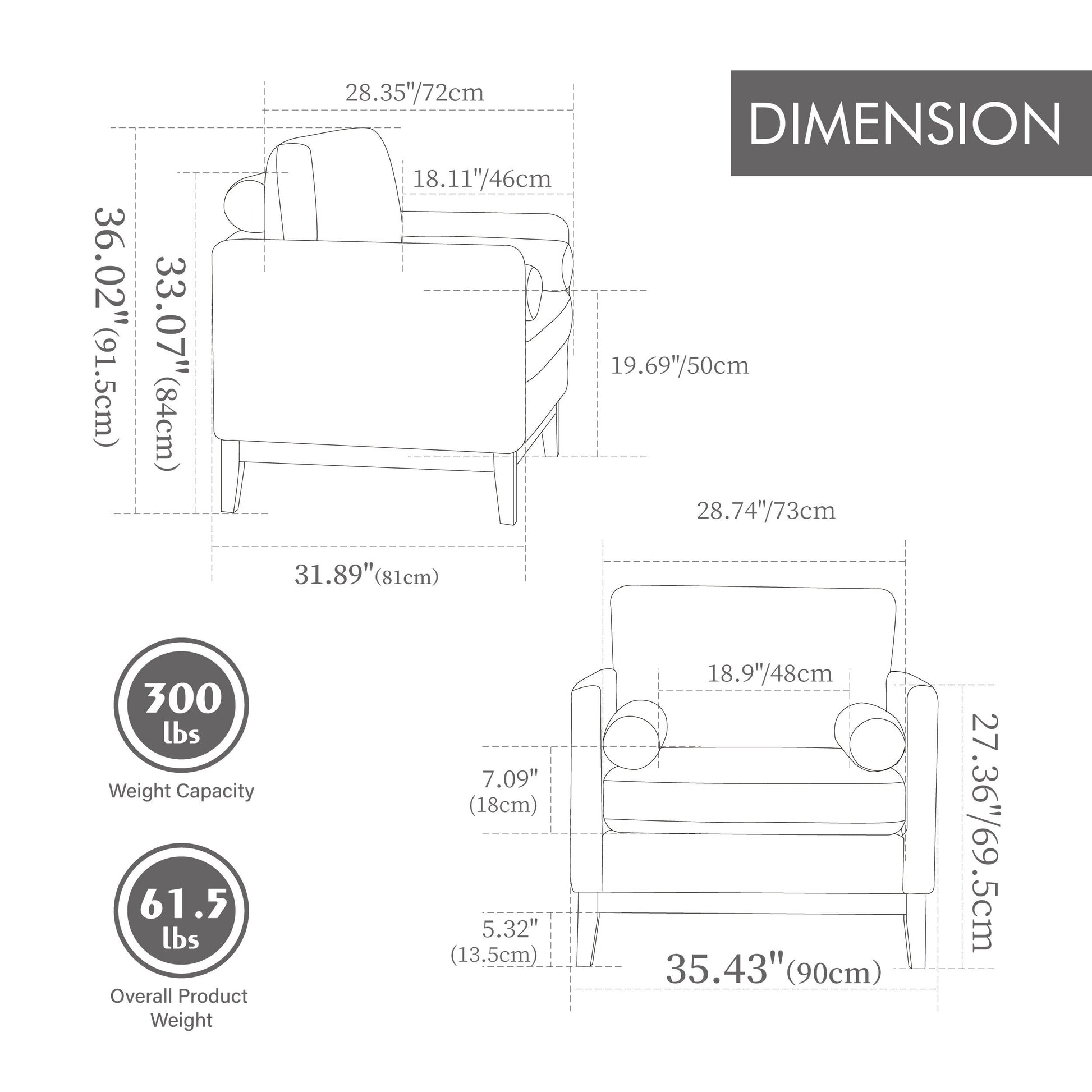 Fauteuil d'appoint large et moderne de style ferme avec pieds en bois naturel, fauteuil simple et canapé avec deux coussins traversins