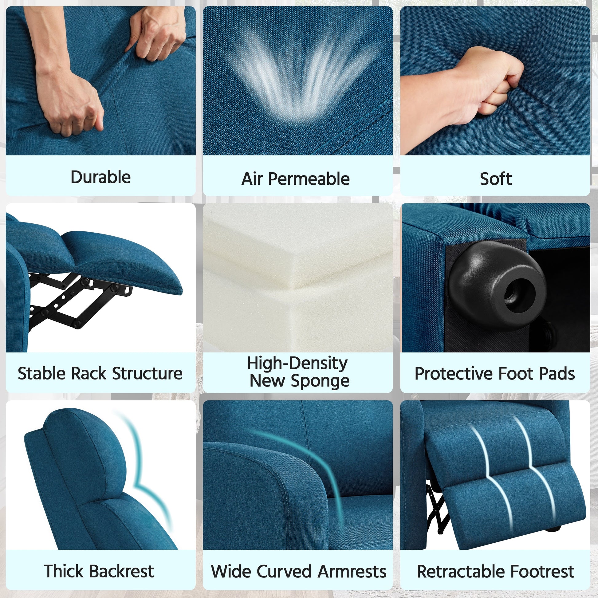 Notre fauteuil inclinable en tissu deviendra votre nouvel accessoire de détente. Fabriqué avec une structure robuste en bois d'ingénierie, un rembourrage en fibres moelleuses, une mousse haute densité, des ressorts ensachés résilients et une housse en polyester durable effet lin, ce fauteuil inclinable allie élégance et longévité. Pouvant supporter jusqu'à 120 kg, sa construction robuste en fera un favori pour les années à venir. Imaginez-vous vous enfoncer dans son assise moelleuse et son dossier moelleux après une longue journée fatigante. Conçu pour dissiper la fatigue, ce fauteuil inclinable offre une détente ultime. C'est comme avoir votre propre oasis de confort dans le salon, la chambre, le home cinéma, le bureau ou n'importe où !